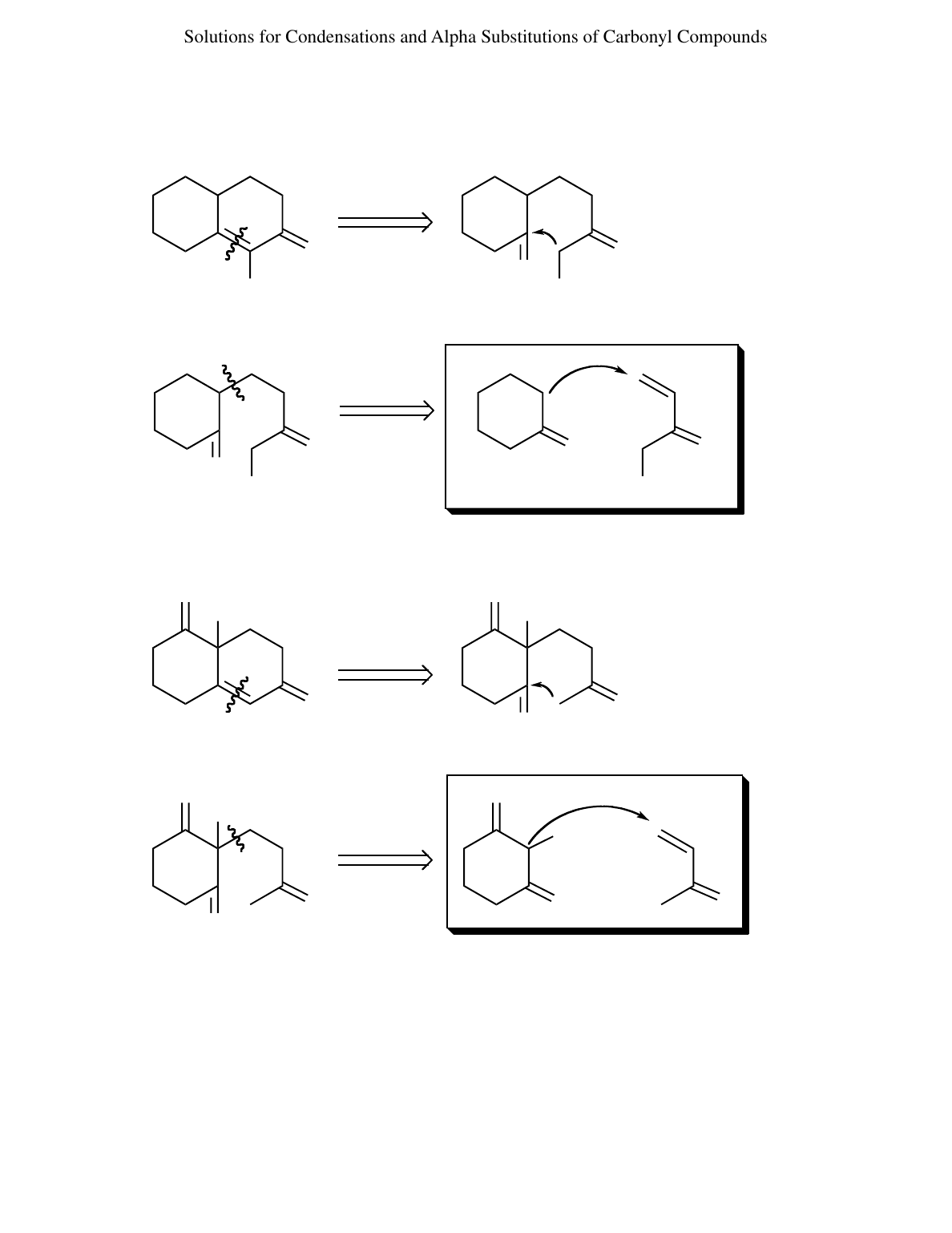 Solutions for Condensations and Alpha Substitutions of Carbonyl Compounds CH3 O O CH3 O CH3 O O O O CH3 O O O CH3 O O CH3 O O O O CH3 O CH3 O Michael addition forms a bond to the β' carbon: α' β' α β (b) Aldol and dehydration form the α,β double bond: β' α' Michael addition forms a bond to the β' carbon: β α (a) Aldol and dehydration form the α,β double bond: 59 The Robinson annulation consists of a Michael addition followed by aldol cyclization with dehydration. In the retrosynthetic direction, disconnect the alkene formed in the aldol/dehydration, then disconnect the Michael addition to discover the reactants. + + 576