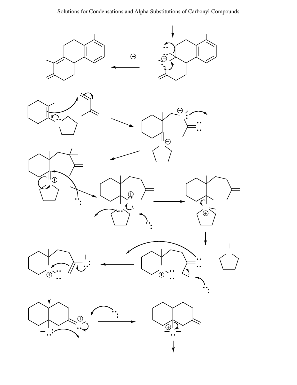 Solutions for Condensations and Alpha Substitutions of Carbonyl Compounds C OMe HO O CH3CH3 O OMe plus one other resonance form (dehydration) – HO from previous page73 (c) continued The negative charge in this structure is stabilized by resonance with the carbonyl. two rapid proton transfers + plus one other resonance form two rapid proton transfers plus one other resonance form two rapid proton transfers N H O H O C N H N O H H O N OH H N H OH O H N C H O C OH O OH H H H O O H O H O H H H (d) H H – H2O H3O+ H2O H3O+ H3O+ H3O+ H2O H2O H2O enol tautomer mechanism continued on next page 588
