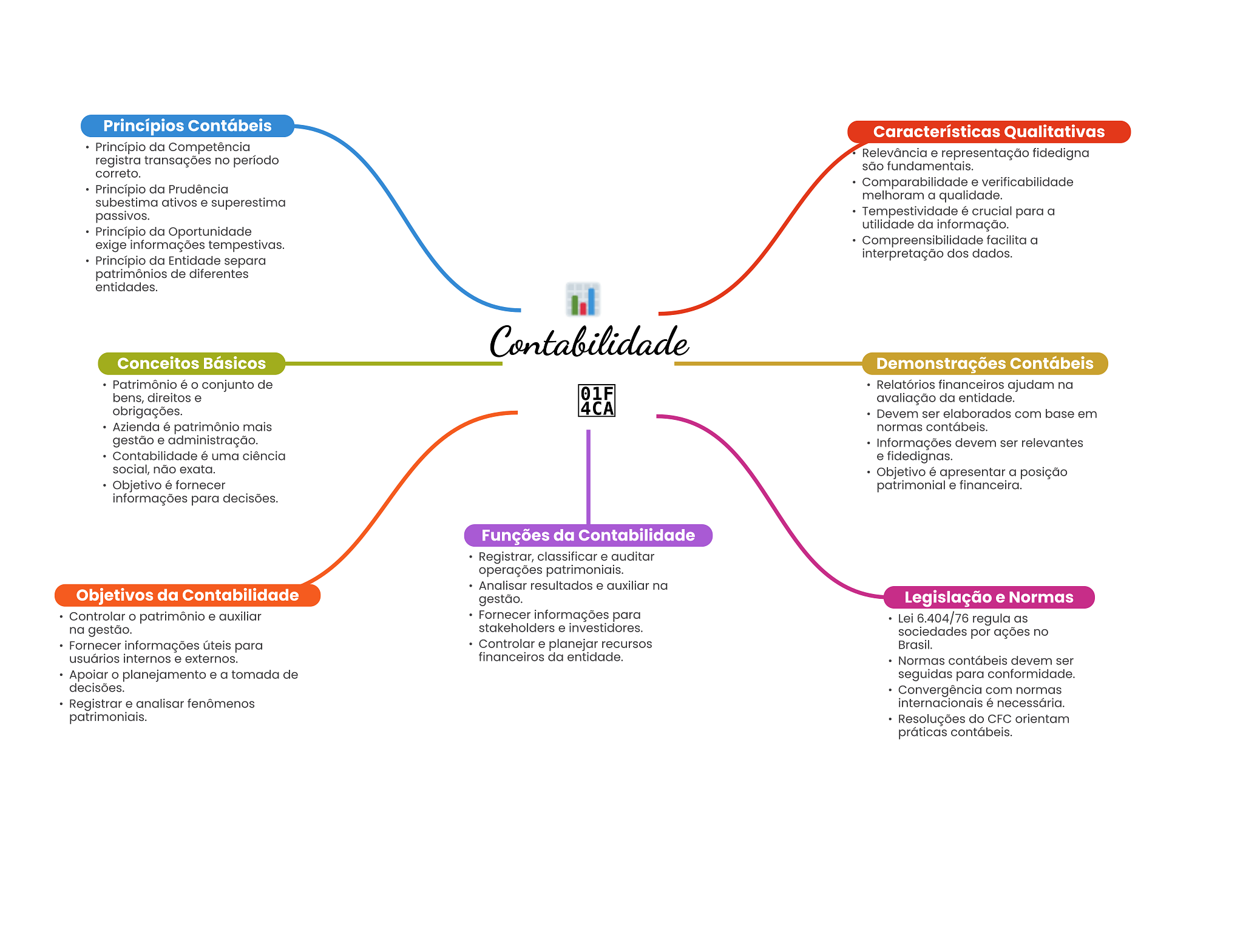Princípios Contábeis Características Qualitativas Princípio da Competência registra transações no período Relevância e representação fidedigna são fundamentais. correto. Comparabilidade e verificabilidade Princípio da Prudência melhoram a qualidade. subestima ativos e superestima passivos. Tempestividade é crucial para a Princípio da Oportunidade utilidade da informação. exige informações tempestivas. Compreensibilidade facilita a interpretação dos dados. Princípio da Entidade separa patrimônios de diferentes entidades. Contabilidade Conceitos Básicos Demonstrações Contábeis Patrimônio é O conjunto de Relatórios financeiros ajudam na bens, direitos e 01F avaliação da entidade. obrigações. 4CA Devem ser elaborados com base em Azienda é patrimônio mais normas contábeis. gestão e administração. Informações devem ser relevantes Contabilidade é uma ciência e fidedignas. social, não exata. Objetivo é apresentar a posição Objetivo é fornecer patrimonial e financeira. informações para decisões. Funções da Contabilidade Registrar, classificar e auditar operações patrimoniais. Analisar resultados e auxiliar na Objetivos da Contabilidade gestão. Legislação e Normas Controlar patrimônio e auxiliar Fornecer informações para Lei 6.404/76 regula as na gestão. stakeholders e investidores. sociedades por ações no Fornecer informações úteis para Controlar e planejar recursos Brasil. usuários internos e externos. financeiros da entidade. Normas contábeis devem ser Apoiar planejamento e a tomada de seguidas para conformidade. decisões. Convergência com normas Registrar e analisar fenômenos internacionais é necessária. patrimoniais. Resoluções do CFC orientam práticas contábeis.
