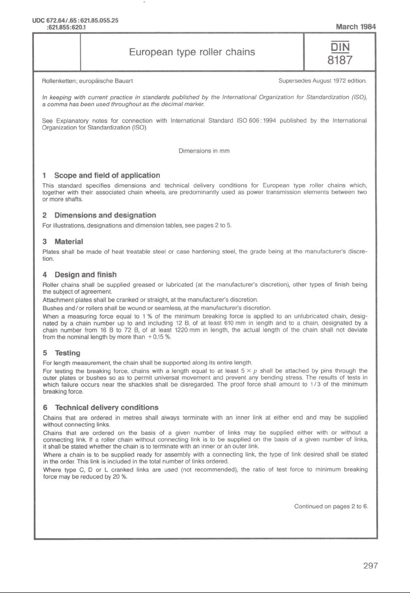 UDC 672.64/.65 621.85.055.25 :621.855:620.1 March 1984 DIN European type roller chains 8187 Rollenketten; europäische Bauart Supersedes August 1972 edition. In keeping with current practice in standards published by the International Organization for Standardization (ISO), a comma has been used throughout as the decimal marker. See Explanatory notes for connection with International Standard ISO 606: 1994 published by the International Organization for Standardization (ISO). Dimensions in mm 1 Scope and field of application This standard specifies dimensions and technical delivery conditions for European type roller chains which, together with their associated chain wheels, are predominantly used as power transmission elements between two or more shafts. 2 Dimensions and designation For illustrations, designations and dimension tables, see pages 2 to 5. 3 Material Plates shall be made of heat treatable steel or case hardening steel, the grade being at the manufacturer's discre- tion. 4 Design and finish Roller chains shall be supplied greased or lubricated (at the manufacturer's discretion), other types of finish being the subject of agreement. Attachment plates shall be cranked or straight, at the manufacturer's discretion. Bushes and/or rollers shall be wound or seamless, at the manufacturer's discretion. When a measuring force equal to 1% of the minimum breaking force is applied to an unlubricated chain, desig- nated by a chain number up to and including 12 B, of at least 610 mm in length and to a chain, designated by a chain number from 16 B to 72 B, of at least 1220 mm in length, the actual length of the chain shall not deviate from the nominal length by more than 5 Testing For length measurement, the chain shall be supported along its entire length. For testing the breaking force, chains with a length equal to at least 5 p shall be attached by pins through the outer plates or bushes so as to permit universal movement and prevent any bending stress. The results of tests in which failure occurs near the shackles shall be disregarded. The proof force shall amount to 1/3 of the minimum breaking force. 6 Technical delivery conditions Chains that are ordered in metres shall always terminate with an inner link at either end and may be supplied without connecting links. Chains that are ordered on the basis of a given number of links may be supplied either with or without a connecting link. If a roller chain without connecting link is to be supplied on the basis of a given number of links, it shall be stated whether the chain is to terminate with an inner or an outer link. Where a chain is to be supplied ready for assembly with a connecting link, the type of link desired shall be stated in the order. This link is included in the total number of links ordered. Where type C, D or L cranked links are used (not recommended), the ratio of test force to minimum breaking force may be reduced by Continued on pages 2 to 6. 297Page 2 DIN 8187 2.1 Simple roller chains Simple roller chains are not expected to conform to the designs illustrated here; compliance is only required in the case of the dimensions specified. h g b₂ b₃ d₁ Designation of a simple roller chain with chain number 10 1: Roller chain DIN 10 B 1 If a 10 m simple roller chain with chain number 10 1 is to be ordered, the order designation shall read: 10 m roller chain DIN 8187 10 1 If five roller chains with 79 links each, terminating at both ends with inner links (B) and with no connecting link, are to be ordered, the order designation shall read: 5 roller chains DIN 8187 - - 10 1 79 B If five roller chains with 100 links each, including a connecting link with spring fastener (E), are to be ordered, the order designation shall read: 5 roller chains DIN 8187 10 B 1 X 100 E Table 1 Minimum Measur- Chain number p b₁ b₂ b₃ d₁ d₂ d₃ 1, breaking ing Bearing Approx. g h k 1) area, in mass, in force, force, cm² in N in N kg/m min. max. min. max. h9 H11 max. min. max. max. 03 5 2,5 4,15 4,25 3,2 1,49 1,52 4,1 4,3 2,5 7,4 22 0,06 0,08 04 6 2,8 4,1 4,2 4 1,85 1,88 5 5,2 2,9 7,4 30 0,08 0,12 05 B 1 8 3 4,77 4,9 5 2,31 2,36 7,1 7,4 3,1 8,6 5 000 50 0,11 0,18 06 B 1 9,525 5,72 8,53 8,66 6,35 3,28 3,33 8,2 8,6 3,3 13,5 90 0,28 0,41 081 12,7 3,3 5,8 5,93 7,75 3,66 3,71 9,9 10,2 1,5 10,2 82 0,21 0,28 082 12,7 2,38 4,6 4,73 7,75 3,66 3,71 9,9 10,2 8,2 100 0,17 0,26 083 12,7 4,88 7,9 8,03 7,75 4,09 4,14 10,3 10,6 1,5 12,9 120 0,32 0,42 084 12,7 4,88 8,8 8,93 7,75 4,09 4,14 11,1 11,5 1,5 14,8 160 0,36 0,59 085 12,7 6,38 9,07 9,2 7,77 3,58 3,63 9,9 10,2 2 14 68 0,32 0,38 08 1 12,7 7,75 11,3 11,43 8,51 4,45 4,5 11,8 12,1 3,9 17 180 0,5 0,70 10 1 15,875 9,65 13,28 13,41 10,16 5,08 5,13 14,7 15 4,1 19,6 22 400 224 0,67 0,95 12 1 19,05 11,68 15,62 15,75 12,07 5,72 5,77 16,1 16,4 4,6 22,7 290 0,89 1,25 16 B 1 25,4 17,02 25,4 25,6 15,88 8,28 8,34 21 21,4 5,4 36,1 600 2,1 2,7 20 B 1 31,75 19,56 29 29,2 19,05 10,19 10,26 26,4 26,7 6,1 43,2 950 2,96 3,6 1 38,1 25,4 37,9 38,2 25,4 14,63 14,71 33,4 33,8 6,6 53,4 160 000 1 600 5,54 6,7 28 1 44,45 30,99 46,5 46,8 27,94 15,9 15,98 37,0 37,5 7,4 65,1 200 000 7,39 8,3 32 B 1 50,8 30,99 45,5 45,8 29,21 17,81 17,9 42,2 42,8 7,9 67,4 250 000 8,1 10,5 40 B 1 63,5 38,1 55,7 56 39,37 22,89 23 52,9 53,5 10 82,6 355 000 12,75 16 48 1 76,2 45,72 70,5 71 48,26 29,24 29,35 63,8 64,6 10 99,1 560 000 20,61 25 56 B 1 88,9 53,34 81,3 82 53,98 34,32 34,43 77,8 78,7 11 114 850 000 27,9 35 64 B - 1 101,6 60,96 92 92,7 63,5 39,4 39,6 90,1 91,1 13 130 1 120 000 36,25 60 72 1 114,3 68,58 103,8 104,5 72,39 44,5 44,7 103,6 104,7 14 147 1 400 000 46,19 80 Pin projecting length for connecting link. 298DIN 8187 Page 3 2.2 Duplex roller chains Duplex roller chains are not expected to conform to the designs illustrated here; compliance is only required in the case of the dimensions specified. h e g b₂ b₃ d₁ Designation of a duplex roller chain with chain number 10 B 2: Roller chain DIN 10 B - 2 If a 10 m duplex roller chain