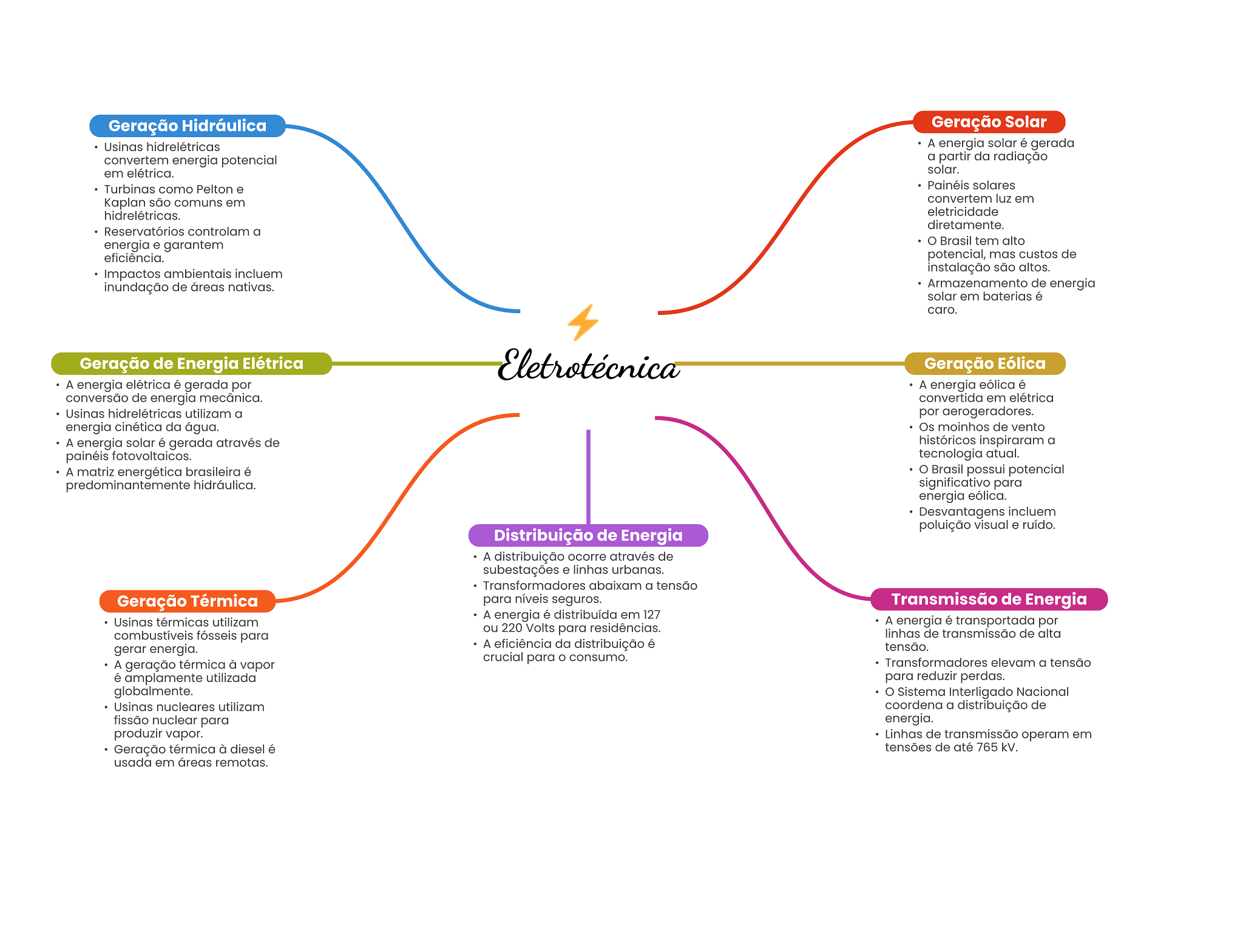 Geração Hidráulica Geração Solar Usinas hidrelétricas A energia solar é gerada convertem energia potencial a partir da radiação em elétrica. solar. Turbinas como Pelton e Painéis solares Kaplan são comuns em convertem luz em hidrelétricas. eletricidade diretamente. Reservatórios controlam a energia e garantem Brasil tem alto eficiência. potencial, mas custos de Impactos ambientais incluem instalação são altos. inundação de áreas nativas. Armazenamento de energia solar em baterias é caro. Geração de Energia Elétrica Eletrotécnica Geração Eólica A energia elétrica é gerada por A energia eólica é conversão de energia mecânica. convertida em elétrica Usinas hidrelétricas utilizam a por aerogeradores. energia cinética da água. Os moinhos de vento A energia solar é gerada através de históricos inspiraram a painéis fotovoltaicos. tecnologia atual. A matriz energética brasileira é Brasil possui potencial predominantemente hidráulica. significativo para energia eólica. Desvantagens incluem poluição visual e ruído. Distribuição de Energia A distribuição ocorre através de subestações e linhas urbanas. Transformadores abaixam a tensão Geração Térmica para níveis seguros. Transmissão de Energia Usinas térmicas utilizam A energia é distribuída em 127 A energia é transportada por ou 220 Volts para residências. combustíveis fósseis para linhas de transmissão de alta gerar energia. A eficiência da distribuição é tensão. crucial para O consumo. A geração térmica à vapor Transformadores elevam a tensão é amplamente utilizada para reduzir perdas. globalmente. Sistema Interligado Nacional Usinas nucleares utilizam coordena a distribuição de fissão nuclear para energia. produzir vapor. Linhas de transmissão operam em Geração térmica à diesel é tensões de até 765 kV. usada em áreas remotas.