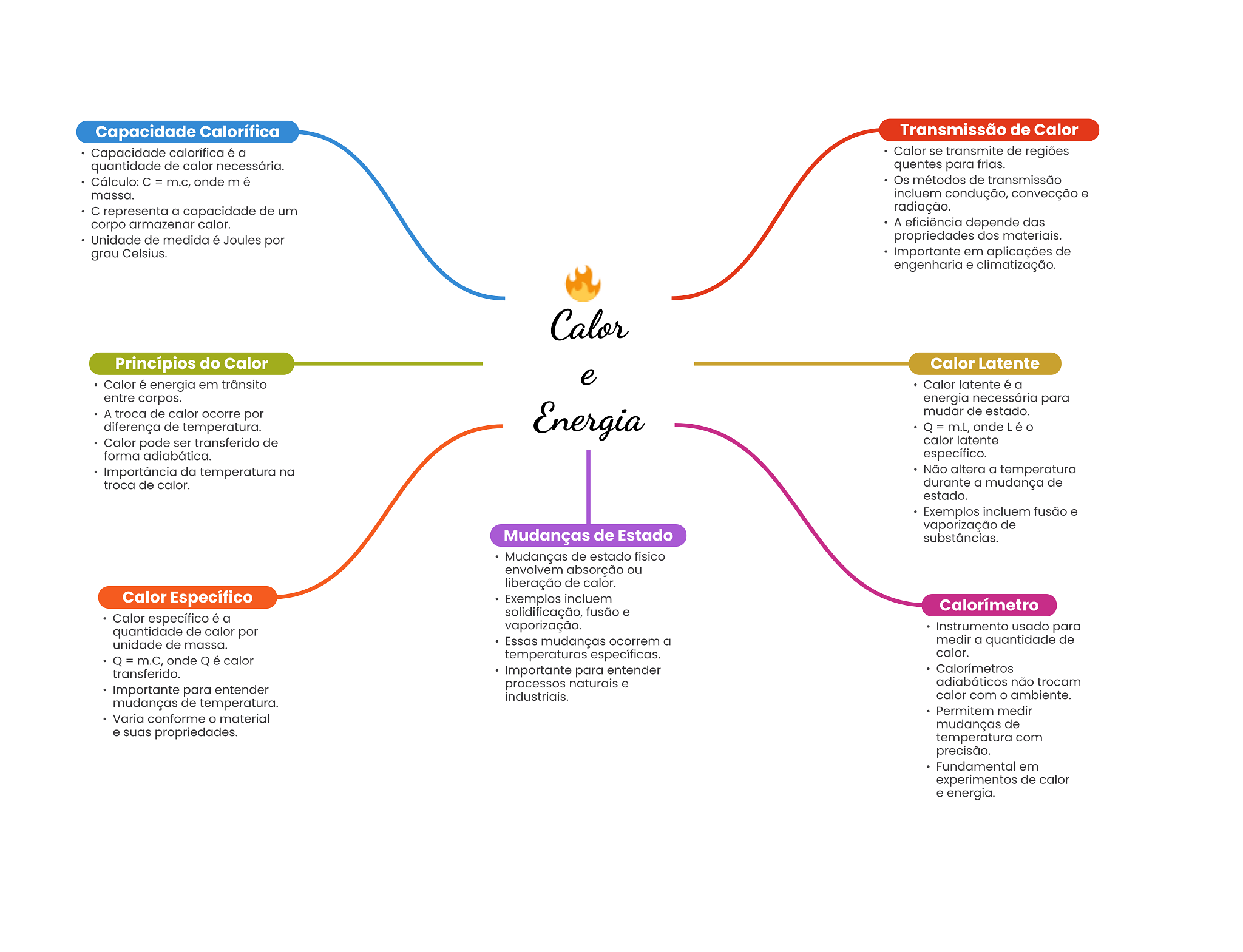Capacidade Calorífica Transmissão de Calor Capacidade calorífica é a Calor se transmite de regiões quantidade de calor necessária. quentes para frias. Cálculo: = m.c, onde mé Os métodos de transmissão massa. incluem condução, convecção e representa a capacidade de um radiação. corpo armazenar calor. A eficiência depende das Unidade de medida é Joules por propriedades dos materiais. grau Celsius. Importante em aplicações de engenharia e climatização. Calor Princípios do Calor Calor Latente Calor é energia em trânsito e Calor latente é a entre corpos. energia necessária para A troca de calor ocorre por Energia mudar de estado. diferença de temperatura. Q = m.L, onde O Calor pode ser transferido de calor latente forma adiabática. específico. Importância da temperatura na Não altera a temperatura troca de calor. durante a mudança de estado. Exemplos incluem fusão e vaporização de Mudanças de Estado substâncias. Mudanças de estado físico envolvem absorção ou liberação de calor. Calor Específico Exemplos incluem Calorímetro Calor específico é a solidificação, fusão e quantidade de calor por vaporização. Instrumento usado para unidade de massa. Essas mudanças ocorrem a medir a quantidade de Q = m.C, onde Q é calor temperaturas específicas. calor. transferido. Importante para entender Calorímetros processos naturais e adiabáticos não trocam Importante para entender industriais. calor com O ambiente. mudanças de temperatura. Permitem medir Varia conforme material mudanças de e suas propriedades. temperatura com precisão. Fundamental em experimentos de calor e energia.