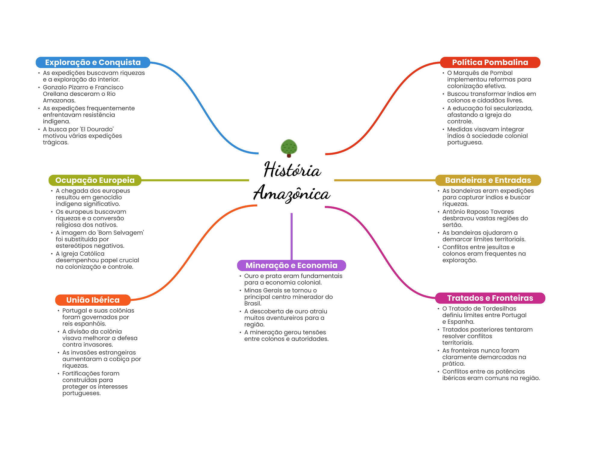 Exploração e Conquista Política Pombalina As expedições buscavam riquezas Marquês de Pombal e a exploração do interior. implementou reformas para Gonzalo Pizarro e Francisco colonização efetiva. Orellana desceram Rio Buscou transformar índios em Amazonas. colonos e cidadãos livres. As expedições frequentemente A educação foi secularizada, enfrentavam resistência afastando a Igreja do indígena. controle. A busca por 'El Dourado' Medidas visavam integrar motivou várias expedições índios à sociedade colonial trágicas. portuguesa. História Ocupação Europeia Bandeiras e Entradas A chegada dos europeus Amazônica As bandeiras eram expedições resultou em genocídio para capturar e buscar indígena significativo. riquezas. Os europeus buscavam Antônio Raposo Tavares riquezas e a conversão desbravou vastas regiões do religiosa dos nativos. sertão. A imagem do 'Bom Selvagem As bandeiras ajudaram a foi substituída por demarcar limites territoriais. estereótipos negativos. Conflitos entre jesuítas e A Igreja Católica colonos eram frequentes na desempenhou papel crucial exploração. na colonização e controle. Mineração e Economia Ouro e prata eram fundamentais para a economia colonial. Minas Gerais se tornou União Ibérica principal centro minerador do Tratados e Fronteiras Brasil. Portugal e suas colônias A descoberta de ouro atraiu O Tratado de Tordesilhas foram governados por muitos aventureiros para a definiu limites entre Portugal reis espanhóis. região. e Espanha. A divisão da colônia A mineração gerou tensões Tratados posteriores tentaram visava melhorar a defesa entre colonos e autoridades. resolver conflitos contra invasores. territoriais. As invasões estrangeiras As fronteiras nunca foram aumentaram a cobiça por claramente demarcadas na riquezas. prática. Fortificações foram Conflitos entre as potências construídas para ibéricas eram comuns na região. proteger interesses portugueses.