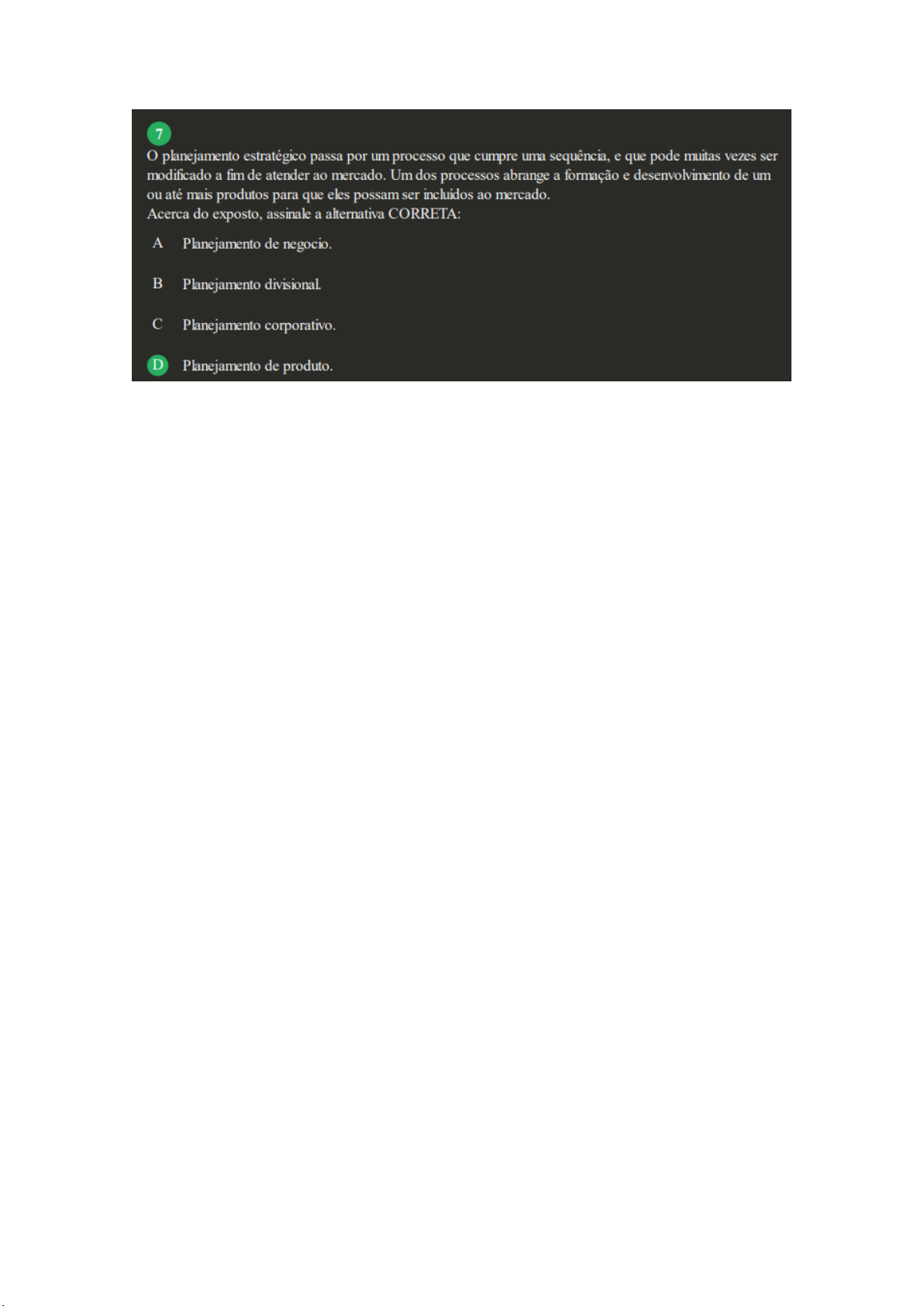 7 planejamento estratégico passa por um processo que cumpre uma sequência, e que pode muitas vezes ser modificado a fim de atender ao mercado. Um dos processos abrange a formação e desenvolvimento de um ou até mais produtos para que eles possam ser incluídos ao mercado. Acerca do exposto, assinale a alternativa CORRETA: A Planejamento de negocio. B Planejamento divisional. C Planejamento corporativo. D Planejamento de produto.