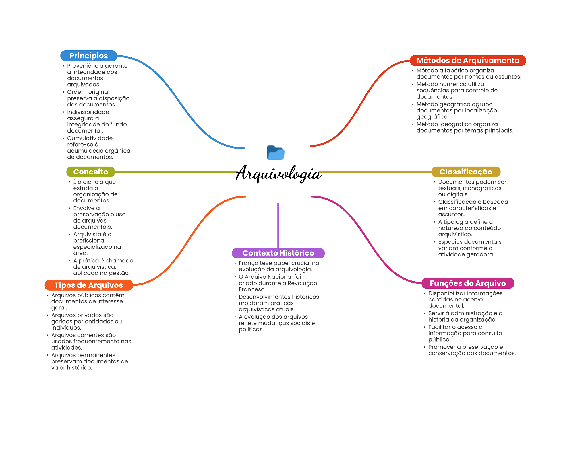 Princípios Métodos de Arquivamento Proveniência garante a integridade dos Método alfabético organiza documentos documentos por nomes ou assuntos. arquivados. Método numérico utiliza Ordem original para controle de preserva a disposição documentos. dos documentos. Método geográfico agrupa Indivisibilidade documentos por localização assegura a geográfica. integridade do fundo Método ideográfico organiza documental. documentos por temas principais. Cumulatividade refere-se à acumulação orgânica de documentos. Conceito Arquivologia Classificação É a ciência que Documentos podem ser estuda a textuais, iconográficos organização de ou digitais. documentos. Classificação é baseada Envolve a em características e preservação e uso assuntos. de arquivos A tipologia define a documentais. natureza do conteúdo Arquivista é arquivístico. profissional Espécies documentais especializado na variam conforme a área. Contexto Histórico atividade geradora. A prática é chamada França teve papel crucial na de arquivística, evolução da arquivologia. aplicada na gestão. Arquivo Nacional foi Tipos de Arquivos criado durante a Revolução Funções do Arquivo Francesa. Arquivos públicos contêm Desenvolvimentos históricos Disponibilizar informações documentos de interesse contidas no acervo moldaram práticas geral. documental. arquivísticas atuais. Arquivos privados são Servir à administração e à A evolução dos arquivos geridos por entidades ou história da organização. reflete mudanças sociais e indivíduos. políticas. Facilitar acesso à Arquivos correntes são informação para consulta usados frequentemente nas pública. atividades. Promover a preservação e Arquivos permanentes conservação dos documentos. preservam documentos de valor histórico.