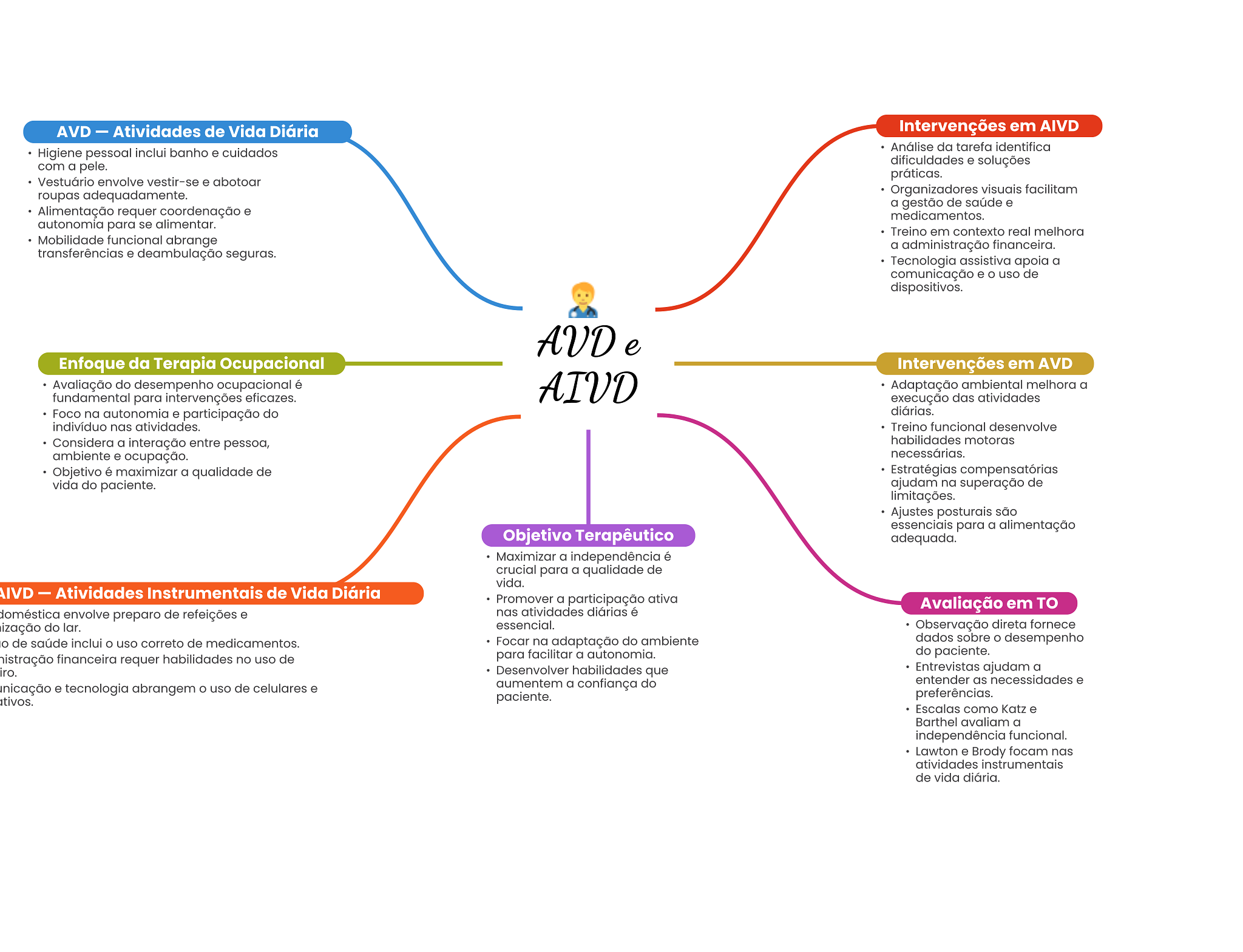 AVD Atividades de Vida Diária Intervenções em AIVD Análise da tarefa identifica Higiene pessoal inclui banho e cuidados com a pele. dificuldades e soluções práticas. Vestuário envolve vestir-se e abotoar roupas adequadamente. Organizadores visuais facilitam a gestão de saúde e Alimentação requer coordenação e medicamentos. autonomia para se alimentar. Treino em contexto real melhora Mobilidade funcional abrange a administração financeira. transferências e deambulação seguras. Tecnologia assistiva apoia a comunicação e O uso de dispositivos. AVD e Enfoque da Terapia Ocupacional Intervenções em AVD Avaliação do desempenho ocupacional é fundamental para intervenções eficazes. AIVD Adaptação ambiental melhora a execução das atividades Foco na autonomia e participação do diárias. indivíduo nas atividades. Treino funcional desenvolve Considera a interação entre pessoa, habilidades motoras ambiente e ocupação. necessárias. Objetivo é maximizar a qualidade de Estratégias compensatórias vida do paciente. ajudam na superação de limitações. Ajustes posturais são essenciais para a alimentação Objetivo Terapêutico adequada. Maximizar a independência é crucial para a qualidade de vida. Atividades Instrumentais de Vida Diária Promover a participação ativa nas atividades diárias é Avaliação em TO doméstica envolve preparo de refeições e ização do lar. essencial. Observação direta fornece de saúde inclui uso correto de medicamentos. Focar na adaptação do ambiente dados sobre desempenho para facilitar a autonomia. do paciente. histração financeira requer habilidades no uso de Desenvolver habilidades que Entrevistas ajudam a aumentem a confiança do entender as necessidades e inicação e tecnologia abrangem uso de celulares e tivos. paciente. preferências. Escalas como Katz e Barthel avaliam a independência funcional. Lawton e Brody focam nas atividades instrumentais de vida diária.