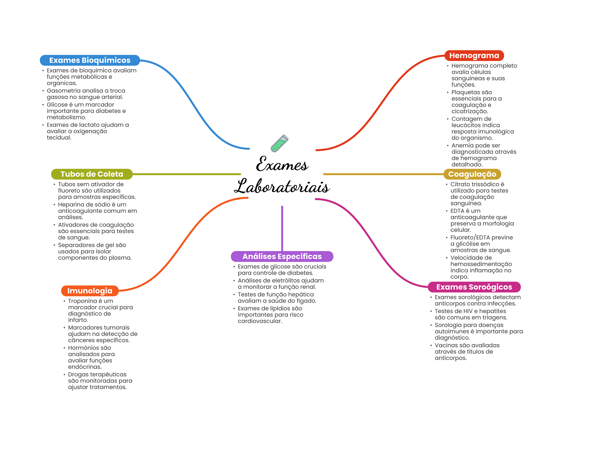 Exames Bioquímicos Hemograma Hemograma completo Exames de bioquímica avaliam avalia células funções metabólicas e sanguíneas e suas organicas. funções. Gasometria analisa a troca Plaquetas são gasosa no sangue arterial. essenciais para a Glicose é um marcador coagulação e importante para diabetes e cicatrização. metabolismo. Contagem de Exames de lactato ajudam a leucócitos indica avaliar a oxigenação resposta imunológica tecidual. do organismo. Anemia pode ser diagnosticada através Exames de hemograma detalhado. Tubos de Coleta Coagulação Tubos sem ativador de fluoreto são utilizados Laboratoriais Citrato trissódico é utilizado para testes para amostras específicas. de coagulação Heparina de sódio é um sanguínea. anticoagulante comum em EDTA é um análises. anticoagulante que Ativadores de coagulação preserva a morfologia são essenciais para testes celular. de sangue. Fluoreto/EDTA previne Separadores de gel são a glicólise em usados para isolar amostras de sangue. componentes do plasma. Análises Específicas Velocidade de Exames de glicose são cruciais hemossedimentação para controle de diabetes. indica inflamação no corpo. Análises de eletrólitos ajudam a monitorar a função renal. Imunologia Exames Soroógicos Testes de função hepática Exames sorológicos detectam Troponina é um avaliam a saúde do anticorpos contra infecções. marcador crucial para Exames de lipídios são diagnóstico de Testes de HIV e hepatites importantes para risco infarto. são comuns em triagens. cardiovascular. Marcadores tumorais Sorologia para doenças ajudam na detecção de autoimunes é importante para cânceres específicos. diagnóstico. Hormônios são Vacinas são avaliadas através de títulos de analisados para avaliar funções anticorpos. endócrinas. Drogas terapêuticas são monitoradas para ajustar tratamentos.