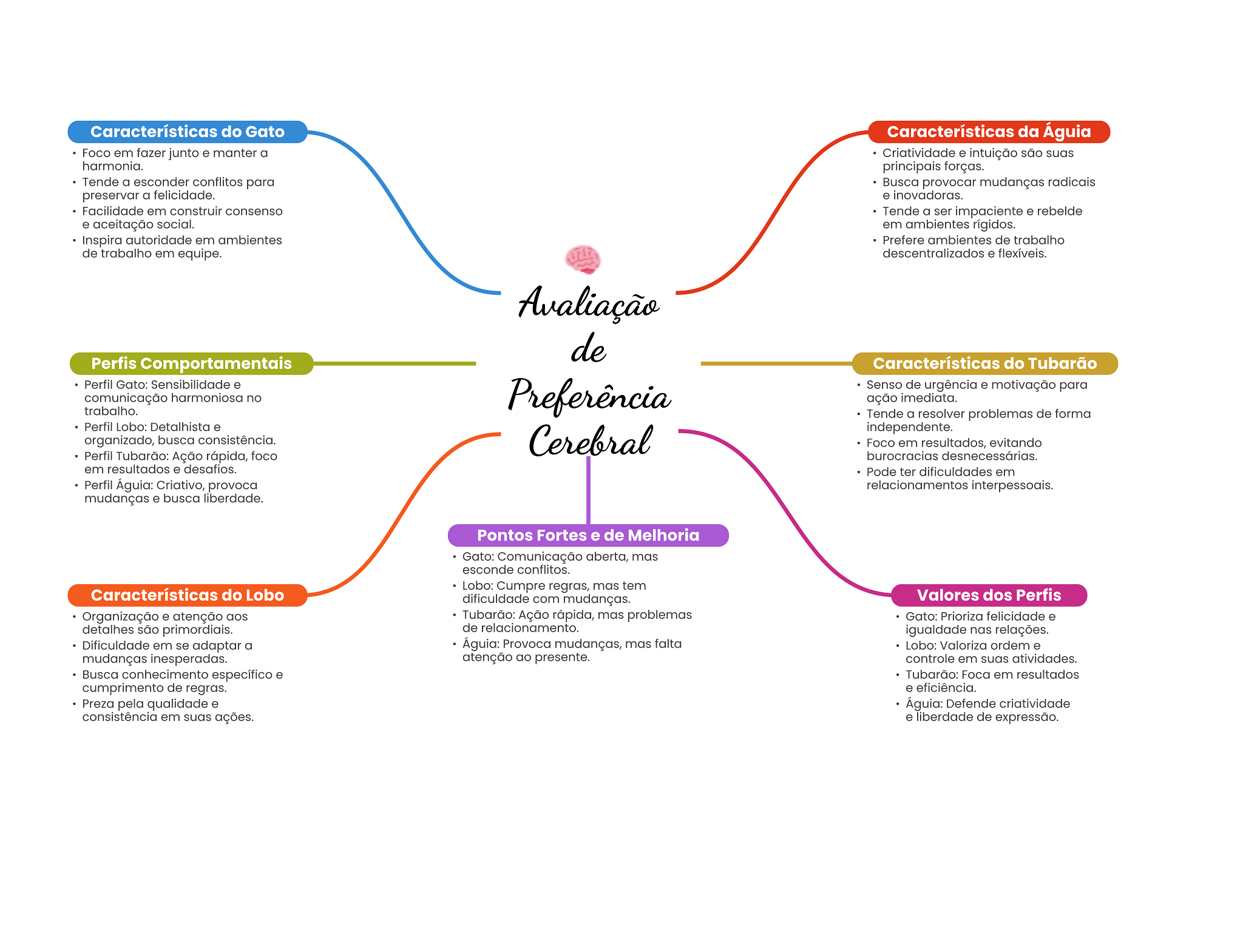 Características do Gato Características da Águia Foco em fazer junto e manter a Criatividade e intuição são suas harmonia. principais forças. Tende a esconder conflitos para Busca provocar mudanças radicais preservar a felicidade. e inovadoras. Facilidade em construir consenso Tende a ser impaciente e rebelde e aceitação social. em ambientes rígidos. Inspira autoridade em ambientes Prefere ambientes de trabalho de trabalho em equipe. e flexíveis. Avaliação de Perfis Comportamentais Características do Tubarão Perfil Gato: Sensibilidade e comunicação harmoniosa no trabalho. Preferência Senso de urgência e motivação para ação imediata. Tende a resolver problemas de forma Perfil Lobo: Detalhista e organizado, busca consistência. Cerebral independente. Foco em resultados, evitando Perfil Tubarão: Ação rápida, foco burocracias desnecessárias. em resultados e desafios. Pode ter dificuldades em Perfil Águia: Criativo, provoca relacionamentos interpessoais. mudanças e busca liberdade. Pontos Fortes e de Melhoria Gato: Comunicação aberta, mas esconde conflitos. Lobo: Cumpre regras, mas tem Características do Lobo dificuldade com mudanças. Valores dos Perfis Organização e atenção aos Tubarão: Ação rápida, mas problemas Gato: Prioriza felicidade e detalhes são primordiais. de relacionamento. igualdade nas relações. Dificuldade em se adaptar a Águia: Provoca mudanças, mas falta Lobo: Valoriza ordem e mudanças inesperadas. atenção ao presente. controle em suas atividades. Busca conhecimento específico e Tubarão: Foca em resultados cumprimento de regras. e eficiência. Preza pela qualidade e Águia: Defende criatividade consistência em suas ações. e liberdade de expressão.