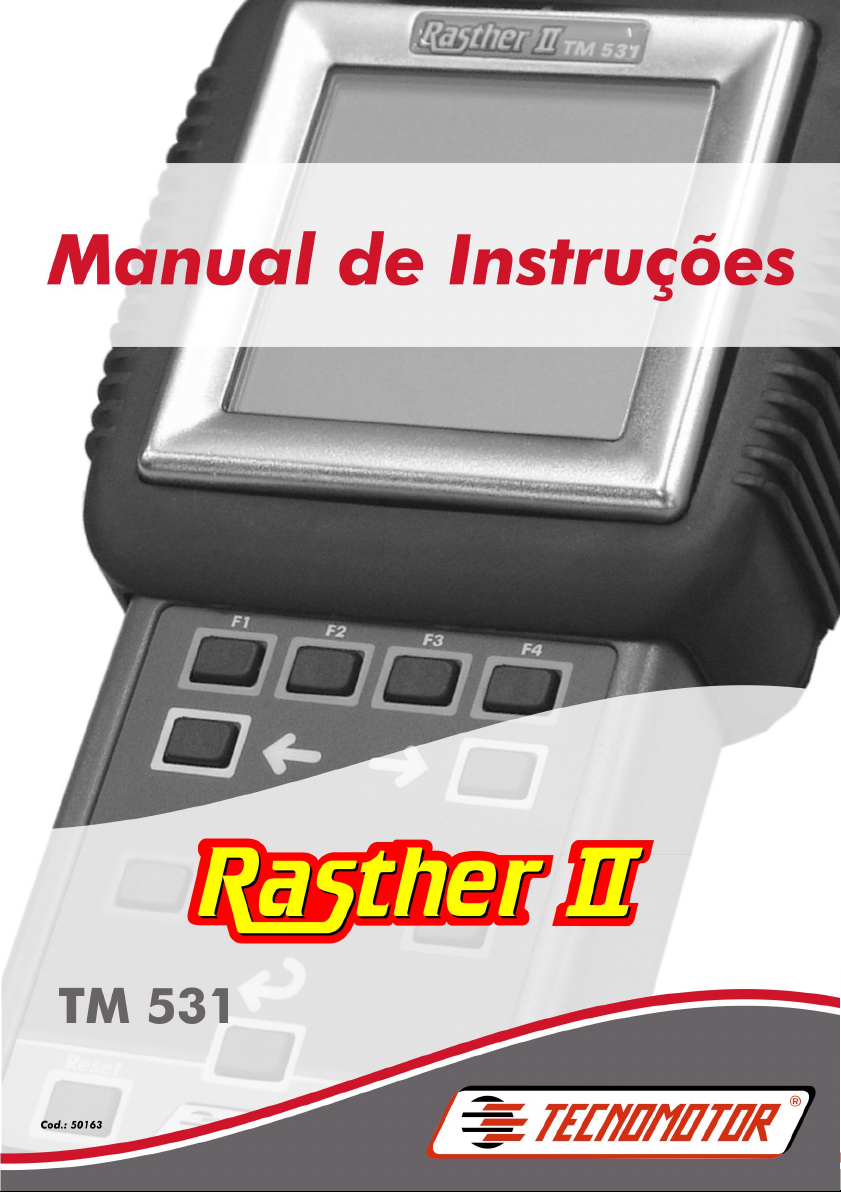 Produzido por Tecnomotor Eletrônica do Brasil S/A - REPRODUÇÃO PROIBIDA - Eventuais erros ou defeitos favor comunicar tecnomotor@tecnomotor.com.br 1 Manual de Instruções - TM 531 Índice Garantia e cobertura 2 Orientação de segurança Tecnomotor 3 Apresentação 11 Aparelho 12 Acessórios 13 Operação 14 Teste 19 Configuração do modem 25 Habilitação de montadoras 26 Atualização da versão 27 Análise gráfica 32 Impressão 33 Apagamento da memória 38 Identificação da ECU 39 Instalação do Rasther USB 40 Observações importantes 45 REV. 10/2012 Produzido por Tecnomotor Eletrônica do Brasil S/A - REPRODUÇÃO PROIBIDA - Eventuais erros ou defeitos favor comunicar tecnomotor@tecnomotor.com.br 2 Manual de Instruções - TM 531 Garantia e cobertura Aplicável á todas as famílias de equipamentos. A garantia não cobre danos ocasionados por situações fortuitas, acidentes, utilização indevida, abusos, negligência ou modificação do equipamento ou de qualquer parte do mesmo por pessoas não autorizadas. A garantia não cobre danos causados por instalação e/ou operação indevida, ou tentativa de reparo por pessoas não autorizadas pela Tecnomotor. Em nenhuma circunstância, a responsabilidade da Tecnomotor irá exceder o custo original do equipamento adquirido, como também não irá cobrir danos conseqüentes, incidentais ou colaterais. A Tecnomotor reserva-se o direito de inspecionar todo e qualquer equipamento envolvido no caso de solicitação de serviços de garantia. As decisões de reparos ou substituição são feitas a critério da Tecnomotor ou por pessoas por ela autorizadas. O conserto ou substituição conforme previsto nesta garantia constitui-se na única compensação ao consumidor. A Tecnomotor não será responsável por quaisquer danos incidentais ou conseqüentes originadas pelo mau uso dos equipamentos de sua fabricação. Produzido por Tecnomotor Eletrônica do Brasil S/A - REPRODUÇÃO PROIBIDA - Eventuais erros ou defeitos favor comunicar tecnomotor@tecnomotor.com.br 3 Manual de Instruções - TM 531 Orientação de segurança Tecnomotor 1. Símbolos utilizados 1.1 Documentação Os pictogramas que surgem junto com palavras de advertência de perigo, aviso e cuidado são, por norma, indicações de aviso, chamando sempre a atenção para um perigo iminente ou possível para o usuário. Perigo! Perigo iminente que pode causar ferimentos corporais graves ou a morte. Aviso! Possível situação de perigo que pode causar ferimentos corporais graves ou a morte. Cuidado! Possível situação de perigo que pode causar ferimentos corporais ligeiros ou provocar danos materiais elevados. !!!! Atenção! - alerta para possíveis situações de perigo que podem danificar o Test Equipment, o provete ou algo que se encontre nas imediações. Além destas indicações de aviso, são ainda utilizados os seguintes símbolos: i Informação - instruções de utilização e outras informações úteis. %%%% Proposta de atuação de passo único - proposta de atuação composta apenas por um passo. 3333 Resultado intermédio - no decorrer de uma proposta de atuação é visível um resultado intermédio. → Resultado final - o resultado final fica visível no fim de uma proposta de atuação. 1.2 Produto Os símbolos ostentados no produto são explicados no respectivo manual de instruções. Produzido por Tecnomotor Eletrônica do Brasil S/A - REPRODUÇÃO PROIBIDA - Eventuais erros ou defeitos favor comunicar tecnomotor@tecnomotor.com.br 4 Manual de Instruções - TM 531 2. Notas importantes i � Antes da colocação em funcionamento, da ligação e da operação dos aparelhos de produtos Tecnomotor, é estritamente necessário ler a documentação fornecida com o produto, prestando especial atenção às instruções de segurança. Dessa forma, para a sua própria segurança e para evitar danos no aparelho, elimina a priori incertezas quanto ao manuseamento do produto da Tecnomotor e a respeito dos riscos daí decorrentes. Ao passar um produto Tecnomotor a terceiros, tenha o cuidado de incluir a respectiva documentação. 2.1 Grupo de utilizadores O produto só pode ser usado por pessoal qualificado e instruído na matéria. O pessoal que se encontre em formação, aprendizagem, instrução ou a participar numa acção de formação geral, só poderá operar o produto sob a supervisão permanente de uma pessoa experiente. Todos os trabalhos nos dispositivos eléctricos e hidráulicos só podem ser executados por pessoas com conhecimentos e experiência adequados no domínio dos sistemas eléctricos e hidráulicos. 2.2 Declaração A utilização do produto implica a aceitação tácita das seguintes disposições: Direitos de autor O software e os dados são propriedade da Tecnomotor ou dos seus fornecedores, estando protegidos contra reprodução pela lei dos direitos de autor, acordos internacionais e demais legislação nacional. Não é permitida a reprodução ou publicação, mesmo que parcial, dos dados e do software, sendo qualquer infracção a este nível punida por lei. A Tecnomotor reserva-se o direito de iniciar um procedimento criminal contra os prevaricadores e de exigir destes indemnização por perdas e danos. Responsabilidade Todos os dados do presente programa baseiam-se, tanto quanto possível, nos dados do fabricante e do importador. A Tecnomotor não garante a precisão e integralidade do software e dos dados. Está excluída a responsabilidade por danos resultantes de erros no software e nos dados. A responsabilidade da Tecnomotor limita-se efectivamente ao valor real que o cliente despendeu na aquisição do produto. Esta exclusão de responsabilidade não se aplica aos danos causados por dolo ou negligência grave por parte da Tecnomotor. Produzido por Tecnomotor Eletrônica do Brasil S/A - REPRODUÇÃO PROIBIDA - Eventuais erros ou defeitos favor comunicar tecnomotor@tecnomotor.com.br 5 Manual de Instruções - TM 531 Garantia A util