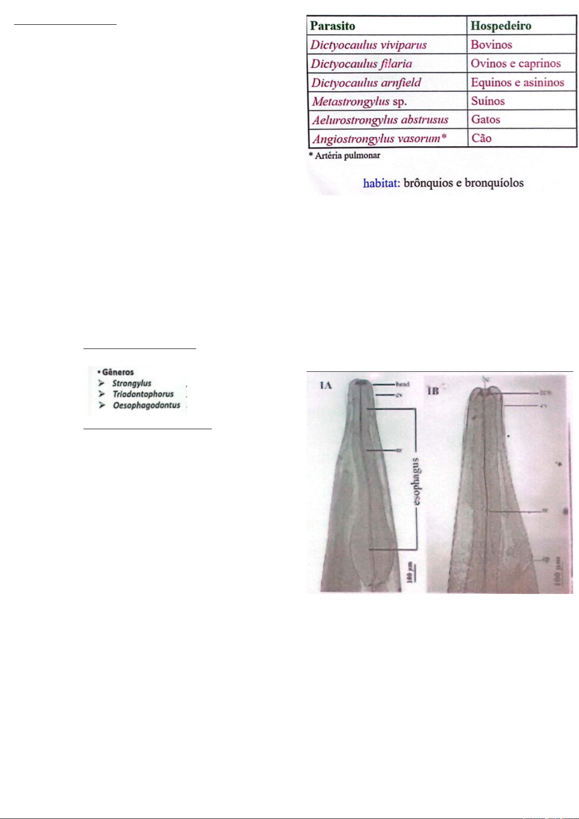 Classe: NEMATODA Ordem Strongylida (macho possui bolsa copuladora) · Superfamília: Strongyloidea Família: Metastrongylidae – Dictyocaulus sp. –Metastrongylus sp. –Aelurostrongylus sp. – Angiostrongylus sp. Família: Syngamidae –Syngamus sp., Mammomonogamus sp. Família: Stephanuridae –Stephanurus sp. —----------------------------------------------------------- Não confundir (nomes parecidos): Superfamília Strongyloidea · Família strongylidae · Subfamília Strongylinae (grandes estrôngilos) · Subfamília cyathostominae (pequenos estrôngilos) · Família Cloacinidae · Oesophagostomum · Família Chabertiidae · Chabertia Superfamília Rhabditoidea Famílias Strongyloididae Gênero: Strongyloides (larva rabditóide e filarióide) —-------------------------------------------------------------------- Família: Metastrongylidae—------------------ VERMINOSE PULMONAR Características Morfológicas · corpo filiforme: corpo alongado, fino · boca com ou sem lábios · ausência de coroa radiada · porte médio (muitos variam de 2 a 8 cm de comprimento). · presença de bolsa copuladora: estrutura na cauda do macho, usada para se prender à fêmea durante a cópula · ciclo direto: Dictyocaulus · ciclo indireto: demais DICTYOCAULUS SP · Verme pulmonar de ruminantes e equinos · Boca com 4 lábios · bolsa copulatória pequena · Habitat brônquios e bronquíolos Vermes na Traqueia : Resistência do verme à antiparasitários usados comumente →alerta para mudança das práticas de controle e manejo. · A solução pode esta sendo a associacao de parasitários para melhor eficiência · Levamisol → medicamento para vermes pulmonares Animais jovens (bezerros) tendem a ter maior taxa de mortalidade pela sua baixa imunidade. Sinais clínicos evidentes de parasita pulmonar → TOSSE e DIFICULDADE RESPIRATÓRIA Respiração abdominal→ algo está errado Atenção: · carneiro espirrando → larva de mosca nas cavidades · carneiro tossindo → verme pulmonar no trato respiratório Morfologia adulto · 4-5 cm · Brancos: quando observado no hospedeiro ou fresco · Machos com espículos curtos e achatados: · Espículos: aparecem agulhas, usados para abrir o poro genital da fêmea e guiar os espermatozoides durante a cópula. · Raio dorsal trilobado (dividido em 3 pontas): · Raio dorsal: É um feixe de nervos que sustenta a porção dorsal da bolsa copuladora · fêmea ovovivípara (coloca ovos contendo larvas) Ciclo (direto) Ingestão de L3 pelo hospedeiro (pasto)→penetra na mucosa intestinal → circulação linfática → linfonodos mesentéricos (L3 →L4) → circulação linfática → ducto torácico → circulação sistêmica→ passa pelo fígado ou não → coração → pulmão → parênquima (L4 → L5) → brônquios e bronquíolos → maturação sexual de L5 → adulto → ovos →ovos ou as larvas já eclodidas sobe pelo trato aéreo superior (movimentos ciliares) → liberadas nas secreções (tosse,saliva) ou deglutidas→ larvas ou ovos larvados nas fezes · A taxa de eclosão ou não do ovo depende do hospedeiro definitivo · Os vermes adultos eliminam ovos larvados, porém na maioria das vezes esses ovos eclodem ainda no trato respiratório ou TGI, saindo nas fezes as larvas · Ovos liberados no ambiente junto às secreções ou às fezes · No ambiente ocorrem a eclosão dos ovos ou já diretamente as mudas (no caso de já ter larva nas fezes) · Pode ter aspiração (do parênquima pulmonar para o trato aéreo superior → tosse ou movimento ciliar) de: · adultos mortos · L1 (larva já eclodida) · Ovos ( pequena quantidade → eclosão quase imediata à postura) FEZES DE BOVINOS: larvas (ovo já eclodido) FEZES DE EQUINOS: ovos larvados OVOS: ovos larvados de Dictyocaulus sp tem grânulos periféricos LARVAS: · contém grânulos · movimentação lenta (quase sem motilidade): pesada,lenta, gorda · cauda achatada · tem botão esférico na extremidade anterior: importante para diagnóstico (tanto a L1 e L3 tem) · dispersão: → Chuvas → Consistência das fezes:Fezes mais moles e úmidas facilitam a saída da larva do bolo fecal → Clima frio: O clima frio (ou ameno) e a alta umidade (como o orvalho) são ideais para a sobrevivência e mobilidade das larvas no pasto, pois evitam a desidratação. → Fatores mecânicos: fungo do gênero Pilobolus · O Pilobolus cresce sobre as fezes de ruminantes. · As larvas do Dictyocaulus sobem pela haste do fungo · O mecanismo principal de dispersão é a "explosão dos esporângios" (a parte superior do fungo). O fungo lança seus esporos violentamente para longe, e, junto com eles, as larvas de L3 são projetadas a longas distâncias, caindo em pastagens → Mostra uma larva subindo a árvore brônquica. → essa migração pode acarretar · Bronquite Parasitária: inflamação devido a migração · Exsudato mucoso com presença de eosinófilos: A grande presença desse "exsudato" nos brônquios e alvéolos obstrui as vias aéreas, causando a tosse e a dificuldade respiratória (dispneia) características da doença. → Vermes nos brônquios (fios brancos) Dictiocaulose em Equinos (Dictyocaulus arnfieldi) Geralmente é menos grave que em bovino→ são mais resistentes · Raramente associada à doença clínica: Diferentemente dos bovinos (onde causa surtos graves), em equinos, a infecção por D. arnfieldi muitas vezes é subclínica (sem sintomas claros), a menos que o animal esteja muito jovem ou imunossuprimido. · Eclosão da L1 ocorre apenas nas fezes → aparece ovos nas fezes → eclosão dos ovos no ambiente · Lesões: Causa áreas elevadas de tecido pulmonar nos lobos pulmonares caudais (posteriores), com 3 a 5 mm de diâmetro → pneumonia · Nota Importante: A presença do burro (asinino) como hospedeiro reservatório é crucial. Os burros são frequentemente portadores assintomáticos, eliminando a L1 e contaminando o pasto para os cavalos. Diagnóstico Ocorre tipicamente em: 