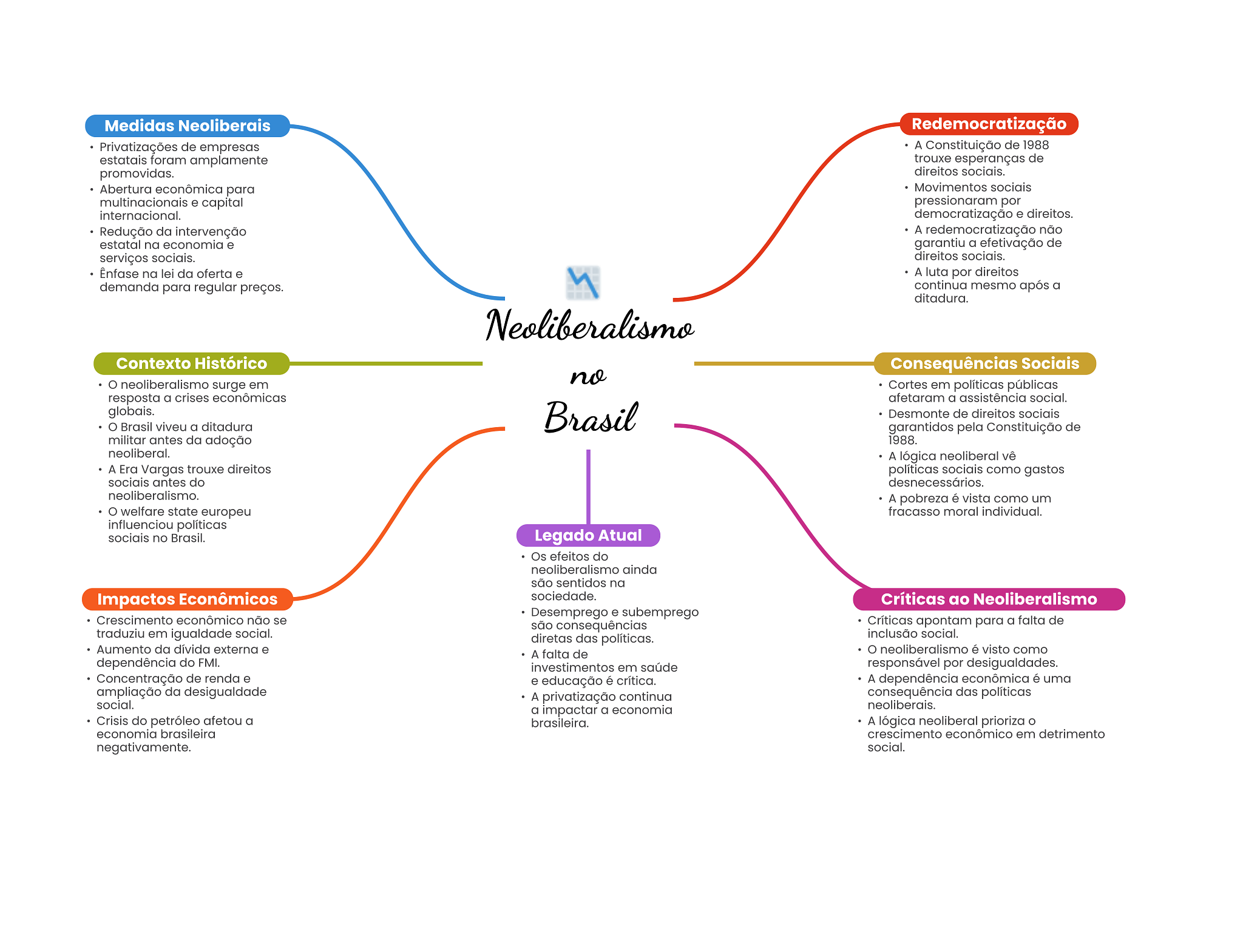 Medidas Neoliberais Redemocratização Privatizações de empresas A Constituição de 1988 estatais foram amplamente trouxe esperanças de promovidas. direitos sociais. Abertura econômica para Movimentos sociais multinacionais e capital pressionaram por internacional. democratização e direitos. Redução da intervenção A redemocratização não estatal na economia e garantiu a efetivação de serviços sociais. direitos sociais. Ênfase na lei da oferta e A luta por direitos demanda para regular preços. continua mesmo após a ditadura. Neoliberalismo Contexto Histórico Consequências Sociais no neoliberalismo surge em Cortes em políticas públicas resposta a crises econômicas afetaram a assistência social. globais. Brasil viveu a ditadura Brasil Desmonte de direitos sociais garantidos pela Constituição de militar antes da adoção 1988. neoliberal. A lógica neoliberal vê A Era Vargas trouxe direitos políticas sociais como gastos sociais antes do desnecessários. neoliberalismo. A pobreza é vista como um O welfare state europeu fracasso moral individual. influenciou políticas sociais no Brasil. Legado Atual Os efeitos do neoliberalismo ainda são sentidos na Impactos Econômicos sociedade. Críticas ao Neoliberalismo Desemprego e subemprego Crescimento econômico não se são consequências Críticas apontam para a falta de traduziu em igualdade social. diretas das políticas. inclusão social. Aumento da dívida externa e A falta de neoliberalismo é visto como dependência do FMI. investimentos em saúde responsável por desigualdades. Concentração de renda e e educação é crítica. A dependência econômica é uma ampliação da desigualdade A privatização continua consequência das políticas social. a impactar a economia neoliberais. Crisis do petróleo afetou a brasileira. A lógica neoliberal prioriza O economia brasileira crescimento econômico em detrimento negativamente. social.