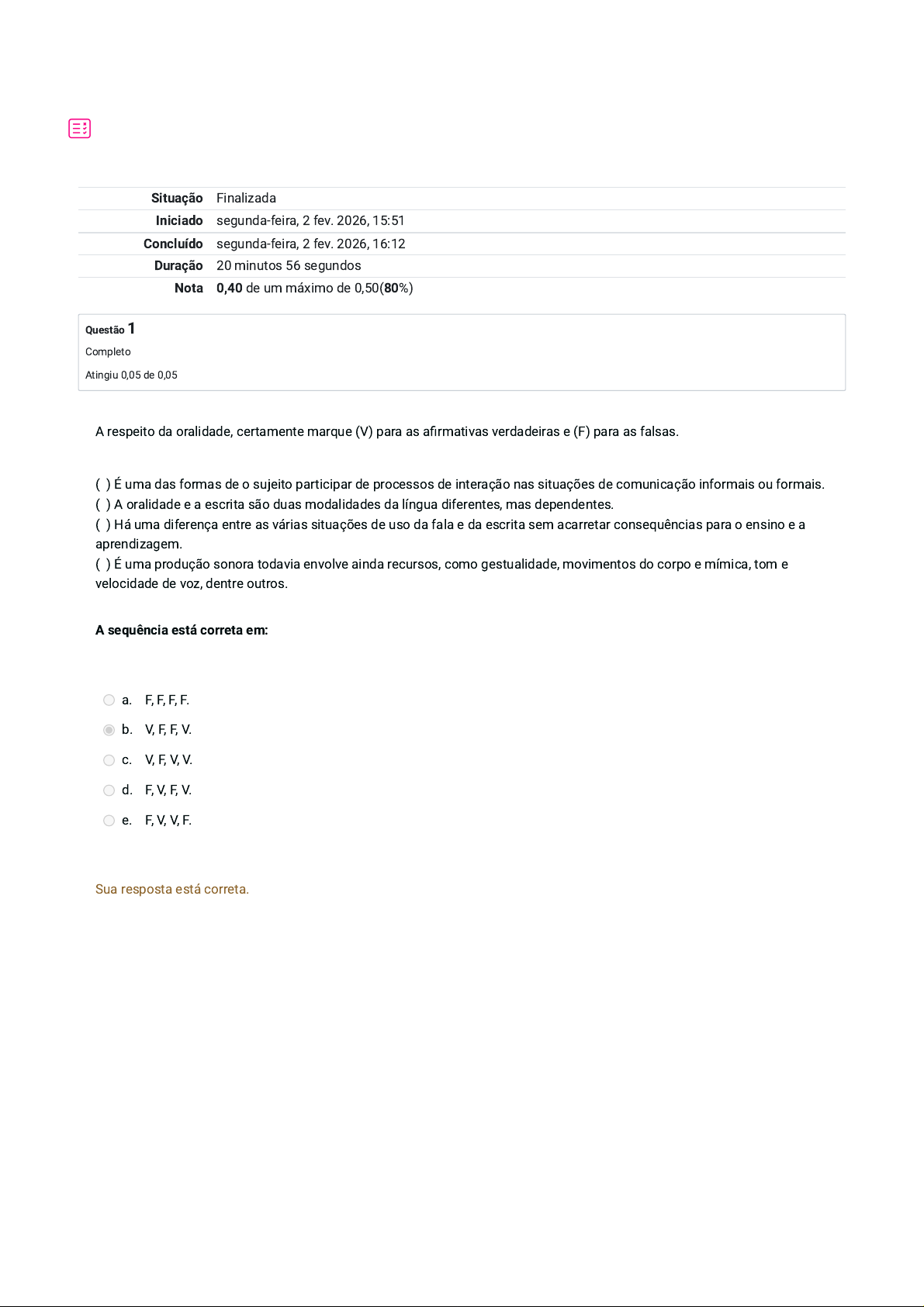 Situação Finalizada Iniciado segunda-feira, 2 fev. 2026, 15:51 Concluído segunda-feira, 2 fev. 2026, 16:12 Duração 20 minutos 56 segundos Nota 0,40 de um máximo de 0,50(80%) Questão 1 Completo Atingiu 0,05 de 0,05 A respeito da oralidade, certamente marque (V) para as afirmativas verdadeiras e (F) para as falsas. ( ) É uma das formas de o sujeito participar de processos de interação nas situações de comunicação informais ou formais. ( ) A oralidade e a escrita são duas modalidades da língua diferentes, mas dependentes. ( ) Há uma diferença entre as várias situações de uso da fala e da escrita sem acarretar consequências para o ensino e a aprendizagem. ( ) É uma produção sonora todavia envolve ainda recursos, como gestualidade, movimentos do corpo e mímica, tom e velocidade de voz, dentre outros. A sequência está correta em: a. F, F, F, F. b. V, F, F, V. c. V, F, V, V. d. F, V, F, V. e. F, V, V, F. Sua resposta está correta. Questão 2 Completo Atingiu 0,05 de 0,05 Questão 3 Completo Atingiu 0,05 de 0,05 “É uma palavra que tem conceito recente, introduzido na linguagem da educação e das ciências linguísticas há pouco mais de duas décadas. Seu surgimento pode ser interpretado como decorrência da necessidade de configurar e nomear comportamentos e práticas sociais na área da leitura e da escrita que ultrapassem o domínio do sistema alfabético e ortográfico, nível de aprendizagem da língua escrita perseguido, tradicionalmente, pelo processo de alfabetização”. A concepção faz referência à (ao): a. Alfabetização. b. Aprendizagem significativa. c. Dislexia. d. Letramento. e. Linguagem. Sua resposta está correta. Alunos com atraso escolar apresentam: a. Não precisam de apoio pedagógico. b. A mesma origem dos problemas. c. Manifestações diferenciadas dos problemas. d. Necessitam do mesmo tipo de resposta educativa. e. Boa adaptação ao ambiente educativo. Sua resposta está correta. Questão 4 Completo Atingiu 0,05 de 0,05 Questão 5 Completo Atingiu 0,05 de 0,05 Marcos, 6 (seis) anos, apresentou na avaliação fonoaudiológica dificuldades no desenho de figuras, principalmente a humana; dificuldade em copiar círculo, cruz, quadrado e triângulo (o que já é esperado para idade); dificuldade no formato das letras do alfabeto e desinteresse por atividades de escrita. Esses sinais são identificados em que tipo de transtorno de aprendizagem? a. Disartria. b. Dislexia. c. Disgrafia. d. Discalculia. e. Dislalia. Sua resposta está correta. A alfabetização é a aquisição do código da escrita e da leitura, está se faz pelo domínio de uma técnica: grafar e reconhecer letras, usar o papel, entender a direcionalidade da escrita, pegar no lápis, codificar, estabelecer relações entre sons e letras, de fonemas e grafemas, a criança percebe unidades menores que compõem o sistema de escrita (palavras, sílabas, letras). Já o letramento é a utilização desta tecnologia em: a. Práticas de ensino da leitura. b. Práticas sociais de leitura e de escrita. c. Práticas de ditado e cópia. d. Práticas de codificação da escrita. e. Práticas de ensino da escrita. Sua resposta está correta. Questão 6 Completo Atingiu 0,05 de 0,05 Questão 7 Completo Atingiu 0,00 de 0,05 Analise as afirmativas abaixo a respeito da importância da consciência fonológica no processo de alfabetização: 1. Para a criança aprender a ler e a escrever, basta apenas ensinar as letras soltas. 2. Consciência fonológica é a habilidade que nós temos em manipular os sons de nossa língua. 3. Consciência fonológica é a capacidade de percebermos que uma palavra pode começar ou terminar com o mesmo som. 4. Ter consciência fonológica é saber que existem também termos grandes e pequenos e que há frases (e uma segmentação nessas orações). Assinale a alternativa que indica todas as afirmativas corretas. a. São corretas apenas as afirmativas 3 e 4. b. São corretas apenas as afirmativas 2, 3 e 4. c. São corretas apenas as afirmativas 1 e 2. d. São corretas apenas as afirmativas 1, 2 e 3. e. São corretas as afirmativas 1, 2, 3 e 4. Sua resposta está correta. A técnica utilizada na terapia das dificuldades de compreensão de leitura, cujo objetivo é incentivar o escolar a manipular um livro, olhar suas ilustrações e elaborar uma hipótese inicial sobre a história que vai ser lida, denomina-se: a. Recontar histórias. b. Leitura direcionada. c. Mapa mental. d. Ditado. e. Compreensão dirigida. Sua resposta está incorreta. Questão 8 Completo Atingiu 0,05 de 0,05 Questão 9 Completo Atingiu 0,05 de 0,05 A mãe chega ao consultório com queixa que seu filho tem problemas na escola escrevendo: “maçarão”, “queicho”, “girasou”, traviceiro” e “visinho”. Qual seria a hipótese diagnóstica? a. Disortografia. b. Dislexia. c. Discalculia. d. Disgrafia. e. Dislalia. Sua resposta está correta. Magda Soares define letramento como “a participação em eventos variados de leitura e de escrita, e o consequente desenvolvimento de habilidades de uso da leitura nas práticas sociais que envolvem a língua escrita.” (SOARES, 2003, p. 16). Nesse contexto, são considerados conhecimentos específicos do processo de letramento: a. Cópia e ditados. b. Convivência do aluno com muitos materiais escritos. c. Relação entre oralidade e leitura de palavras escritas. d. Leitura e escrita de letras, sílabas e palavras. e. Orientação sistemática da leitura e da escrita. Sua resposta está correta. Questão 10 Completo Atingiu 0,00 de 0,05 Sobre a alfabetização e o letramento e o desenvolvimento da escrita, analise as afirmativas a seguir. I. É através da linguagem falada que a escrita vai desenvolver e no decorrer do brincar a criança cria situações, por isso é importante o estímulo da criança para o desenho. II. Em outras palavras à pedagogia desenvolver atividades que proporcione o desenvolvimento da escrita, logo com práticas p