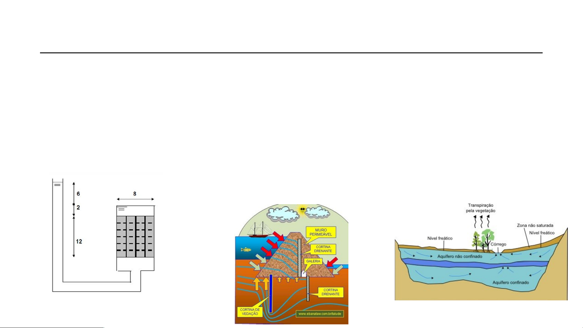 FLUXO EM SOLOS UNIDIMENSIONAL BIDIMENSIONAL TRIDIMENSIONAL Fluxo d’água com direção constante Areia uniforme → gradiente constante em qualquer ponto Fluxo segue caminhos em planos paralelos Obras lineares Barragens em vales abertos Valas, canais Estudo de redes de fluxo Fluxo d’água em qualquer direção Migração de água para um poço ou cava Barragens em vales fechados LEI DE DARCY Darcy verificou como os fatores geométricos influenciavam a vazão da água, expressos pela equação: Onde: L: Comprimento A: Área da amostra. q: Vazão de água. h: Diferença de potencial. i: Gradiente hidráulico. k: Coeficiente de permeabilidade. 3 LEI DE FLUXO GENERALIZADA Entra Sai Elemento de solo sujeito a fluxo de água A velocidade de percolação varia em cada plano (direção) em relação à profundidade deste plano. 3 4 EQUAÇÃO DA CONTINUIDADE LEI DE FLUXO GENERALIZADA A diferença entre o volume de água que entra e o volume que sai do maciço de solo por unidade de tempo é igual à variação de volume de água por unidade de tempo no interior do elemento de solo. A diferença de vazão de entrada e de saída é igual a variação de volume por unidade de tempo (medida de vazão). A equação da continuidade representa a variação do volume por unidade de tempo, que é dado pela soma da variação de volume em cada plano. 4 5 Vx = kx.ix Vy = ky.iy Vz = kz.iz Sinal negativo devido ao fato que a perda de carga total diminui com o aumento do caminho de percolação. LEI DE FLUXO GENERALIZADA Lei de Darcy 5 6 Admitindo o solo homogêneo, a Lei de Darcy e a água e o solo como incompressíveis, tem-se as seguintes considerações: LEI DE FLUXO GENERALIZADA Admitindo o volume de sólidos constante, tem-se: Relacionando as fórmulas de índices físicos do solo com a equação acima tem-se o volume de água em função do grau de saturação e índice de vazios. 6 7 substituindo nesta tem-se: = EQUAÇÃO TRIDIMENSIONAL DE FLUXO EM MEIOS NÃO SATURADOS LEI DE FLUXO GENERALIZADA EQUAÇÃO BIDIMENSIONAL DE FLUXO EM MEIOS NÃO SATURADOS Por meio de correlações mostradas acima tem-se a equação tridimensional de fluxo em meios não saturados! 7 8 Observando-se os termos e (índice de vazios) e S (grau de saturação), verifica-se que podem ocorrer 4 tipos de fenômenos: e e S constantes: Fluxo estacionário ou permanente (não varia com o tempo, ou seja, ), S = 100%: Caso considere isotropia na permeabilidade, tem-se kx=kz: LEI DE FLUXO GENERALIZADA Equação de Laplace Considera-se que os índices físicos podem assumir valores constantes e/ou valores variáveis no decorrer do fluxo. Essa variação ou constância vai influenciar no comportamento do fluxo! Aqui a água entra exatamente na mesma taxa que sai. Nada se acumula, nada se perde. É o caso mais simples e mais comum em problemas clássicos.” Exemplos Fluxo sob barragens Rede de fluxo Escoamento permanente em aquíferos 8 9 2. e variável e S constante: e decrescente adensamento e crescente expansão Observando-se os termos e (índice de vazios) e S (grau de saturação), verifica-se que podem ocorrer 4 tipos de fenômenos: LEI DE FLUXO GENERALIZADA Há armazenamento por variação estrutural do solo A quantidade de água muda porque o solo muda de volume, não porque entrou ou saiu água dos vazios. Exemplos Consolidação de solos argilosos Rebaixamento do lençol freático com recalque Problemas de adensamento 9 10 3. e constante e S variável: S decrescente Drenagem S crescente Embebimento Observando-se os termos e (índice de vazios) e S (grau de saturação), verifica-se que podem ocorrer 4 tipos de fenômenos: LEI DE FLUXO GENERALIZADA O solo é rígido, mas está molhando ou secando. 📌 Exemplos Secagem de um aterro Variação de umidade acima do lençol freático 10 11 4. e e S variáveis: Observando-se os termos e (índice de vazios) e S (grau de saturação), verifica-se que podem ocorrer 4 tipos de fenômenos: Problemas de compressão e expansão, além de drenagem e embebimento. Os casos 2, 3 e 4 são denominados fluxo transiente (quantidade de água que percola varia com o tempo, ou seja, vazão varia com o tempo) LEI DE FLUXO GENERALIZADA “É o problema completo de interação entre fluxo e deformação.” 📌 Exemplos Solos colapsíveis Expansão e retração 11 12 Sistema utilizado no estudo da percolação de água em solos; Representa o caminho percorrido pela água e a correspondente dissipação de carga. REDE DE FLUXO 12 PROPRIEDADES BÁSICAS DE UMA REDE DE FLUXO O conjunto das linhas de fluxo e equipotenciais forma a rede de fluxo, que representa a trajetória percorrida pela água no interior do solo. Como foi visto, a equação de Laplace, que descreve matematicamente o fluxo da água através do solo (isotrópico), representa duas famílias de curvas que se interceptam segundo ângulos retos Linhas de Fluxo: percursos das partículas de água Linhas Equipotenciais: União de pontos com a mesma carga hidráulica Cada canal de fluxo deve transportar a mesma descarga; A diferença de potencial (carga total) entre qualquer parte de linhas equipotenciais deve ser igual; As linhas equipotenciais cortam as linhas de fluxo em ângulo reto; As figuras formadas pelas linhas de fluxo e linhas equipotenciais são aproximadamente quadrados; Em qualquer ponto da rede, o espaçamento entre linhas equipotenciais são aproximadamente proporcional ao gradiente hidráulico e velocidade de percolação. 13 PROPRIEDADES BÁSICAS DE UMA REDE DE FLUXO - Condições limites estão determinadas: uma equipotencial de carga máxima e uma de carga mínima, duas linhas de fluxo. FLUXO CONFINADO AB: equipotencial de carga máxima (entrada) CD: equipotencial de carga mínima (saída) BRC: linha de fluxo superior MN: linha de fluxo inferior CONDIÇÃO ANISOTRÓPICA DE PERMEABILIDADE Transformação dos eixos DETERMINAÇÃO GRÁFICA DA REDE DE FLUXO 1° passo - estabelecer as condições de contorno, ou as condições limi