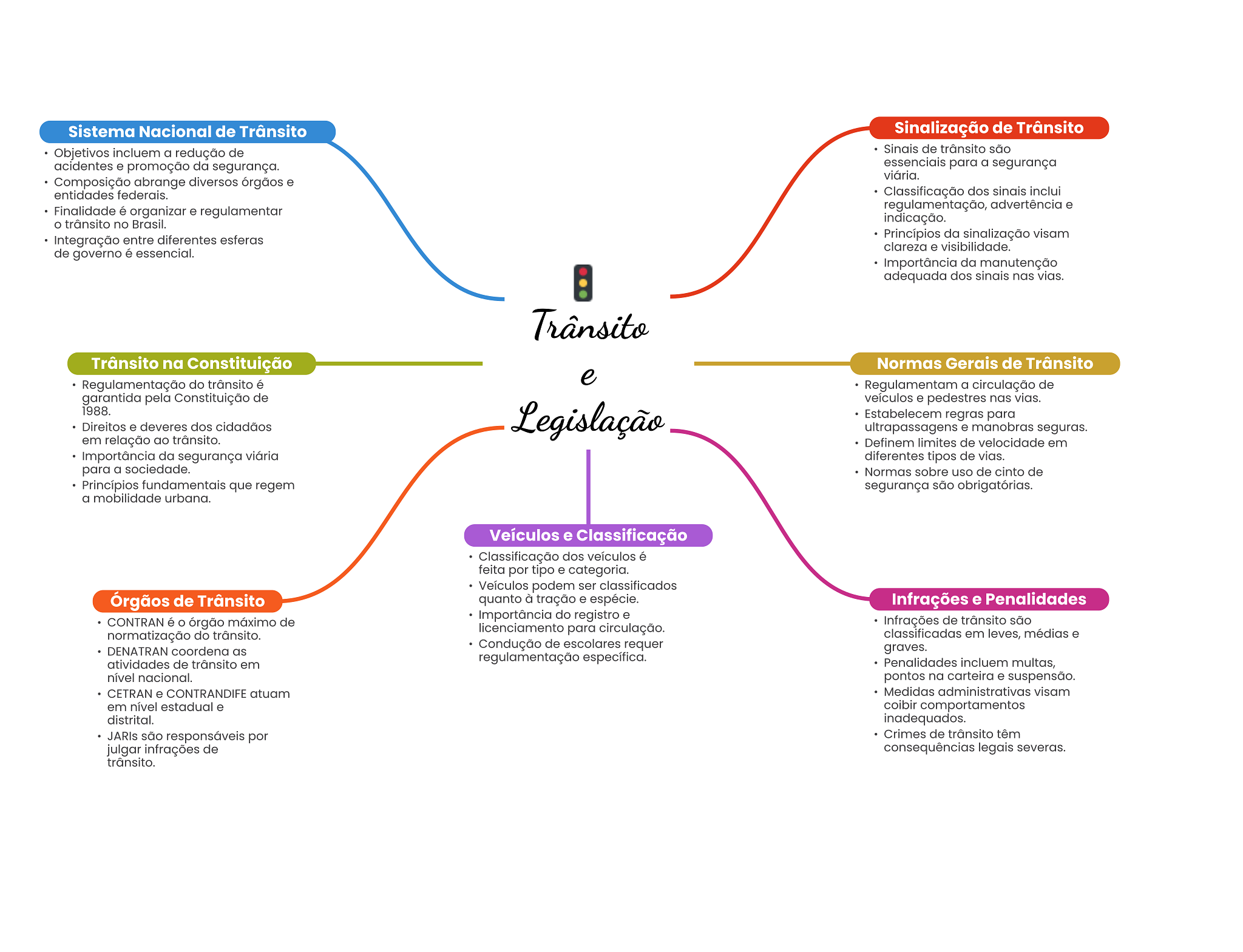 Sistema Nacional de Trânsito Sinalização de Trânsito Objetivos incluem a redução de Sinais de trânsito são acidentes e promoção da segurança. essenciais para a segurança viária. Composição abrange diversos órgãos e entidades federais. Classificação dos sinais inclui Finalidade é organizar e regulamentar regulamentação, advertência e trânsito no Brasil. indicação. Integração entre diferentes esferas Princípios da sinalização visam clareza e visibilidade. de governo é essencial. Importância da manutenção adequada dos sinais nas vias. Trânsito Trânsito na Constituição Normas Gerais de Trânsito Regulamentação do trânsito é e Regulamentam a circulação de garantida pela Constituição de veículos e pedestres nas vias. 1988. Direitos e deveres dos cidadãos Legislação Estabelecem regras para ultrapassagens e manobras seguras. em relação ao trânsito. Definem limites de velocidade em Importância da segurança viária diferentes tipos de vias. para a sociedade. Normas sobre uso de cinto de Princípios fundamentais que regem segurança são obrigatórias. a mobilidade urbana. Veículos e Classificação Classificação dos veículos é feita por tipo e categoria. Veículos podem ser classificados Órgãos de Trânsito quanto à tração e espécie. Infrações e Penalidades Importância do registro e CONTRAN é órgão máximo de Infrações de trânsito são licenciamento para circulação. normatização do trânsito. classificadas em leves, médias e Condução de escolares requer DENATRAN coordena as graves. atividades de trânsito em regulamentação específica. Penalidades incluem multas, nível nacional. pontos na carteira e suspensão. CETRAN e CONTRANDIFE atuam Medidas administrativas visam em nível estadual e coibir comportamentos distrital. inadequados. JARIs são responsáveis por Crimes de trânsito têm julgar infrações de consequências legais severas. trânsito.