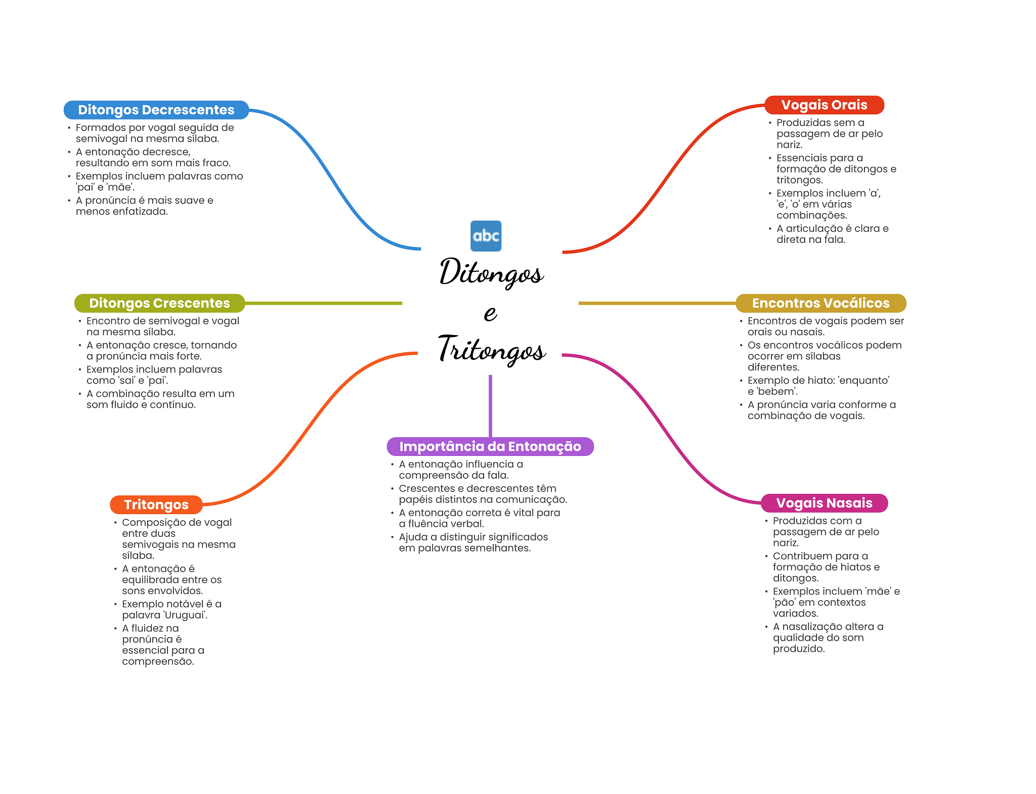 Ditongos Decrescentes Vogais Orais Produzidas sem a Formados por vogal seguida de semivogal na mesma sílaba. passagem de pelo nariz. A entonação decresce, resultando em som mais fraco. Essenciais para a formação de ditongos e Exemplos incluem palavras como tritongos. 'pai' e Exemplos incluem 'a', A pronúncia é mais suave e 'e', 'o' em várias menos enfatizada. combinações. abc A articulação é clara e direta na fala. Ditongos Ditongos Crescentes Encontros Vocálicos e Encontro de semivogal e vogal Encontros de vogais podem ser na mesma sílaba. orais ou nasais. A entonação cresce, tornando a pronúncia mais forte. Tritongos Os encontros vocálicos podem ocorrer em sílabas Exemplos incluem palavras diferentes. como 'sai' e 'pai'. Exemplo de hiato: A combinação resulta em um e som fluido e contínuo. A pronúncia varia conforme a combinação de vogais. Importância da Entonação A entonação influencia a compreensão da fala. Crescentes e decrescentes têm Tritongos papéis distintos na comunicação. Vogais Nasais A entonação correta é vital para Composição de vogal a fluência verbal. Produzidas com a entre duas Ajuda a distinguir significados passagem de ar pelo semivogais na mesma nariz. em palavras semelhantes. sílaba. Contribuem para a A entonação é formação de hiatos e equilibrada entre ditongos. sons envolvidos. Exemplos incluem e Exemplo notável é a em contextos palavra variados. A fluidez na A nasalização altera a pronúncia é qualidade do som essencial para a produzido. compreensão.