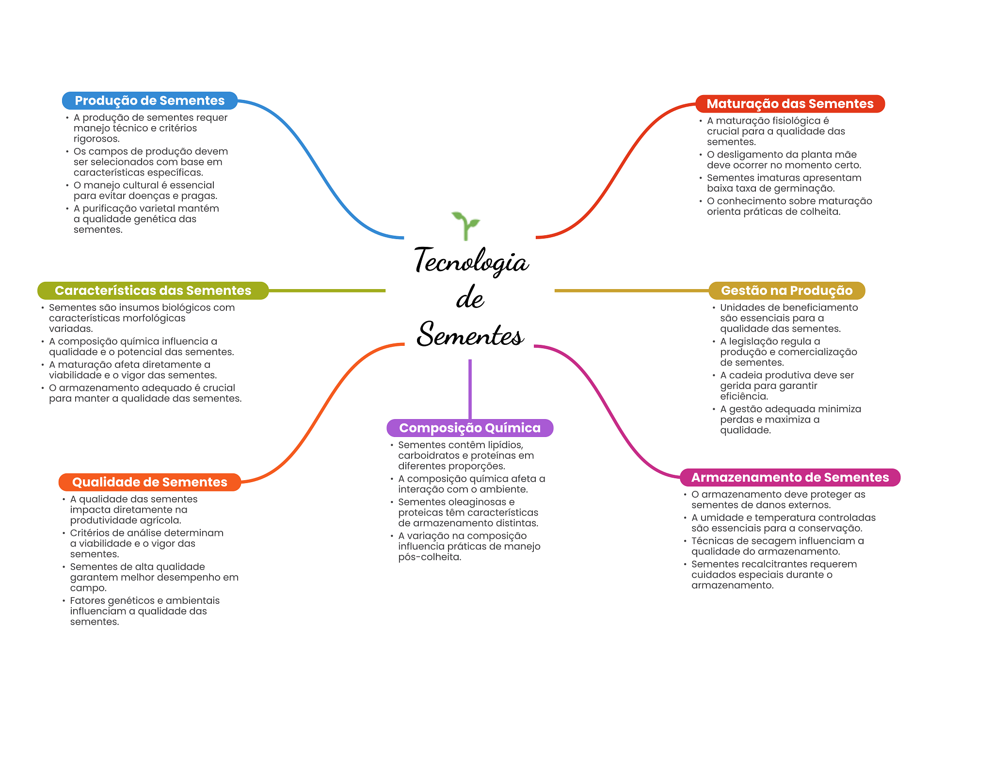 Produção de Sementes Maturação das Sementes A produção de sementes requer A maturação fisiológica é manejo técnico e critérios crucial para a qualidade das rigorosos. sementes. Os campos de produção devem desligamento da planta mãe ser selecionados com base em deve ocorrer no momento certo. características específicas. Sementes imaturas apresentam manejo cultural é essencial baixa taxa de germinação. para evitar doenças e pragas. conhecimento sobre maturação A purificação varietal mantém orienta práticas de colheita. a qualidade genética das sementes. Tecnologia Características das Sementes de Gestão na Produção Sementes são insumos biológicos com Unidades de beneficiamento características morfológicas são essenciais para a variadas. A composição química influencia a Sementes qualidade das sementes. A legislação regula a qualidade e potencial das sementes. produção e comercialização A maturação afeta diretamente a de sementes. viabilidade e vigor das sementes. A cadeia produtiva deve ser armazenamento adequado é crucial gerida para garantir para manter a qualidade das sementes. eficiência. A gestão adequada minimiza perdas e maximiza a Composição Química qualidade. Sementes contêm lipídios, carboidratos e proteínas em diferentes proporções. Qualidade de Sementes A composição química afeta a Armazenamento de Sementes interação com ambiente. A qualidade das sementes O armazenamento deve proteger as Sementes oleaginosas e sementes de danos externos. impacta diretamente na proteicas têm características produtividade agrícola. de armazenamento distintas. A umidade e temperatura controladas Critérios de análise determinam são essenciais para a conservação. A variação na composição a viabilidade e vigor das influencia práticas de manejo Técnicas de secagem influenciam a sementes. pós-colheita. qualidade do armazenamento. Sementes de alta qualidade Sementes recalcitrantes requerem garantem melhor desempenho em cuidados especiais durante campo. armazenamento. Fatores genéticos e ambientais influenciam a qualidade das sementes.