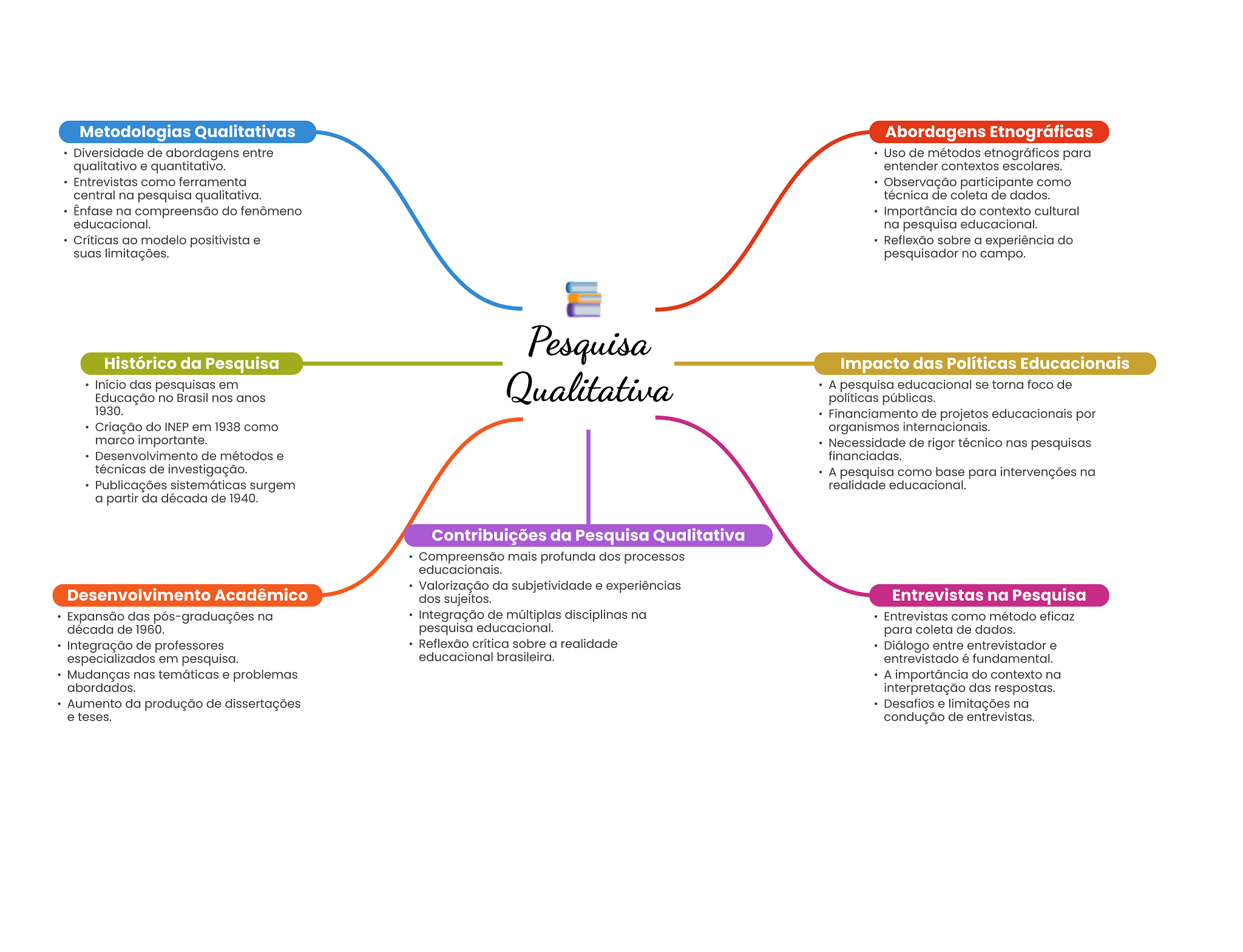 Metodologias Qualitativas Abordagens Etnográficas Diversidade de abordagens entre Uso de métodos etnográficos para qualitativo e quantitativo. entender contextos escolares. Entrevistas como ferramenta Observação participante como central na pesquisa qualitativa. técnica de coleta de dados. Ênfase na compreensão do fenômeno Importância do contexto cultural educacional. na pesquisa educacional. Críticas ao modelo positivista e Reflexão sobre a experiência do suas limitações. pesquisador no campo. Pesquisa Histórico da Pesquisa Impacto das Políticas Educacionais Início das pesquisas em Educação no Brasil nos anos Qualitativa A pesquisa educacional se torna foco de políticas públicas. 1930. Financiamento de projetos educacionais por Criação do INEP em 1938 como organismos internacionais. marco importante. Necessidade de rigor técnico nas pesquisas Desenvolvimento de métodos e financiadas. técnicas de investigação. A pesquisa como base para intervenções na Publicações sistemáticas surgem realidade educacional. a partir da década de 1940. Contribuições da Pesquisa Qualitativa Compreensão mais profunda dos processos educacionais. Valorização da subjetividade e experiências Desenvolvimento Acadêmico dos sujeitos. Entrevistas na Pesquisa Expansão das pós-graduações na Integração de múltiplas disciplinas na Entrevistas como método eficaz década de 1960. pesquisa educacional. para coleta de dados. Integração de professores Reflexão crítica sobre a realidade Diálogo entre entrevistador e especializados em pesquisa. educacional brasileira. entrevistado é fundamental. Mudanças nas temáticas e problemas A importância do contexto na abordados. interpretação das respostas. Aumento da produção de dissertações Desafios e limitações na e teses. condução de entrevistas.