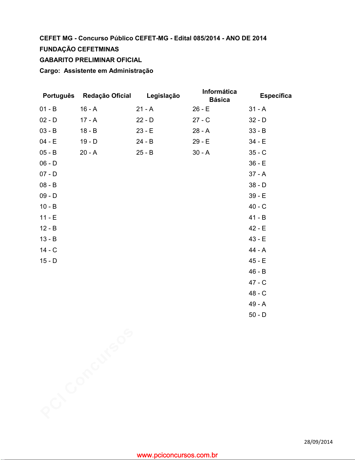 pcimarkpci MjgwNDo2ZmU4OjAxYzI6NGEwMDphNTA2OjNjOTg6YzI5OTphZWI5:VHVlLCAwMyBGZWIgMjAyNiAxMzo1NDozNSAtMDMwMA== www.pciconcursos.com.br Português Redação Oficial Legislação Informática Básica Específica 01 - B 16 - A 21 - A 26 - E 31 - A 02 - D 17 - A 22 - D 27 - C 32 - D 03 - B 18 - B 23 - E 28 - A 33 - B 04 - E 19 - D 24 - B 29 - E 34 - E 05 - B 20 - A 25 - B 30 - A 35 - C 06 - D 36 - E 07 - D 37 - A 08 - B 38 - D 09 - D 39 - E 10 - B 40 - C 11 - E 41 - B 12 - B 42 - E 13 - B 43 - E 14 - C 44 - A 15 - D 45 - E 46 - B 47 - C 48 - C 49 - A 50 - D CEFET MG - Concurso Público CEFET-MG - Edital 085/2014 - ANO DE 2014 FUNDAÇÃO CEFETMINAS GABARITO PRELIMINAR OFICIAL Cargo: Assistente em Administração 28/09/2014 www.pciconcursos.com.brwww.pciconcursos.com.brwww.pciconcursos.com.br pcimarkpci MjgwNDo2ZmU4OjAxYzI6NGEwMDphNTA2OjNjOTg6YzI5OTphZWI5:VHVlLCAwMyBGZWIgMjAyNiAxMzo1NDozNSAtMDMwMA== www.pciconcursos.com.br Português Redação Oficial Legislação Informática Básica Específica 01 - E 16 - C 21 - A 26 - A 31 - A 02 - A 17 - D 22 - D 27 - E 32 - E 03 - D 18 - E 23 - D 28 - B 33 - C 04 - A 19 - B 24 - C 29 - A 34 - A 05 - D 20 - B 25 - C 30 - B 35 - E 06 - E 36 - C 07 - A 37 - D 08 - E 38 - A 09 - C 39 - B 10 - C 40 - E 11 - D 41 - A 12 - B 42 - E 13 - C 43 - D 14 - C 44 - C 15 - E 45 - B 46 - A 47 - C 48 - C 49 - B 50 - C CEFET MG - Concurso Público CEFET-MG - Edital 085/2014 - ANO DE 2014 FUNDAÇÃO CEFETMINAS GABARITO PRELIMINAR OFICIAL Cargo: Assistente de Alunos 28/09/2014 www.pciconcursos.com.brwww.pciconcursos.com.brwww.pciconcursos.com.br pcimarkpci MjgwNDo2ZmU4OjAxYzI6NGEwMDphNTA2OjNjOTg6YzI5OTphZWI5:VHVlLCAwMyBGZWIgMjAyNiAxMzo1NDozNSAtMDMwMA== www.pciconcursos.com.br Português Redação Oficial Legislação Informática Básica Específica 01 - E 16 - C 21 - A 26 - A 31 - C 02 - A 17 - D 22 - D 27 - E 32 - A 03 - D 18 - E 23 - D 28 - B 33 - E 04 - A 19 - B 24 - C 29 - A 34 - D 05 - D 20 - B 25 - C 30 - B 35 - D 06 - E 36 - B 07 - A 37 - C 08 - E 38 - C 09 - C 39 - B 10 - C 40 - B 11 - D 41 - D 12 - B 42 - B 13 - C 43 - B 14 - C 44 - A 15 - E 45 - E 46 - A 47 - C 48 - A 49 - D 50 - C CEFET MG - Concurso Público CEFET-MG - Edital 085/2014 - ANO DE 2014 FUNDAÇÃO CEFETMINAS GABARITO PRELIMINAR OFICIAL Cargo: Auxiliar de Biblioteca 28/09/2014 www.pciconcursos.com.brwww.pciconcursos.com.brwww.pciconcursos.com.br pcimarkpci MjgwNDo2ZmU4OjAxYzI6NGEwMDphNTA2OjNjOTg6YzI5OTphZWI5:VHVlLCAwMyBGZWIgMjAyNiAxMzo1NDozNSAtMDMwMA== www.pciconcursos.com.br Português Redação Oficial Legislação Informática Básica Específica 01 - A 16 - D 21 - C 26 - A 31 - C 02 - B 17 - C 22 - E 27 - A 32 - D 03 - A 18 - E 23 - D 28 - E 33 - E 04 - D 19 - D 24 - A 29 - E 34 - B 05 - B 20 - A 25 - B 30 - D 35 - B 06 - D 36 - C 07 - B 37 - C 08 - E 38 - E 09 - C 39 - E 10 - E 40 - D 11 - E 41 - A 12 - B 42 - D 13 - B 43 - D 14 - C 44 - B 15 - E 45 - C 46 - A 47 - E 48 - B 49 - A 50 - D CEFET MG - Concurso Público CEFET-MG - Edital 085/2014 - ANO DE 2014 FUNDAÇÃO CEFETMINAS GABARITO PRELIMINAR OFICIAL Cargo: Bibliotecário 28/09/2014 www.pciconcursos.com.brwww.pciconcursos.com.brwww.pciconcursos.com.br pcimarkpci MjgwNDo2ZmU4OjAxYzI6NGEwMDphNTA2OjNjOTg6YzI5OTphZWI5:VHVlLCAwMyBGZWIgMjAyNiAxMzo1NDozNSAtMDMwMA== www.pciconcursos.com.br Português Redação Oficial Legislação Informática Básica Específica 01 - A 16 - D 21 - C 26 - A 31 - C 02 - B 17 - C 22 - E 27 - A 32 - C 03 - A 18 - E 23 - D 28 - E 33 - A 04 - D 19 - D 24 - A 29 - E 34 - B 05 - B 20 - A 25 - B 30 - D 35 - C 06 - D 36 - A 07 - B 37 - A 08 - E 38 - E 09 - C 39 - D 10 - E 40 - C 11 - E 41 - E 12 - B 42 - D 13 - B 43 - B 14 - C 44 - B 15 - E 45 - D 46 - B 47 - E 48 - D 49 - E 50 - D CEFET MG - Concurso Público CEFET-MG - Edital 085/2014 - ANO DE 2014 FUNDAÇÃO CEFETMINAS GABARITO PRELIMINAR OFICIAL Cargo: Nutricionista 28/09/2014 www.pciconcursos.com.brwww.pciconcursos.com.brwww.pciconcursos.com.br pcimarkpci MjgwNDo2ZmU4OjAxYzI6NGEwMDphNTA2OjNjOTg6YzI5OTphZWI5:VHVlLCAwMyBGZWIgMjAyNiAxMzo1NDozNSAtMDMwMA== www.pciconcursos.com.br Português Redação Oficial Legislação Informática Básica Específica 01 - A 16 - D 21 - C 26 - A 31 - C 02 - B 17 - C 22 - E 27 - A 32 - D 03 - A 18 - E 23 - D 28 - E 33 - E 04 - D 19 - D 24 - A 29 - E 34 - E 05 - B 20 - A 25 - B 30 - D 35 - E 06 - D 36 - A 07 - B 37 - C 08 - E 38 - D 09 - C 39 - D 10 - E 40 - C 11 - E 41 - C 12 - B 42 - B 13 - B 43 - B 14 - C 44 - A 15 - E 45 - D 46 - A 47 - A 48 - E 49 - B 50 - B CEFET MG - Concurso Público CEFET-MG - Edital 085/2014 - ANO DE 2014 FUNDAÇÃO CEFETMINAS GABARITO PRELIMINAR OFICIAL Cargo: Pedagogo 28/09/2014 www.pciconcursos.com.brwww.pciconcursos.com.brwww.pciconcursos.com.br pcimarkpci MjgwNDo2ZmU4OjAxYzI6NGEwMDphNTA2OjNjOTg6YzI5OTphZWI5:VHVlLCAwMyBGZWIgMjAyNiAxMzo1NDozNSAtMDMwMA== www.pciconcursos.com.br Português Redação Oficial Legislação Informática Básica Específica 01 - B 16 - A 21 - A 26 - E 31 - C 02 - D 17 - A 22 - D 27 - C 32 - E 03 - B 18 - B 23 - E 28 - A 33 - A 04 - E 19 - D 24 - B 29 - E 34 - B 05 - B 20 - A 25 - B 30 - A 35 - C 06 - D 36 - D 07 - D 37 - C 08 - B 38 - B 09 - D 39 - C 10 - B 40 - E 11 - E 41 - E 12 - B 42 - A 13 - B 43 - A 14 - C 44 - B 15 - D 45 - C 46 - C 47 - A 48 - E 49 - C 50 - D CEFET MG - Concurso Público CEFET-MG - Edital 085/2014 - ANO DE 2014 FUNDAÇÃO CEFETMINAS GABARITO PRELIMINAR OFICIAL Cargo: Técnico em Secretariado 28/09/2014 www.pciconcursos.com.br