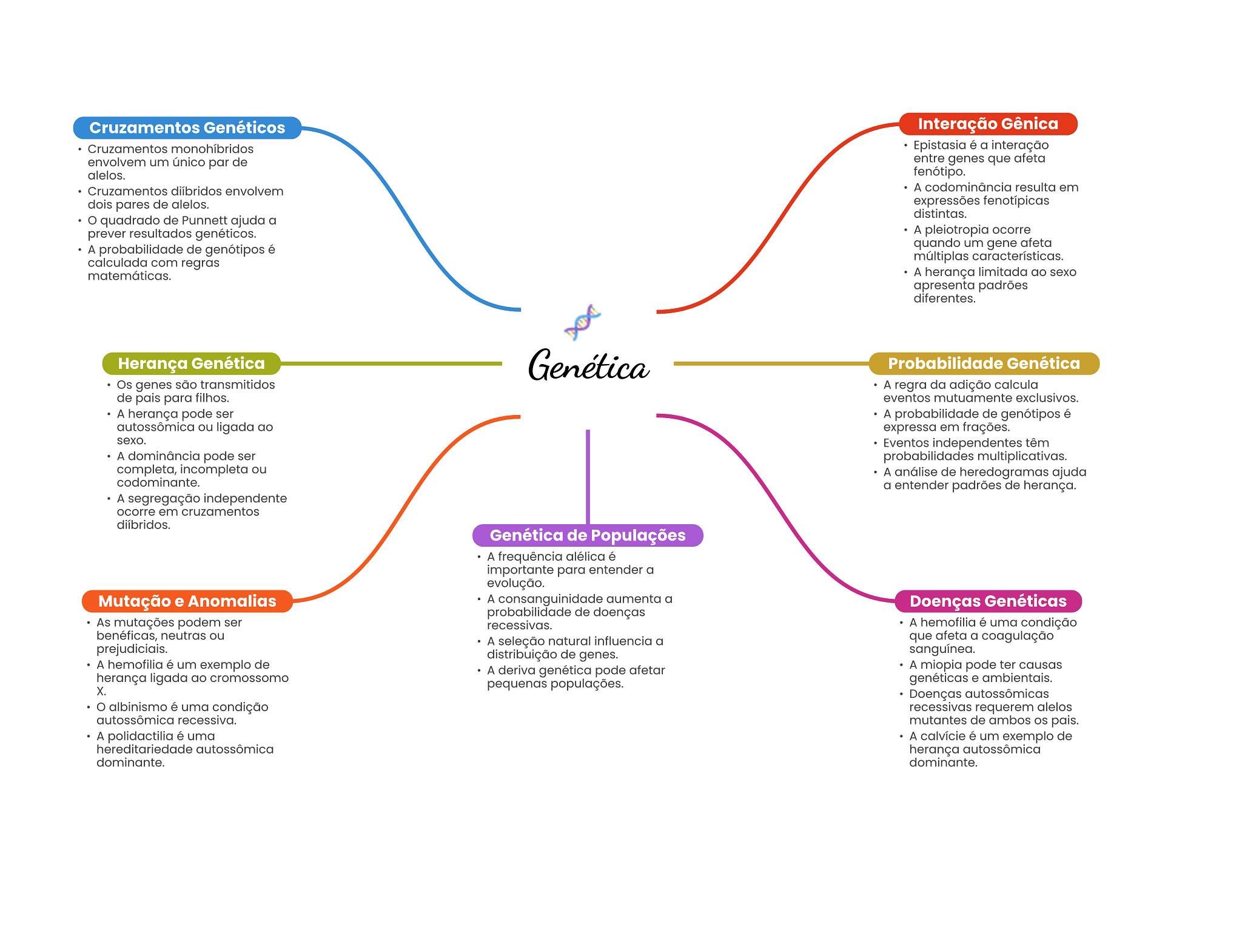Cruzamentos Genéticos Interação Gênica Cruzamentos monohíbridos Epistasia é a interação envolvem um único par de entre genes que afeta alelos. fenótipo. Cruzamentos diíbridos envolvem A codominância resulta em dois pares de alelos. expressões fenotípicas distintas. quadrado de Punnett ajuda a prever resultados genéticos. A pleiotropia ocorre A probabilidade de genótipos é quando um gene afeta calculada com regras múltiplas características. matemáticas. A herança limitada ao sexo apresenta padrões diferentes. Herança Genética Genética Probabilidade Genética Os genes são transmitidos A regra da adição calcula de pais para filhos. eventos mutuamente exclusivos. A herança pode ser A probabilidade de genótipos é autossômica ou ligada ao expressa em frações. sexo. Eventos independentes têm A dominância pode ser probabilidades multiplicativas. completa, incompleta ou A análise de heredogramas ajuda codominante. a entender padrões de herança. A segregação independente ocorre em cruzamentos diíbridos. Genética de Populações A frequência alélica é importante para entender a evolução. Mutação e Anomalias A consanguinidade aumenta a Doenças Genéticas probabilidade de doenças As mutações podem ser recessivas. A hemofilia é uma condição benéficas, neutras ou A seleção natural influencia a que afeta a coagulação prejudiciais. distribuição de genes. sanguínea. A hemofilia é um exemplo de A deriva genética pode afetar A miopia pode ter causas herança ligada ao cromossomo pequenas populações. genéticas e ambientais. X. Doenças autossômicas albinismo é uma condição recessivas requerem alelos autossômica recessiva. mutantes de ambos pais. A polidactilia é uma A calvície é um exemplo de hereditariedade autossômica herança autossômica dominante. dominante.