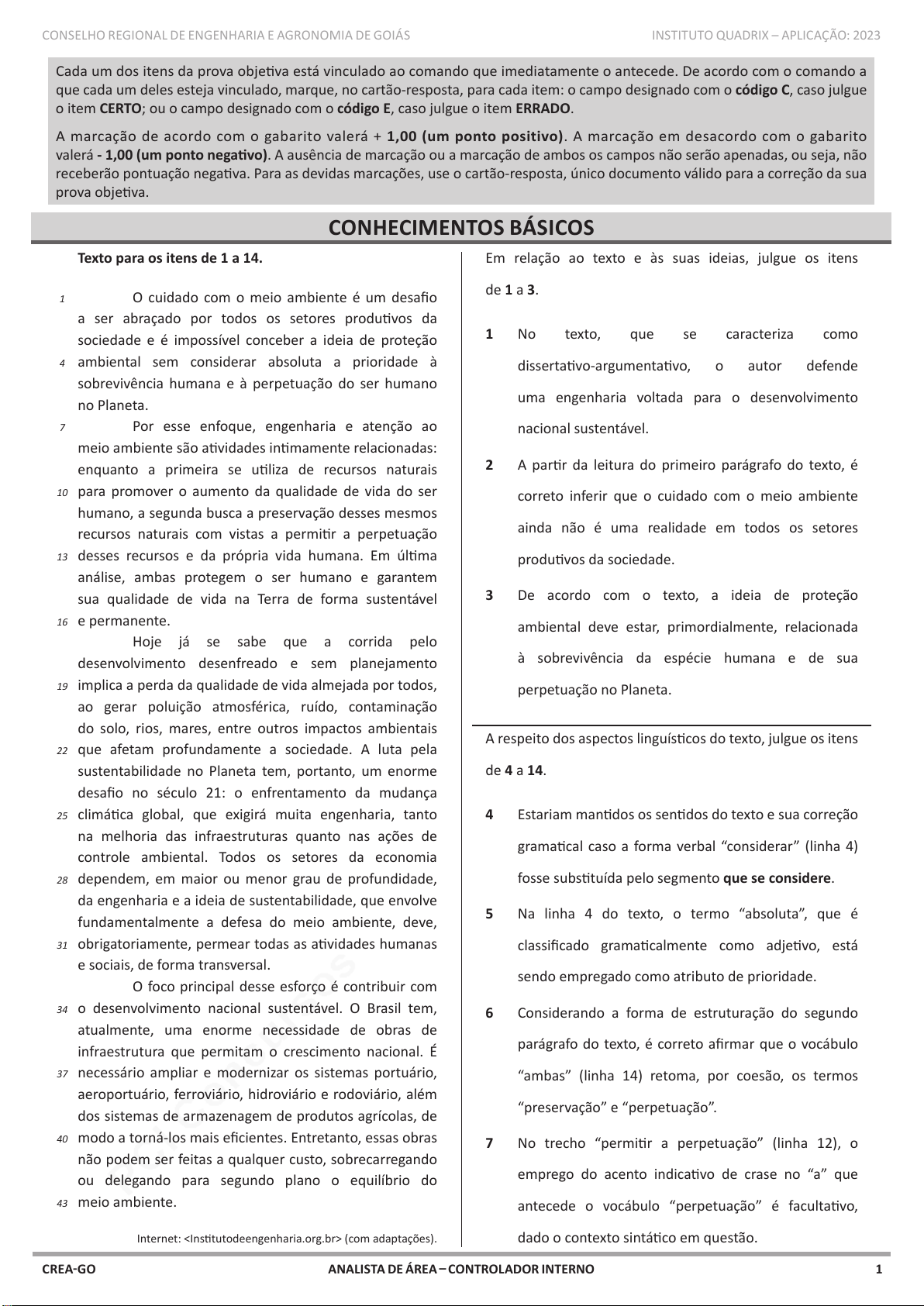 pcimarkpci MjgwNDo2ZmU4OjAxYzI6NGEwMDphNTA2OjNjOTg6YzI5OTphZWI5:VHVlLCAwMyBGZWIgMjAyNiAxNDoyNDozNSAtMDMwMA== www.pciconcursos.com.br ANALISTA DE ÁREA – CONTROLADOR INTERNOCREA-GO CONSELHO REGIONAL DE ENGENHARIA E AGRONOMIA DE GOIÁS INSTITUTO QUADRIX – APLICAÇÃO: 2023 1 Cada um dos itens da prova objetiva está vinculado ao comando que imediatamente o antecede. De acordo com o comando a que cada um deles esteja vinculado, marque, no cartão-resposta, para cada item: o campo designado com o código C, caso julgue o item CERTO; ou o campo designado com o código E, caso julgue o item ERRADO. A marcação de acordo com o gabarito valerá + 1,00 (um ponto positivo). A marcação em desacordo com o gabarito valerá - 1,00 (um ponto negativo). A ausência de marcação ou a marcação de ambos os campos não serão apenadas, ou seja, não receberão pontuação negativa. Para as devidas marcações, use o cartão-resposta, único documento válido para a correção da sua prova objetiva. CONHECIMENTOS BÁSICOS Texto para os itens de 1 a 14. O cuidado com o meio ambiente é um desafio a ser abraçado por todos os setores produtivos da sociedade e é impossível conceber a ideia de proteção ambiental sem considerar absoluta a prioridade à sobrevivência humana e à perpetuação do ser humano no Planeta. Por esse enfoque, engenharia e atenção ao meio ambiente são atividades intimamente relacionadas: enquanto a primeira se utiliza de recursos naturais para promover o aumento da qualidade de vida do ser humano, a segunda busca a preservação desses mesmos recursos naturais com vistas a permitir a perpetuação desses recursos e da própria vida humana. Em última análise, ambas protegem o ser humano e garantem sua qualidade de vida na Terra de forma sustentável e permanente. Hoje já se sabe que a corrida pelo desenvolvimento desenfreado e sem planejamento implica a perda da qualidade de vida almejada por todos, ao gerar poluição atmosférica, ruído, contaminação do solo, rios, mares, entre outros impactos ambientais que afetam profundamente a sociedade. A luta pela sustentabilidade no Planeta tem, portanto, um enorme desafio no século 21: o enfrentamento da mudança climática global, que exigirá muita engenharia, tanto na melhoria das infraestruturas quanto nas ações de controle ambiental. Todos os setores da economia dependem, em maior ou menor grau de profundidade, da engenharia e a ideia de sustentabilidade, que envolve fundamentalmente a defesa do meio ambiente, deve, obrigatoriamente, permear todas as atividades humanas e sociais, de forma transversal. O foco principal desse esforço é contribuir com o desenvolvimento nacional sustentável. O Brasil tem, atualmente, uma enorme necessidade de obras de infraestrutura que permitam o crescimento nacional. É necessário ampliar e modernizar os sistemas portuário, aeroportuário, ferroviário, hidroviário e rodoviário, além dos sistemas de armazenagem de produtos agrícolas, de modo a torná‑los mais eficientes. Entretanto, essas obras não podem ser feitas a qualquer custo, sobrecarregando ou delegando para segundo plano o equilíbrio do meio ambiente. Internet: (com adaptações). Em relação ao texto e às suas ideias, julgue os itens de 1 a 3. 1 No texto, que se caracteriza como dissertativo‑argumentativo, o autor defende uma engenharia voltada para o desenvolvimento nacional sustentável. 2 A partir da leitura do primeiro parágrafo do texto, é correto inferir que o cuidado com o meio ambiente ainda não é uma realidade em todos os setores produtivos da sociedade. 3 De acordo com o texto, a ideia de proteção ambiental deve estar, primordialmente, relacionada à sobrevivência da espécie humana e de sua perpetuação no Planeta. A respeito dos aspectos linguísticos do texto, julgue os itens de 4 a 14. 4 Estariam mantidos os sentidos do texto e sua correção gramatical caso a forma verbal “considerar” (linha 4) fosse substituída pelo segmento que se considere. 5 Na linha 4 do texto, o termo “absoluta”, que é classificado gramaticalmente como adjetivo, está sendo empregado como atributo de prioridade. 6 Considerando a forma de estruturação do segundo parágrafo do texto, é correto afirmar que o vocábulo “ambas” (linha 14) retoma, por coesão, os termos “preservação” e “perpetuação”. 7 No trecho “permitir a perpetuação” (linha 12), o emprego do acento indicativo de crase no “a” que antecede o vocábulo “perpetuação” é facultativo, dado o contexto sintático em questão. 1 4 7 10 13 16 19 22 25 28 31 34 37 40 43 pcimarkpci MjgwNDo2ZmU4OjAxYzI6NGEwMDphNTA2OjNjOTg6YzI5OTphZWI5:VHVlLCAwMyBGZWIgMjAyNiAxNDoyNDozNSAtMDMwMA== www.pciconcursos.com.br ANALISTA DE ÁREA – CONTROLADOR INTERNOCREA-GO CONSELHO REGIONAL DE ENGENHARIA E AGRONOMIA DE GOIÁS INSTITUTO QUADRIX – APLICAÇÃO: 2023 2 8 Estaria mantida a relação de sentido estabelecida entre os dois primeiros períodos do terceiro parágrafo do texto, caso o vocábulo “portanto” (linha 23) fosse substituído por pois. 9 Estariam mantidas a correção gramatical e a clareza das ideias do texto, caso o trecho “no século 21” (linha 24) fosse reescrito como nesse século. 10 A supressão das vírgulas que isolam a oração introduzida pelo vocábulo “que” (linhas 29 e 30) manteria a correção gramatical do texto, mas o sentido atribuído, no período, à “ideia de sustentabilidade” seria alterado. 11 Estariam preservadas a correção gramatical e a coerência textual, caso o segundo período do último parágrafo fosse, assim, reescrito: No Brasil atual, há enorme carência de obras de infraestrutura impõem que se favoreça o crescimento nacional. 12 No início do terceiro parágrafo do texto, o vocábulo “se” (linha 17) tem sentido reflexivo. 13 No segmento “Todos os setores da economia” (linha 27), a supressão do vocábulo “os” manteria a correção gramatical do texto, mas 