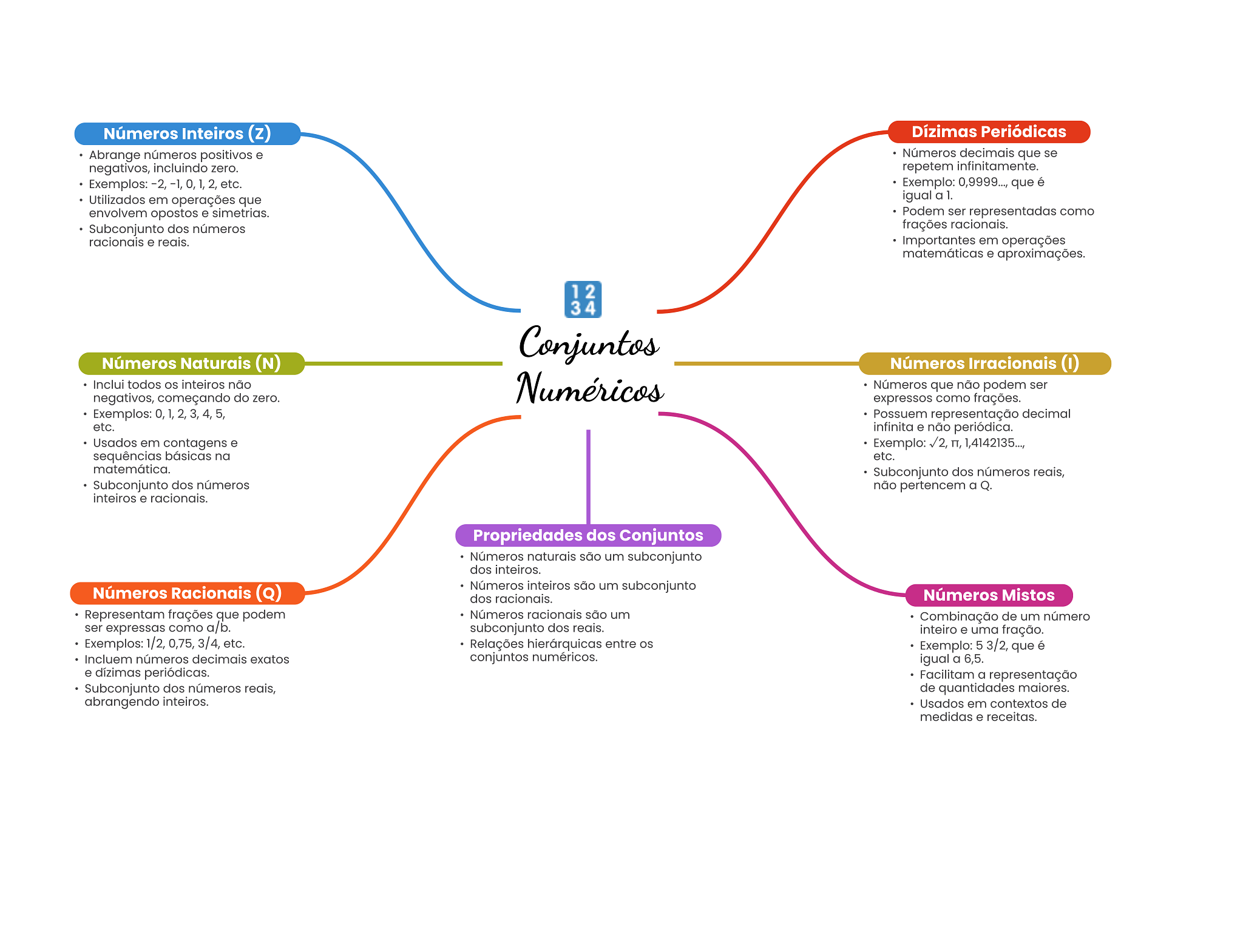 Números Inteiros (z) Dízimas Periódicas Abrange números positivos e Números decimais que se negativos, incluindo zero. repetem infinitamente. Exemplos: -2, -1, 0,1,2, etc. Exemplo: 0,9999..., que é Utilizados em operações que igual a 1. envolvem opostos e simetrias. Podem ser representadas como Subconjunto dos números frações racionais. racionais e reais. Importantes em operações matemáticas e aproximações. 12 Conjuntos Números Naturais (N) Números Irracionais Inclui todos inteiros não negativos, começando do zero. Numéricos Números que não podem ser expressos como frações. Exemplos: 0,1,2,3,4,5, Possuem representação decimal etc. infinita e não periódica. Usados em contagens e Exemplo: п, 1,4142135..., sequências básicas na etc. matemática. Subconjunto dos números reais, Subconjunto dos números não pertencem a Q. inteiros e racionais. Propriedades dos Conjuntos Números naturais são um subconjunto dos inteiros. Números Racionais Números inteiros são um subconjunto dos racionais. Números Mistos Representam frações que podem Números racionais são um Combinação de um número ser expressas como a/b. subconjunto dos reais. inteiro e uma fração. Exemplos: 1/2, 0,75, 3/4, etc. Relações hierárquicas entre OS Exemplo: 5 3/2, que é Incluem números decimais exatos conjuntos numéricos. igual a 6,5. e dízimas periódicas. Facilitam a representação Subconjunto dos números reais, de quantidades maiores. abrangendo inteiros. Usados em contextos de medidas e receitas.
