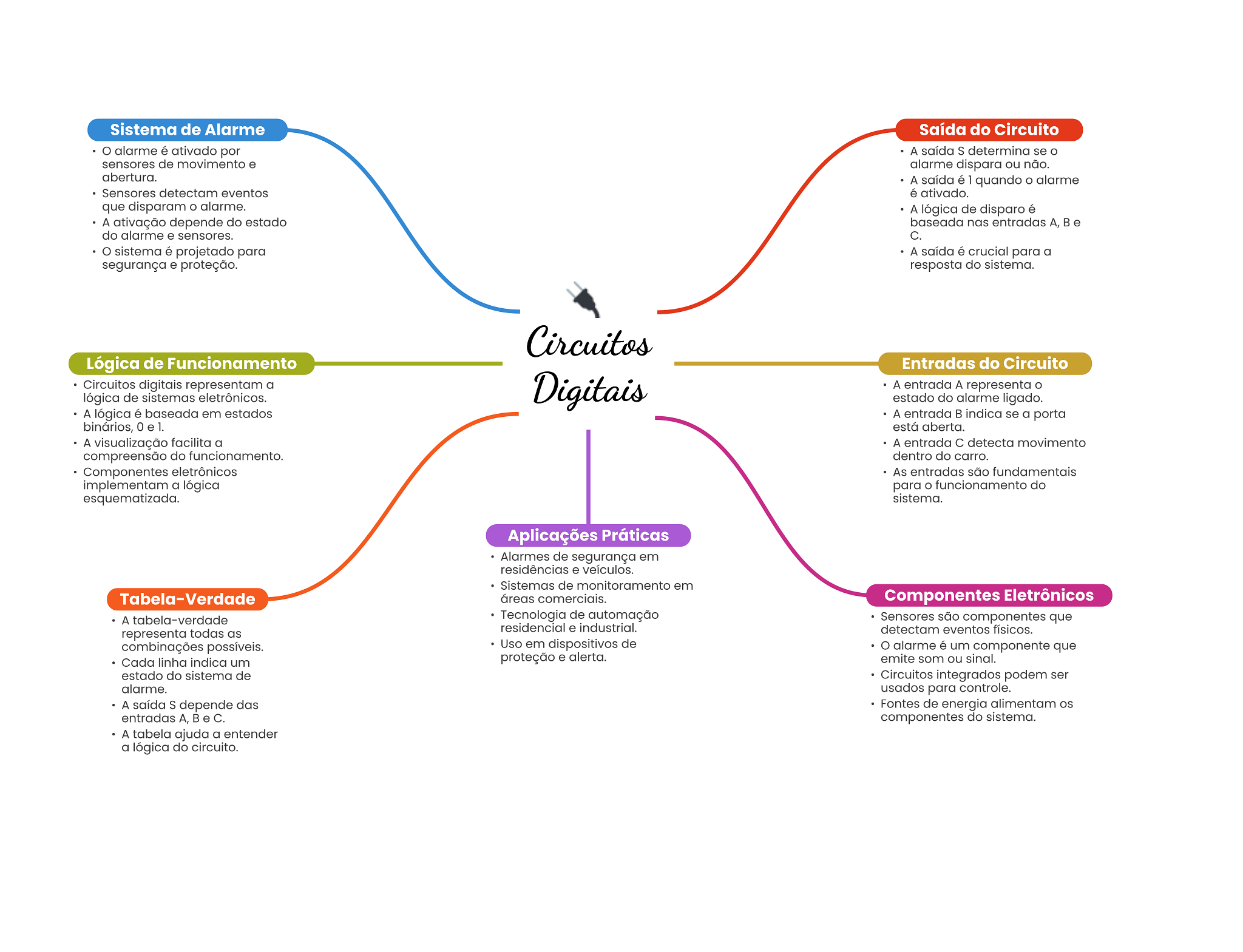 Sistema de Alarme Saída do Circuito alarme é ativado por A saída S determina se o sensores de movimento e alarme dispara ou não. abertura. A saída é 1 quando o alarme Sensores detectam eventos é ativado. que disparam alarme. A lógica de disparo é A ativação depende do estado baseada nas entradas A, B e do alarme e sensores. C. sistema é projetado para A saída é crucial para a segurança e proteção. resposta do sistema. Circuitos Lógica de Funcionamento Entradas do Circuito Circuitos digitais representam a Digitais A entrada A representa lógica de sistemas eletrônicos. estado do alarme ligado. A lógica é baseada em estados A entrada B indica se a porta binários, 0 está aberta. A visualização facilita a A entrada C detecta movimento compreensão do funcionamento. dentro do carro. Componentes eletrônicos As entradas são fundamentais implementam a lógica para O funcionamento do esquematizada. sistema. Aplicações Práticas Alarmes de segurança em residências e veículos. Sistemas de monitoramento em Tabela-Verdade áreas comerciais. Componentes Eletrônicos A tabela-verdade Tecnologia de automação Sensores são componentes que residencial e industrial. representa todas as detectam eventos físicos. combinações possíveis. Uso em dispositivos de alarme é um componente que Cada linha indica um proteção e alerta. emite som ou sinal. estado do sistema de Circuitos integrados podem ser alarme. usados para controle. A saída S depende das Fontes de energia alimentam entradas A, B e C. componentes do sistema. A tabela ajuda a entender a lógica do circuito.