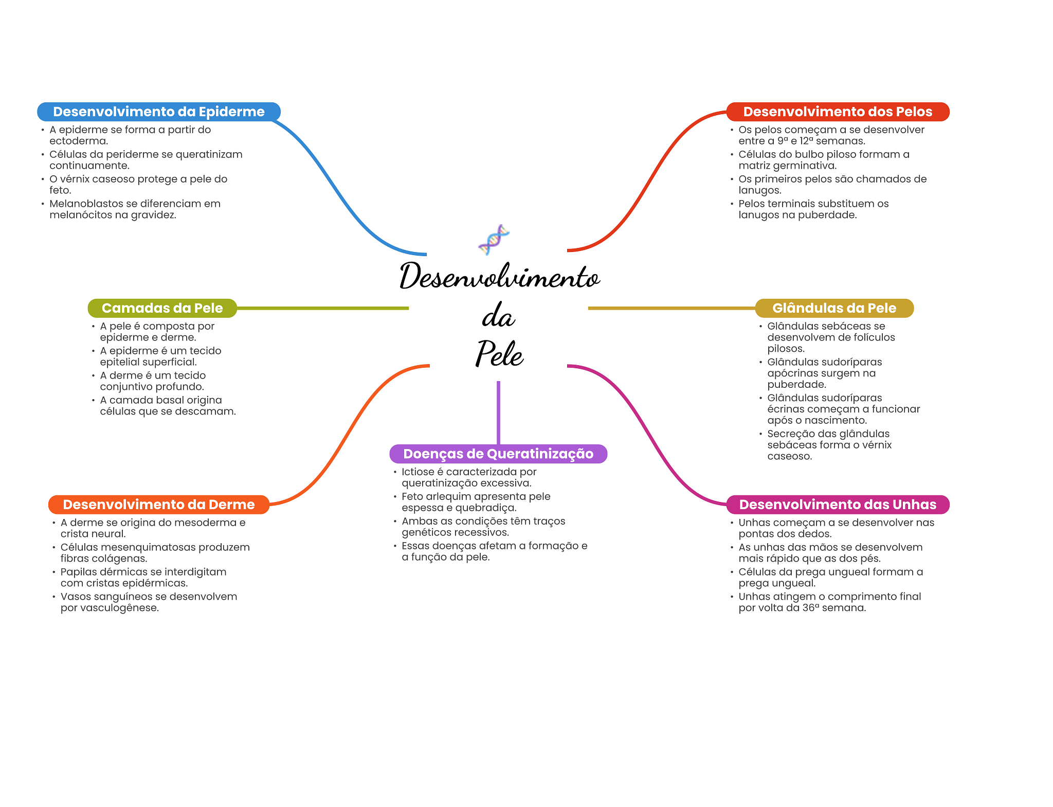 da Epiderme Desenvolvimento dos Pelos A epiderme se forma a partir do Os pelos começam a se desenvolver ectoderma. entre a e semanas. Células da periderme se queratinizam Células do bulbo piloso formam a continuamente. matriz germinativa. vérnix caseoso protege a pele do Os primeiros pelos são chamados de feto. lanugos. Melanoblastos se diferenciam em Pelos terminais substituem melanócitos na gravidez. lanugos na puberdade. Desenvolvimento Camadas da Pele da Glândulas da Pele A pele é composta por Glândulas sebáceas se epiderme e derme. desenvolvem de folículos A epiderme é um tecido epitelial superficial. Pele pilosos. Glândulas sudoríparas A derme é um tecido apócrinas surgem na conjuntivo profundo. puberdade. A camada basal origina Glândulas sudoríparas células que se descamam. écrinas começam a funcionar após nascimento. Secreção das glândulas sebáceas forma vérnix Doenças de Queratinização caseoso. Ictiose é caracterizada por queratinização excessiva. Feto arlequim apresenta pele Desenvolvimento da Derme espessa e quebradiça. Desenvolvimento das Unhas A derme se origina do mesoderma e Ambas as condições têm traços Unhas começam a se desenvolver nas crista neural. genéticos recessivos. pontas dos dedos. Células mesenquimatosas produzem Essas doenças afetam a formação e As unhas das mãos se desenvolvem fibras colágenas. a função da pele. mais rápido que as dos pés. Papilas dérmicas se interdigitam Células da prega ungueal formam a com cristas epidérmicas. prega ungueal. Vasos sanguíneos se desenvolvem Unhas atingem comprimento final por vasculogênese. por volta da semana.