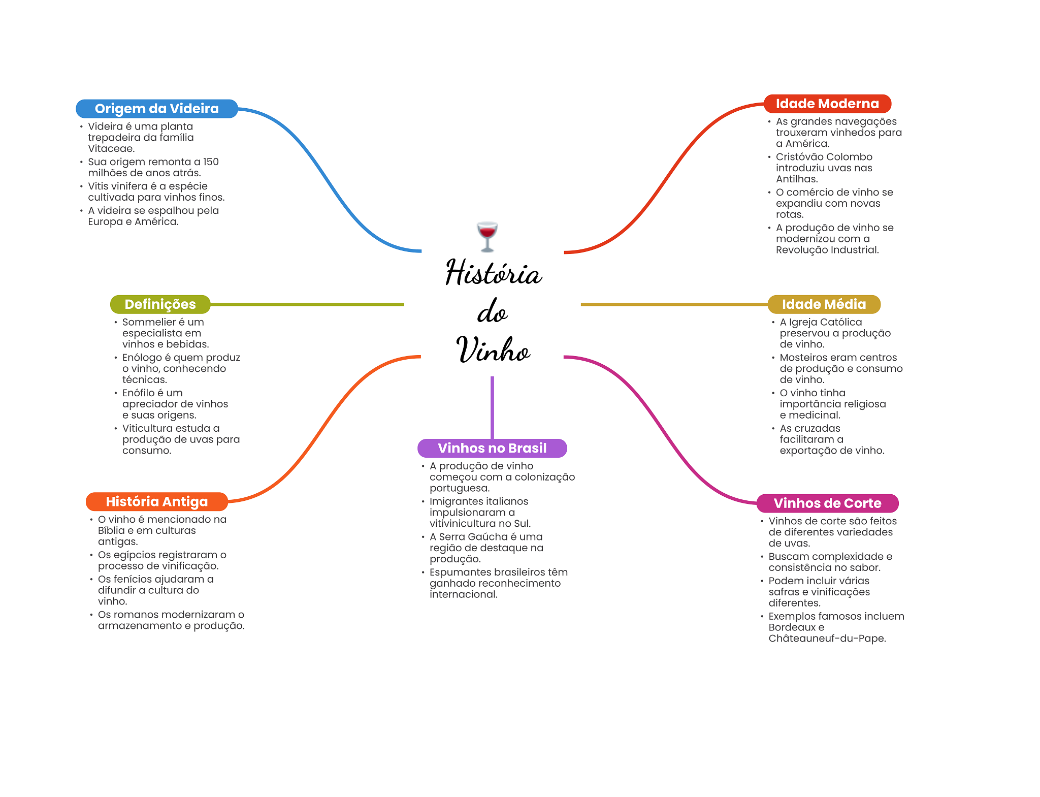 Origem da Videira Idade Moderna Videira é uma planta As grandes navegações trepadeira da família trouxeram vinhedos para a América. Vitaceae. Cristóvão Colombo Sua origem remonta a 150 introduziu uvas nas milhões de anos atrás. Antilhas. Vitis vinifera é a espécie comércio de vinho se cultivada para vinhos finos. expandiu com novas A videira se espalhou pela rotas. Europa e América. A produção de vinho se modernizou com a Revolução Industrial. História Definições do Idade Média Sommelier é um A Igreja Católica especialista em preservou a produção vinhos e bebidas. Enólogo é quem produz Vinho de vinho. Mosteiros eram centros vinho, conhecendo de produção e consumo técnicas. de vinho. Enófilo é um O vinho tinha apreciador de vinhos importância religiosa e suas origens. e medicinal. Viticultura estuda a As cruzadas produção de uvas para facilitaram a consumo. Vinhos no Brasil exportação de vinho. A produção de vinho começou com a colonização portuguesa. História Antiga Imigrantes italianos Vinhos de Corte impulsionaram a vinho é mencionado na vitivinicultura no Sul. Vinhos de corte são feitos Bíblia e em culturas A Serra Gaúcha é uma de diferentes variedades antigas. de uvas. região de destaque na Os egípcios registraram produção. Buscam complexidade e processo de vinificação. consistência no sabor. Espumantes brasileiros têm Os fenícios ajudaram a ganhado reconhecimento Podem incluir várias difundir a cultura do internacional. safras e vinificações vinho. diferentes. Os romanos modernizaram Exemplos famosos incluem armazenamento e produção. Bordeaux e