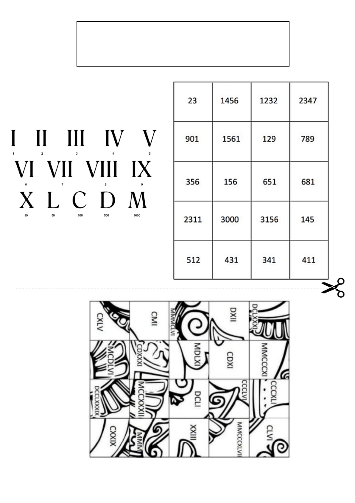 Recorte as peças e cole os números romanos nos números hindu-arábicos correspondentes: QUEBRA-CABEÇA DOS NÚMEROS ROMANOS