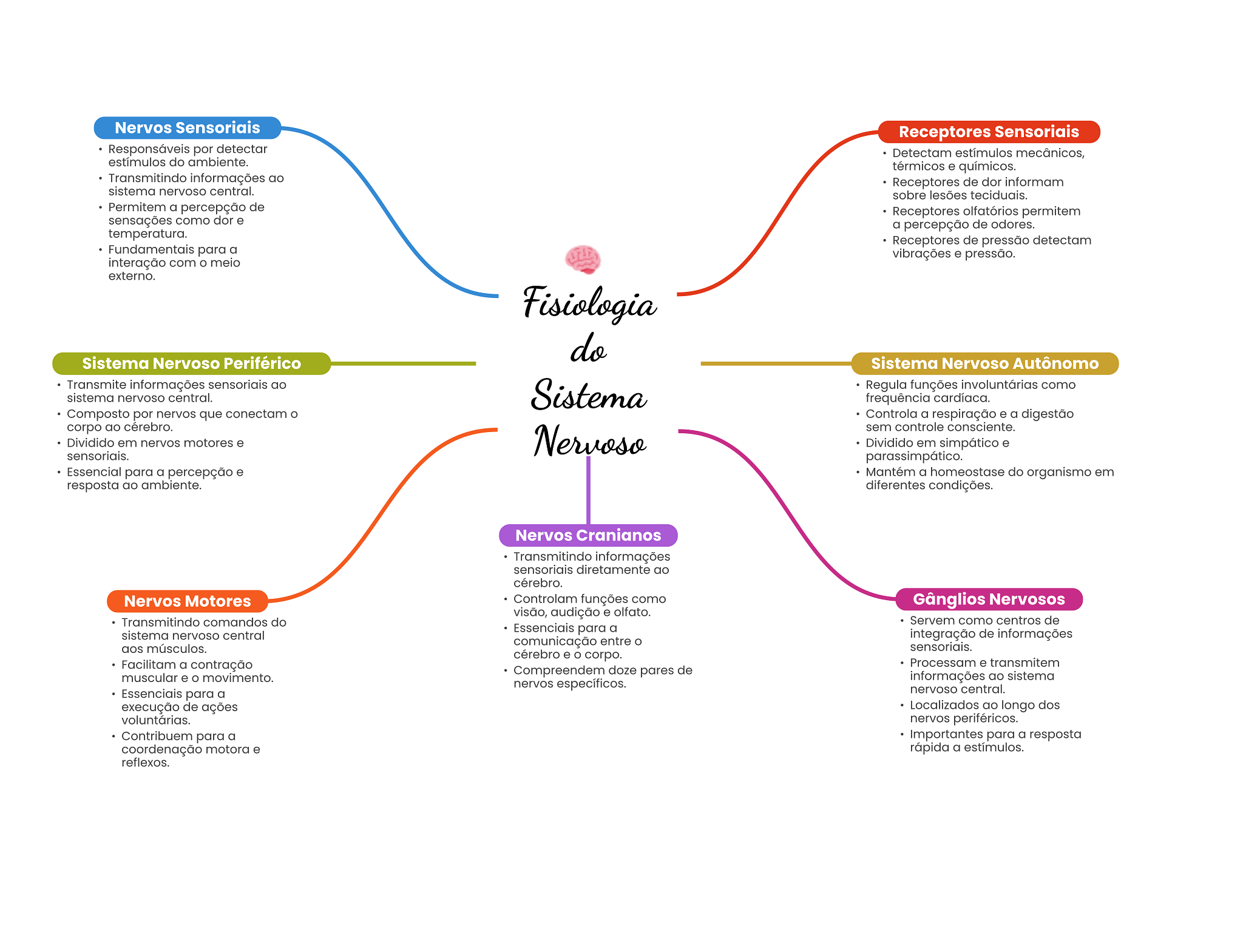 Nervos Sensoriais Receptores Sensoriais Responsáveis por detectar Detectam estímulos mecânicos, estímulos do ambiente. térmicos e químicos. Transmitindo informações ao Receptores de dor informam sistema nervoso central. sobre lesões teciduais. Permitem a percepção de Receptores olfatórios permitem sensações como dor e a percepção de odores. temperatura. Receptores de pressão detectam Fundamentais para a vibrações e pressão. interação com meio externo. Fisiologia do Sistema Nervoso Periférico Sistema Nervoso Autônomo Transmite informações sensoriais ao Sistema Regula funções involuntárias como sistema nervoso central. frequência cardíaca. Composto por nervos que conectam Controla a respiração e a digestão corpo ao cérebro. sem controle consciente. Dividido em nervos motores e Nervoso Dividido em simpático e sensoriais. parassimpático. Essencial para a percepção e Mantém a homeostase do organismo em resposta ao ambiente. diferentes condições. Nervos Cranianos Transmitindo informações sensoriais diretamente ao cérebro. Nervos Motores Controlam funções como Gânglios Nervosos visão, audição e olfato. Transmitindo comandos do Servem como centros de Essenciais para a sistema nervoso central integração de informações aos músculos. comunicação entre O sensoriais. cérebro e corpo. Facilitam a contração Processam e transmitem Compreendem doze pares de muscular e movimento. informações ao sistema nervos específicos. Essenciais para a nervoso central. execução de ações Localizados ao longo dos voluntárias. nervos periféricos. Contribuem para a Importantes para a resposta coordenação motora e rápida a estímulos. reflexos.