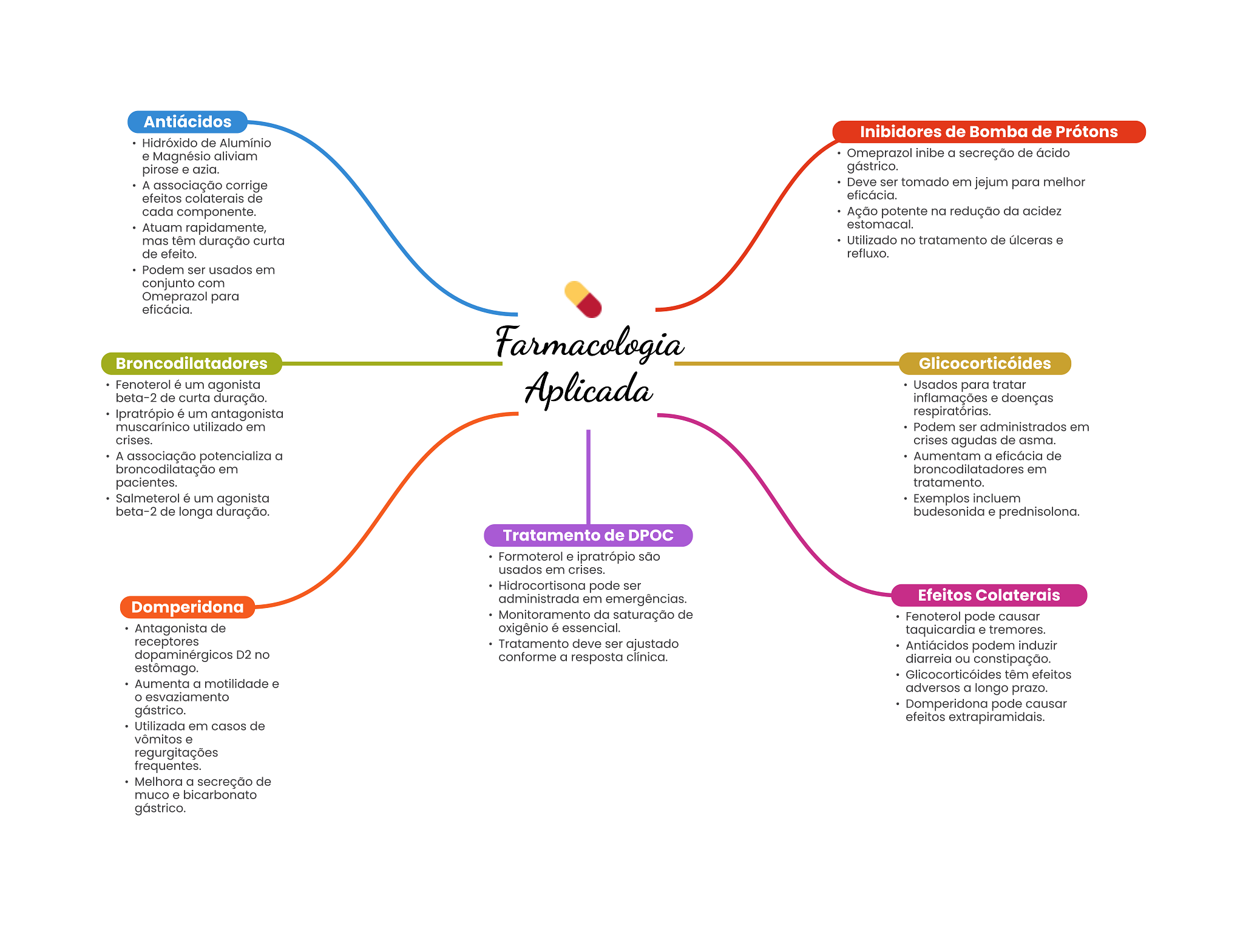 Antiácidos Inibidores de Bomba de Prótons Hidróxido de Alumínio e Magnésio aliviam Omeprazol inibe a secreção de ácido pirose e azia. gástrico. A associação corrige Deve ser tomado em jejum para melhor efeitos colaterais de eficácia. cada componente. Ação potente na redução da acidez Atuam rapidamente, estomacal. mas têm duração curta Utilizado no tratamento de úlceras e de efeito. refluxo. Podem ser usados em conjunto com Omeprazol para eficácia. Farmacologia Broncodilatadores Glicocorticóides Fenoterol é um agonista Aplicada Usados para tratar beta-2 de curta duração. inflamações e doenças Ipratrópio é um antagonista respiratórias. muscarínico utilizado em Podem ser administrados em crises. crises agudas de asma. A associação potencializa a Aumentam a eficácia de broncodilatação em broncodilatadores em pacientes. tratamento. Salmeterol é um agonista Exemplos incluem beta-2 de longa duração. budesonida e prednisolona. Tratamento de DPOC Formoterol e ipratrópio são usados em crises. Hidrocortisona pode ser administrada em emergências. Efeitos Colaterais Domperidona Monitoramento da saturação de Fenoterol pode causar Antagonista de oxigênio é essencial. taquicardia e tremores. receptores Tratamento deve ser ajustado Antiácidos podem induzir dopaminérgicos D2 no conforme a resposta clínica. diarreia ou constipação. estômago. Glicocorticóides têm efeitos Aumenta a motilidade e adversos a longo prazo. esvaziamento gástrico. Domperidona pode causar efeitos extrapiramidais. Utilizada em casos de vômitos e regurgitações frequentes. Melhora a secreção de muco e bicarbonato gástrico.