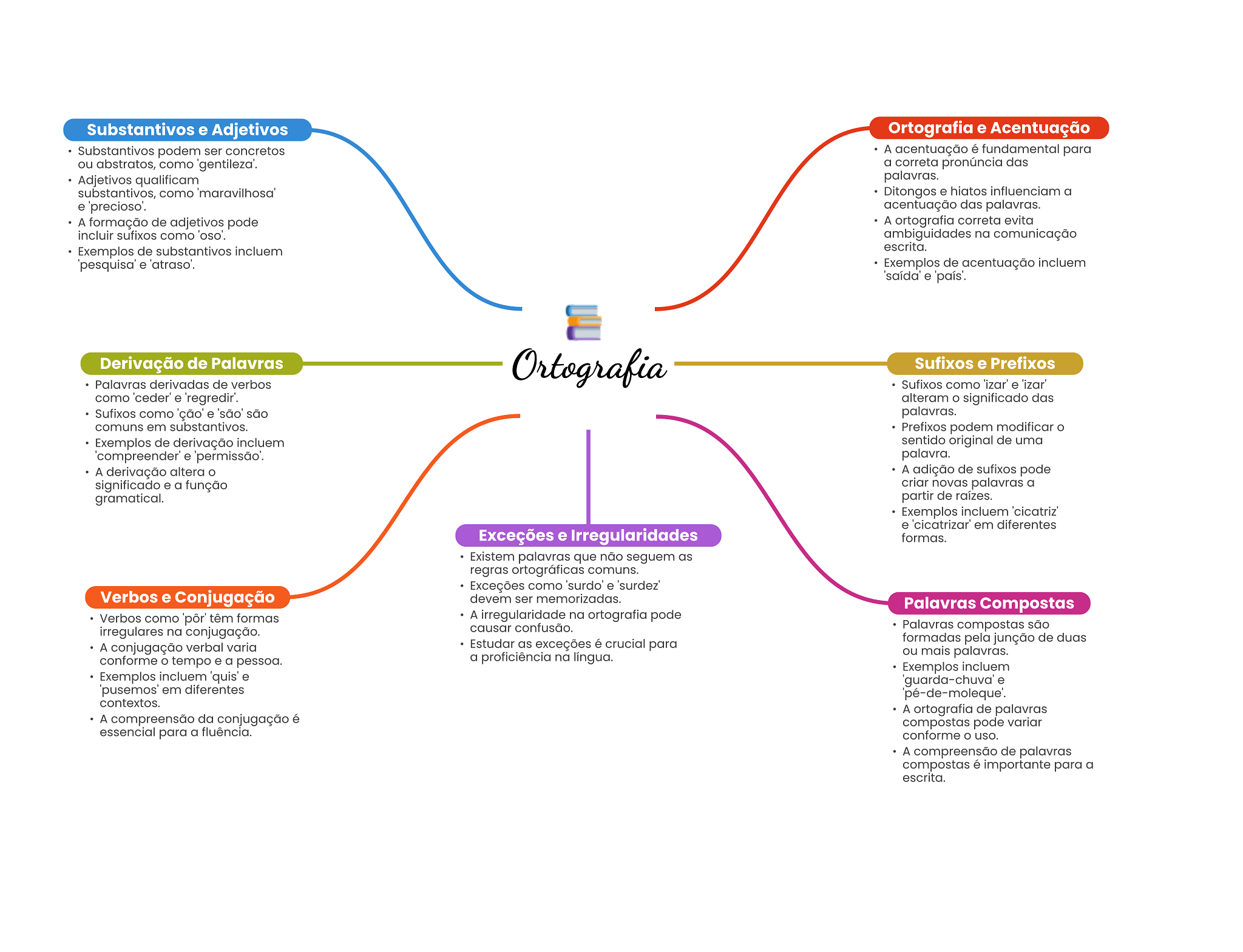 Substantivos e Adjetivos Ortografia e Acentuação Substantivos podem ser concretos A acentuação é fundamental para ou abstratos, como a correta pronúncia das Adjetivos qualificam palavras. substantivos, como 'maravilhosa' Ditongos e hiatos influenciam a e 'precioso'. acentuação das palavras. A formação de adjetivos pode A ortografia correta evita incluir sufixos como 'oso'. ambiguidades na comunicação Exemplos de substantivos incluem escrita. e 'atraso'. Exemplos de acentuação incluem 'saída' e Derivação de Palavras Ortografia Sufixos e Prefixos Palavras derivadas de verbos Sufixos como 'izar' e 'izar' como 'ceder' e 'regredir'. alteram significado das Sufixos como 'ção' e 'são' são palavras. comuns em substantivos. Prefixos podem modificar Exemplos de derivação incluem sentido original de uma e 'permissão'. palavra. A derivação altera A adição de sufixos pode significado e a função criar novas palavras a gramatical. partir de raízes. Exemplos incluem 'cicatriz' e 'cicatrizar' em diferentes Exceções e Irregularidades formas. Existem palavras que não seguem as regras ortográficas comuns. Exceções como 'surdo' e 'surdez' Verbos e Conjugação devem ser memorizadas. Palavras Compostas Verbos como 'pôr' têm formas A irregularidade na ortografia pode irregulares na conjugação. causar confusão. Palavras compostas são A conjugação verbal varia Estudar as exceções é crucial para formadas pela junção de duas a proficiência na língua. ou mais palavras. conforme tempo e a pessoa. Exemplos incluem Exemplos incluem 'quis' e e em diferentes pé-de-moleque'. contextos. A ortografia de palavras A compreensão da conjugação é compostas pode variar essencial para a fluência. conforme uso. A compreensão de palavras compostas é importante para a escrita.