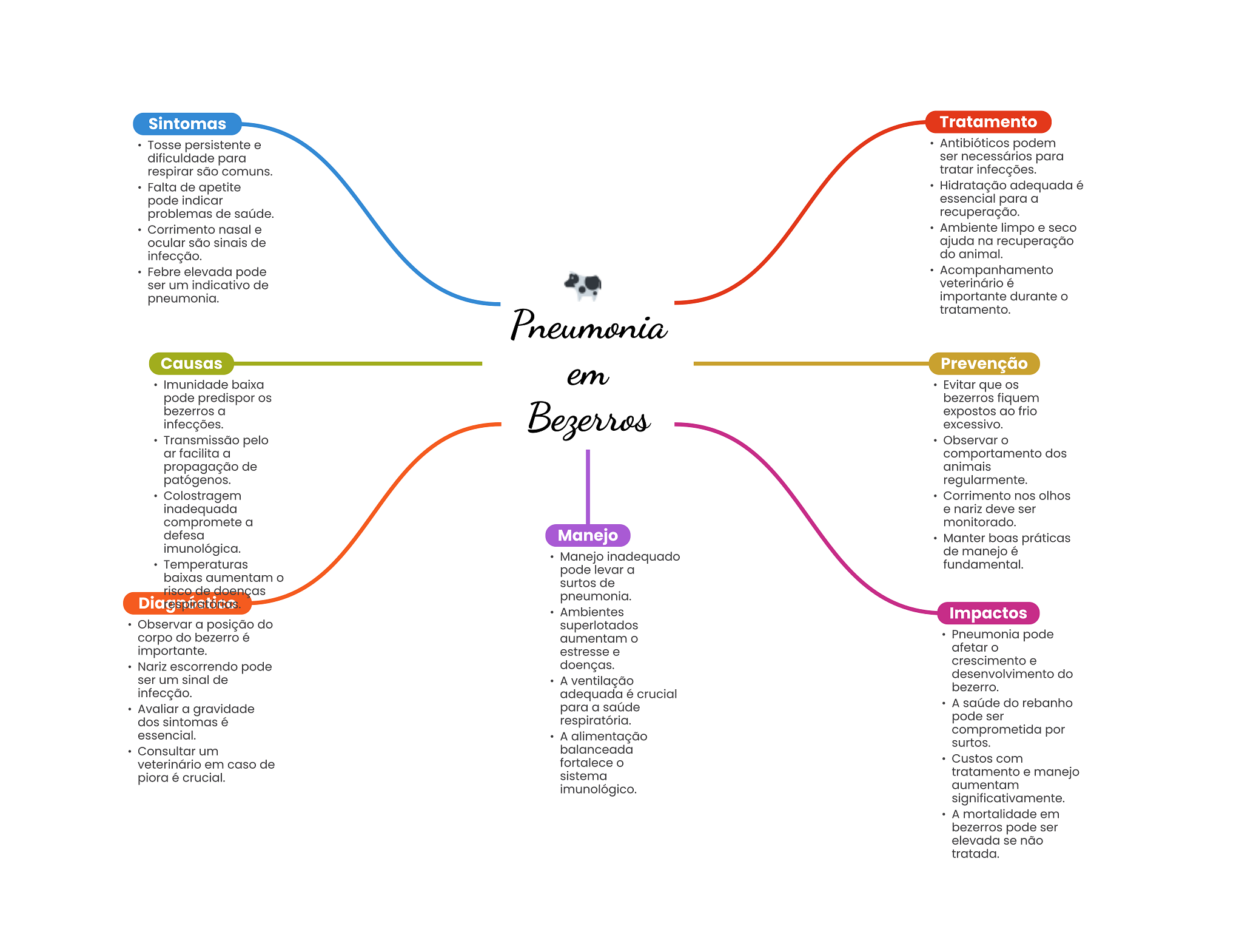 Sintomas Tratamento Tosse persistente e Antibióticos podem dificuldade para ser necessários para respirar são comuns. tratar infecções. Falta de apetite Hidratação adequada é pode indicar essencial para a problemas de saúde. recuperação. Corrimento nasal e Ambiente limpo e seco ocular são sinais de ajuda na recuperação infecção. do animal. Febre elevada pode Acompanhamento ser um indicativo de veterinário é pneumonia. importante durante tratamento. Pneumonia Causas Prevenção Imunidade baixa em Evitar que pode predispor bezerros fiquem bezerros a infecções. Bezerros expostos ao frio excessivo. Transmissão pelo Observar ar facilita a comportamento dos propagação de animais patógenos. regularmente. Colostragem Corrimento nos olhos inadequada e nariz deve ser compromete a monitorado. defesa Manejo Manter boas práticas imunológica. Manejo inadequado de manejo é Temperaturas fundamental. pode levar a baixas aumentam surtos de risco de doenças pneumonia. Ambientes Impactos Observar a posição do superlotados corpo do bezerro é aumentam Pneumonia pode importante. estresse e afetar doenças. crescimento e Nariz escorrendo pode desenvolvimento do ser um sinal de A ventilação bezerro. infecção. adequada é crucial Avaliar a gravidade para a saúde A saúde do rebanho dos sintomas é respiratória. pode ser essencial. A alimentação comprometida por surtos. Consultar um balanceada veterinário em caso de fortalece Custos com piora é crucial. sistema tratamento e manejo imunológico. aumentam significativamente. A mortalidade em bezerros pode ser elevada se não tratada.