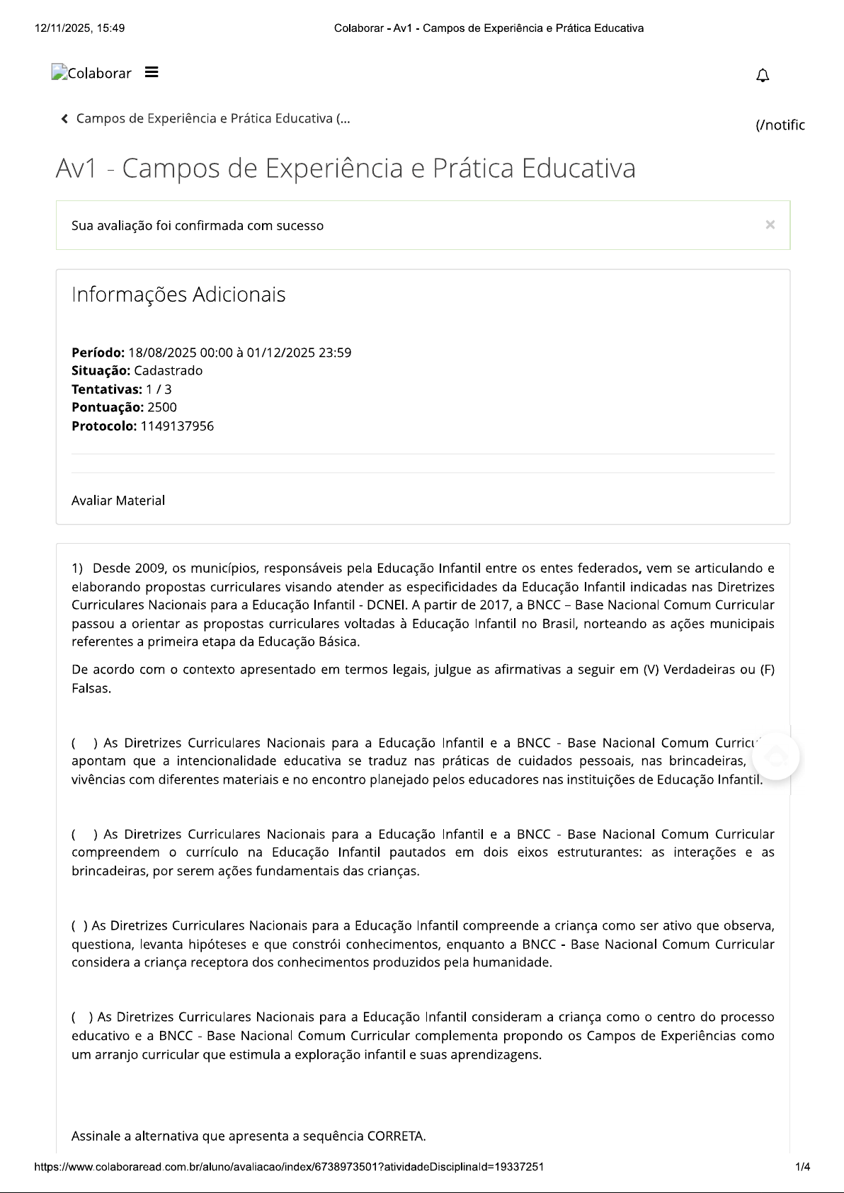 12/11/2025, 15:49 Colaborar Av1 Campos de Experiência e Prática Educativa Colaborar ≡12/11/2025, 15:49 Colaborar Av1 Campos de Experiência e Prática Educativa Alternativas: a) V-V-F-F. b) F-V-F-F. Alternativa assinalada e) 2) A documentação pedagógica é um instrumento que dá elementos para que o educador reflita, organize, planeje contextos educativos, se coloque como mediador, promova interações, monitore as práticas educativas de forma a garantir a pluralidade de situações que proporcionem desenvolvimento integral das crianças. Além disso, é preciso observar a trajetória de cada criança: suas conquistas, avanços, possibilidades e aprendizagens durante seu processo educativo. Considerando esse contexto, analise as seguintes afirmativas: Através de diferentes registros como relatórios, portfólios, fotografias, desenhos e textos é possível analisar as práticas educativas vivenciadas na Educação Infantil e verificar as aprendizagens infantis. Os registros realizados acerca do cotidiano nas instituições de Educação Infantil é possível reunir elementos para reorganizar tempos, espaços e situações que garantam os direitos de aprendizagem de todas as crianças. III Os registros fotográficos realizados pelas creches e pré-escolas tem papel de socializar com as famílias as experiências infantis, além de subsidiar planejamento dos espaços, materiais e tempos nas instituições de Educação Infantil. Considerando as informações apresentadas, é correto que se afirmar em: Alternativas: a) I, e III. Alternativa assinalada b) e III apenas. c) apenas. d) apenas. e) III apenas. 3) A Base Nacional Comum Curricular BNCC (BRASIL, 2017) resgata as vivências e os conhecimentos construídos pelas crianças conectando-os com as propostas pedagógicas das creches e pré-escolas, com objetivo de ampliar o universo de suas experiências, conhecimentos e habilidades, complementando à educação familiar. Considerando esse contexto, analise as seguintes afirmativas: A BNCC considera que a Educação Infantil é um espaço de construção do conhecimento de forma interativa, unindo as experiências das crianças com os conhecimentos sistematizados cientificamente. A BNCC decide quais os conteúdos devem constar no currículo da Educação Infantil, padronizando a educação, assim, as experiências infantis apenas complementam o currículo básico estabelecido. 2/412/11/2025, 15:49 Colaborar Av1 Campos de Experiência e Prática Educativa III A BNCC considera que a educação familiar deve ser foco do currículo em construção, considerando os princípios e valores de cada família, guiando a educação das crianças através do homeschooling, ou seja, educação familiar. Considerando as informações apresentadas, é correto que se afirmar em: Alternativas: a) I, e III. b) e III, apenas. c) I, apenas. Alternativa assinalada d) II, apenas. e) III, apenas. 4) A cultura lúdica acontece a partir da interação social, do contato direto ou indireto, seja com os jogos, brincadeiras, brinquedo/objeto ou mesmo com os indivíduos que dela participam e tem suas raízes na interação entre a mãe e o bebê. Estudiosos do brincar afirmam ainda que através das brincadeiras a criança aprende sobre o mundo social e físico a sua volta, de forma lúdica. Considerando esse contexto, analise as seguintes afirmativas: Kishimoto (2011) aponta algumas modalidades de brincadeiras na educação infantil que pode nos ajudar a criar relações entre 0 lúdico e aprendizagem, são elas: brinquedo educativo, brincadeiras tradicionais infantis, brincadeiras de faz-de-conta e brincadeiras de construção. Todo jogo infantil é educativo, inclusive o jogo livre, pois todos desempenham um papel importante no desenvolvimento da criança, proporcionando diferentes interações e forma de se relacionar com os objetos e os espaços. III As brincadeiras tradicionais são manifestações da cultura popular e tem a função de perpetuar a cultura infantil e desenvolver formas de convivência social. Considerando as informações apresentadas, é correto que se afirmar em: Alternativas: a) I, e III. Alternativa assinalada b) e III apenas. c) le III apenas. d) apenas. e) III apenas. 5) brincar exploratório, ou seja, o brincar heurístico é um tipo de brincadeira que propõe descobertas a partir da exploração dos objetos, funcionando como uma jornada de surpresas para as crianças que estão trilhando o caminho do conhecimento de si e do mundo. Desde bebês aprendemos a partir dos sentidos, sendo fundamental estimular a exploração como estratégia para a aprendizagem. Considerando o direito de explorar e sua contribuição para a aprendizagem infantil, analise as seguintes afirmativas: Nesse tipo de brincadeira as crianças desfrutam de uma atmosfera onde exploram de maneira autônoma os objetos, de acordo com as ações que desejam fazer. 3/412/11/2025, 15:49 Colaborar Av1 Campos de Experiência e Prática Educativa Quando as crianças ainda são bebês, 0 brincar heurístico pode ser preparado pelo professor com objetos sensoriais para que as crianças manipulem com segurança, mas sem limitar suas descobertas. III uso de objetos sensoriais é uma forma de assegurar a riqueza de experiências dos bebês em um momento em que cérebro está pronto para receber, fazer conexões e assim utilizar essas informações. Considerando as informações apresentadas, é correto que se afirmar em: Alternativas: a) I, e III. Alternativa assinalada b) e III apenas. c) le II apenas. d) apenas. e) III apenas. 4/4