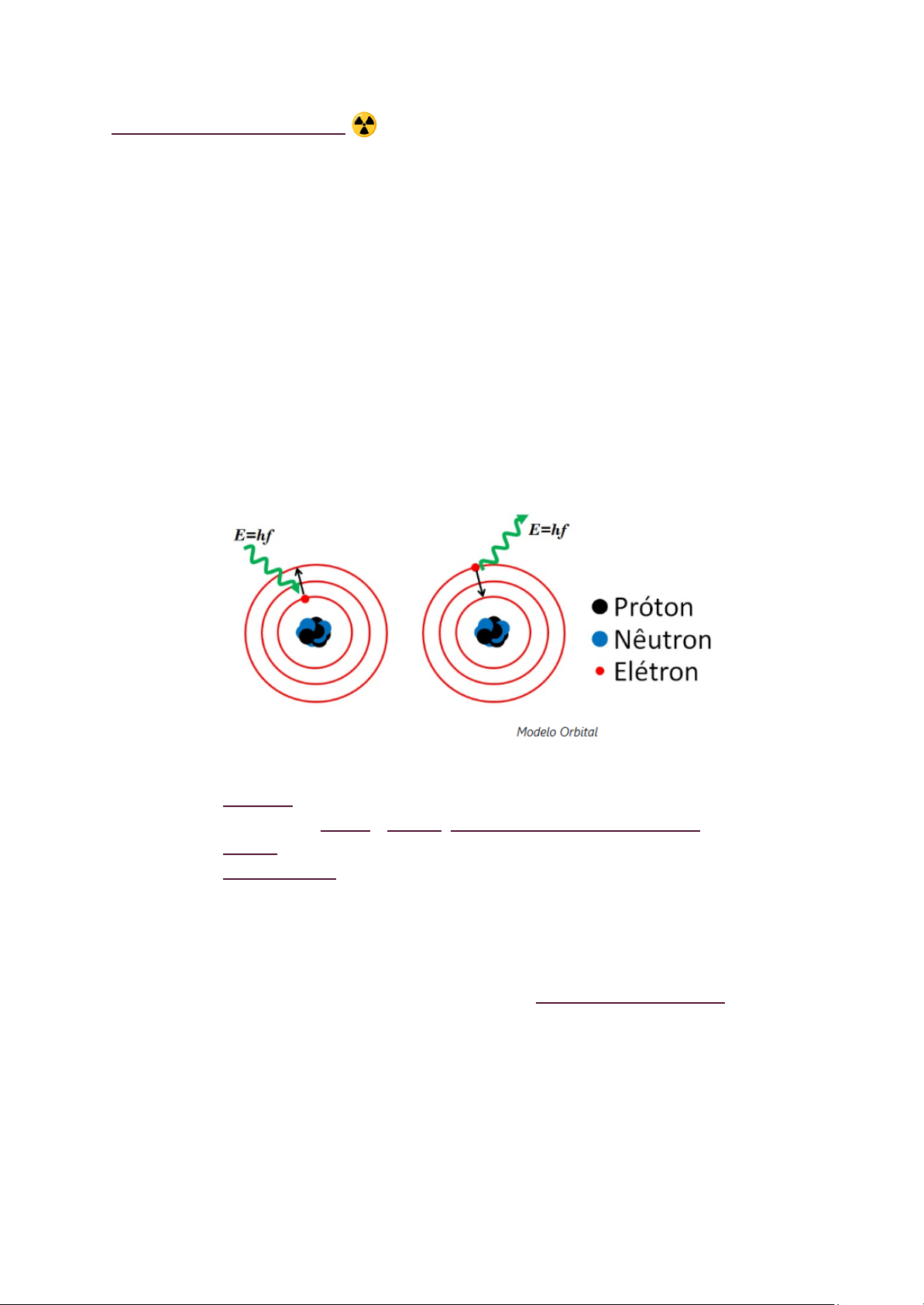 Radiações Corpusculares ☢ ● Radiação corpuscular é a emissão de porções de matéria na forma de partículas elementares, a partir de um núcleo atômico instável; ● Elementos radioativos: aqueles que possuem a capacidade de emissão de partículas; ● Elementos da tabela que possuem o número atômico (Z) maior que 83 são instáveis, portanto são radioativos; ● O núcleo atômico instável possui energia armazenada e essa tende a se dissipar com o passar do tempo; ● Características físicas das partículas atômicas: - O movimento dos elétrons ao redor do núcleo é em órbitas circulares; - órbitas circulares= camadas eletrônicas, que possuem diferentes distâncias do núcleo e diferentes níveis de energia (quanto mais externa a camada, mais energia ela possui); - O elétron pode saltar entre as camadas, ao saltar para uma camada mais externa irá absorver energia e quando retorna para a camada anterior emite a mesma intensidade de energia absorvida; - ● Modelo Padrão: é a teoria que fala sobre a existência de duas classes de partículas: - Férmions: aquelas que constituem a matéria. Existem doze tipos, que se agrupam em quarks e léptons: quark up (U) e quark down (D); - Bósons: aquelas que são carreadoras de força; - Quarks U e D possuem carga elétrica fracionada, essas partículas se agrupam e formam uma tríade para poder dar origem aos prótons (2 quarks u e 1 quark d) e nêutrons (2 quarks d e 1 quark u); - É possível, a partir desse modelo, supor que um nêutron pode se tornar um próton a partir da perda de um D e ganho de um U, e vice-versa; - O que mantém essas partículas unidas é a força nuclear forte (FNF); - A FNF só atua em distâncias pequenas, portanto quanto mais afastadas as partículas estiverem, menos força de atração elas terão; - A FNF é o que mantém os neutrons e protons fortemente unidos, formando assim o núcelo; ● Nucleossíntese estelar: - Força da gravidade tende a compactar a matéria dentro do menor espaço possível e ela tende a atuar sobre tudo que possui massa, isso inclui moléculas gasosas; - Dentro de uma estrela, a força da gravidade atua de uma maneira muito intensa, de modo que os átomos de hidrogênio fiquem cada vez mais próximos uns dos outros, gerando um aumento de pressão e temperatura, acelerando cada vez mais os átomos de hidrogênio. Com isso, a energia cinética se torna maior que a força de repulsão elétrica entre eles, e com isso se chocam entre si, portanto a FNF “gruda” os núcleos formando um núcleo de Hélio. Esse processo se chama fusão nuclear; - Fusão Nuclear é quando dois núcleos mais leves se juntam e formam um núcleo mais pesado; - Quanto mais pesado for o núcleo, ou seja, quanto mais prótons tiver, maior será a carga elétrica, o que significa que maior terá que ser a energia cinética para vencer a força elétrica de repulsão; - Para que uma estrela se mantenha viva, a força da gravidade irá comprimir a estrela, para colapsa-la, enquanto isso a energia gerada pela fusão nuclear irá fazer o contrário e com a mesma intensidade, fazendo com que ela se expanda. Isso se chama sequência principal da estrela, em que ela não se expande ao ponto de desintegrar e nem colapsa a ponto de explodir; - - SUPERNOVA: a energia de expansão térmica diminui muito, portanto a contração gravitacional se torna predominante, então a estrela se contrai gradativamente ao ponto em que a pressão e a temperatura aumentem e levem a explosão da estrela; - - É durante a explosão da estrela que há a fusão de muitos núcleos e a geração de elementos mais pesados; - A energia gerada a partir dessa fusão é tão intensa que é transformada em matéria; Radiações eletromagnéticas ● A fonte das radiações eletromagnéticas emitem energia na forma de fótons que se propagam na velocidade da luz; ● A energia transportada nessa propagação é classificada em diferentes categorias que dependem do comprimento da onda; ● Um campo magnético variável no tempo gera um campo elétrico e um campo elétrico variável no tempo gera um campo magnético; ● - O sentido do campo magnético irá depender do sentido da corrente; - Quando a corrente é direcionada para cima, o campo eletromagnético será no sentido anti-horário, enquanto se a corrente é direcionada para baixo, o campo eletromagnético será no sentido horário; - Caso haja um condutor com corrente alternada, alternando continuamente o sentido da corrente, o campo magnético também irá alternar seguindo o fluxo contrário da corrente, compondo assim uma onda senoidal; - - Levando em consideração que os campos magnéticos e elétricos são perpendiculares entre si, a composição da onda eletromagnética que se propaga no espaço como radiação eletromagnética; - ● O espectro eletromagnético irá variar de acordo com a frequência da onda, ou seja, é medido de acordo com quantas vezes um fenômeno se repete em uma unidade de tempo. A unidade de medida da frequência é o Hertz (Hz= 1/s); ● ● Portanto, a frequência das ondas eletromagnéticas irá variar de acordo com quantas vezes esse ciclo completo ocorre a cada segunda; ● Corrente elétrica = carga elétrica em movimento; ● Quanto mais rápido irá se alternar a corrente elétrica, mais energia carrega a onda eletromagnética que será gerada; ● E= h*f, em que E é a energia transportada, f é a frequência da onda e h é a constante de Plank; ● ● As ondas eletromagnéticas são contínuas em sua extensão, sendo que cada faixa de frequência é produzida por diferentes tipos de fontes; ● Usina nuclear solar: no centro do sol as condições de densidade, pressão e temperatura proporcionam a ocorrência de fusão nuclear, que originam onda eletromagnéticas de altas frequências; - Os fótons acelerados que compõem esse tipo de radiação perdem muita energia e interagem de maneira aleatória com as partículas do plasma 