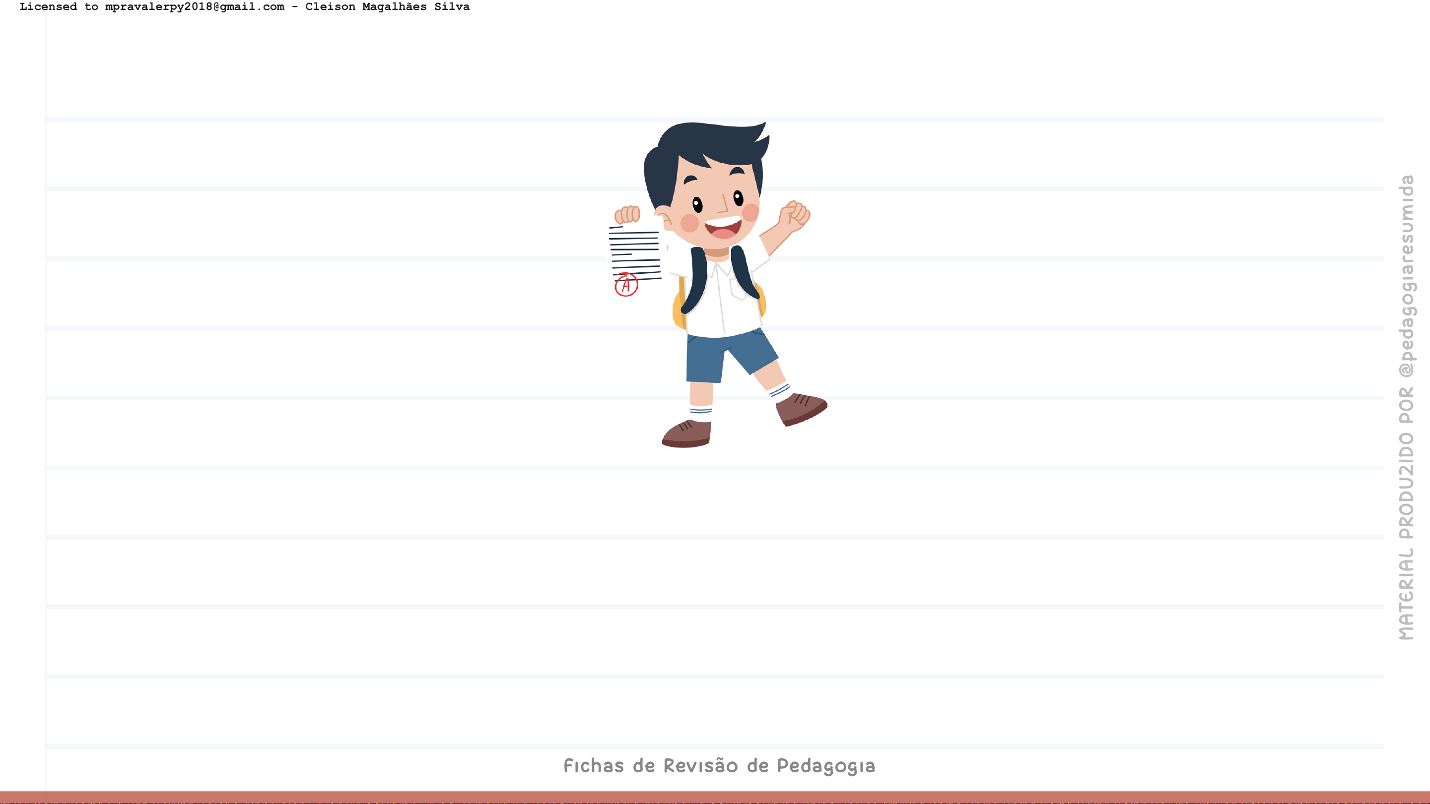 Avaliação Escolar Fichas de Revisão de Pedagogia M A TE RI A L PR O DU ZI DO P O R @ pe da go gi ar es um id a Licensed to mpravalerpy2018@gmail.com - Cleison Magalhães Silva Questão de prova José Carlos Libâneo A avaliação é a didática necessária e permanente do trabalho docente que acompanha passo a passo do ensino-aprendizagem do aluno, por meio dos resultados que vão sendo obtidos no decorrer... “É uma tarefa complexa que não se resume à realização de provas e atribuição de notas.” “Cumpre funções pedagógico-didáticas, de diagnóstico e de controle em relação às quais se recorre a instrumentos de verificação do rendimento escolar.” M A TE RI A L PR O DU ZI DO P O R @ pe da go gi ar es um id a Avaliação Escolar Fichas de Revisão de Pedagogia Do trabalho conjunto entre PROFESSOR E ALUNO “Reflexão sobre o nível de qualidade do trabalho escolar do professor e aluno.” É de responsabilidade do DOCENTE e normalmente no procedimento formal acontece por parte do professor em relação ao aluno. Licensed to mpravalerpy2018@gmail.com - Cleison Magalhães Silva Questão de prova Luckesi M A TE RI A L PR O DU ZI DO P O R @ pe da go gi ar es um id a Avaliação Escolar Fichas de Revisão de Pedagogia A avaliação é definida como um julgamento de valor sobre manifestações relevantes da realidade, tendo em vista uma tomada de decisão. Luis Carlos Freitas Compõe-se das práticas que envolvem o uso de instrumentos explícitos de avaliação cujos resultados podem ser examinados objetivamente pelo aluno, à luz de um procedimento claro. Consiste na construção, pelo professor, de juízos gerais sobre o aluno, cujo processo de constituição está encoberto e é aparentemente assistemático. Avaliação formal Avaliação informal Ex.: testes, provas... Ex.: encorajamento, ameaças... Licensed to mpravalerpy2018@gmail.com - Cleison Magalhães Silva → Diagnóstica: início do processo, verifica pré-requisitos. → Formativa: processual ( ao longo do processo) - qualitativa. → Somativa: avaliação quantitativa ao final do processo, função classificadora e final. Funções da avaliação escolar M A TE RI A L PR O DU ZI DO P O R @ pe da go gi ar es um id a Avaliação Escolar Fichas de Revisão de Pedagogia Licensed to mpravalerpy2018@gmail.com - Cleison Magalhães Silva Tarefas da avaliação escolar Coleta de dados (provas, exercícios e testes) sobre o aproveitamento do aluno, por meio de provas, exercícios e tarefas, ou por meios auxiliares, como a observação de desempenho. Verificação: Comprovação de resultados (atribuição de notas). Comprovação dos resultados alcançados em relação aos objetivos e atribuição de notas e conceitos. Qualificação: M A TE RI A L PR O DU ZI DO P O R @ pe da go gi ar es um id a Avaliação de fato (resultados). Avaliação propriamente dita dos resultados alcançados em relação aos objetivos e atribuição de notas e conceitos. Apreciação qualitativa: Avaliação Escolar Fichas de Revisão de Pedagogia Licensed to mpravalerpy2018@gmail.com - Cleison Magalhães Silva Funções da Avaliação Escolar É verificar o quanto do conteúdo ensinado foi absorvido pelos alunos, bem como analisar se eles estão conseguindo acompanhar a programação curricular. São três: Pedagógico-didática, diagnóstica e controle. M A TE RI A L PR O DU ZI DO P O R @ pe da go gi ar es um id a Avaliação Escolar Fichas de Revisão de Pedagogia Licensed to mpravalerpy2018@gmail.com - Cleison Magalhães Silva Diagnóstico: identificar progressos e dificuldades dos alunos e a atuação do professor que ajudam nas modificações do processo. Questão de prova Controle: meios de frequência das verificações dos resultados possibilitando o diagnóstico. Controle sistemático e contínuo do processo. Pedagógico-didática: cumprimento dos objetivos gerais e específicos da educação. Servindo ou não para evidenciar o atendimento das finalidades e contribuindo para a assimilação. M A TE RI A L PR O DU ZI DO P O R @ pe da go gi ar es um id a Avaliação Escolar Fichas de Revisão de Pedagogia No final: Avaliar o resultado global do processo; Pode ser no final de uma unidade, bimestre ou ano letivo. No início: Sondagem, diagnosticar condições prévias dos alunos; Durante: Acompanhar o progresso dos alunos; Fornecimento de informações ao professor; Apreciar resultados, corrigir falhas, esclarecer dúvidas, estimular, etc. Licensed to mpravalerpy2018@gmail.com - Cleison Magalhães Silva As abordagens pedagógicas e a avaliação escolar As abordagens que irão permear todos os conceitos pedagógicos são: M A TE RI A L PR O DU ZI DO P O R @ pe da go gi ar es um id a As abordagens pedagógicas envolvem diversas dimensões da pedagogia, incluindo a AVALIAÇÃO. Devemos sempre pensar nessas abordagens de forma interligada aos conteúdos, já que são eles que irão dar base de filosofias e conceitos, a fim de que haja um entendimento total da pedagogia. Avaliação Escolar → Abordagem tradicional → Abordagem Escolanovista/Cognitivista → Abordagem Tecnicista/Comportamentalista → Abordagem Libertária/Humanística → Abordagem Libertadora/Sociocultural → Abordagem Histórico-crítica Fichas de Revisão de Pedagogia Licensed to mpravalerpy2018@gmail.com - Cleison Magalhães Silva Classificatória, vertical, quantitativa, exatidão na reprodução.Tradicional Escolanovista/ Cognitivista Aspectos afetivos são levados em conta, autoavaliação, desenvolvimento individual. Busca verificar se o aluno já adquiriu noções, realizou operações por meio de produções livres. Tecnicista/ Comportamentalista Comportamento desejado, livros didáticos, exercícios programados, behavorismo. Não ocorre apenas ao final do processo. Atingir objetivos de comportamentos propostos. Não há avaliação, não-diretiva, nega qualquer padronização de estratégia e procedimentos. Libertária /Humanística M A TE RI A L PR O DU
