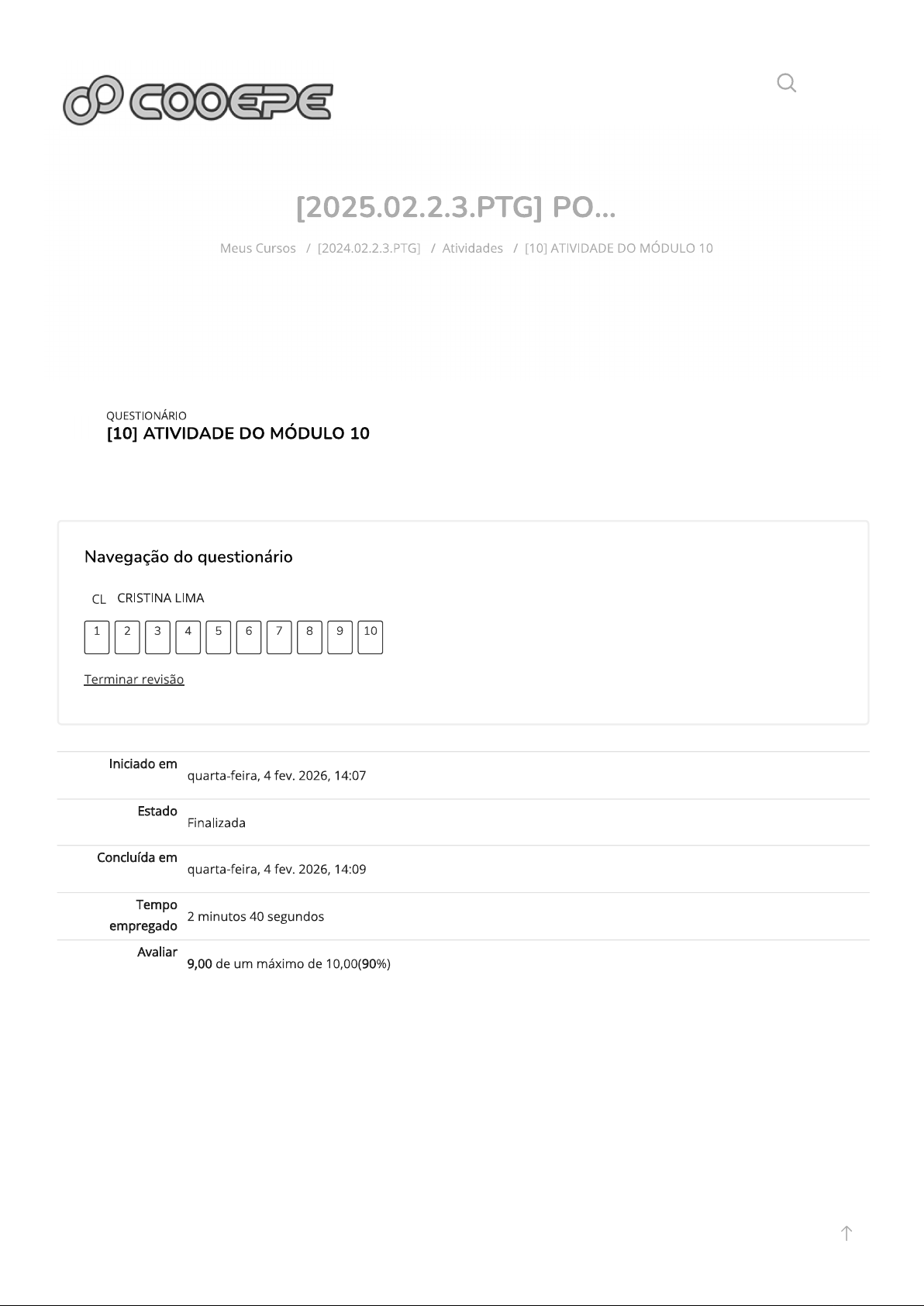 COOEPE [2025.02.2.3.PTG] PO... Meus Cursos / [2024.02.2.3.PTG] / Atividades / [10] ATIVIDADE DO MÓDULO 10 QUESTIONÁRIO [10] ATIVIDADE DO MÓDULO 10 Navegação do questionário CL CRISTINA LIMA 12345678910 Terminar revisão Iniciado em quarta-feira, 4 fev. 2026, 14:07 Estado Finalizada Concluída em quarta-feira, 4 fev. 2026, 14:09 Tempo 2 minutos 40 segundos empregado Avaliar 9,00 de um máximo de 10,00(90%)QUESTÃO 1 Correto Atingiu 1,00 de 1,00 Estudamos que o verbo Assistir no sentido de prestar assistência, dar ajuda, é empregado preferencialmente como transitivo direto, ou seja, sem uso de preposição. Assinale a única alternativa na qual o verbo assistir é transitivo direto: Escolha uma opção: a. Todos assistiam à briga estarrecidos. b. prefeito assistia razão de gabar-se. C. médico assistia os enfermos na emergência d. Todos assistiram ao último filme de Robin Williams. Sua resposta está correta. A resposta correta é: médico assistia os enfermos na emergência Correto Notas para este envio: 1,00/1,00.QUESTÃO 2 Correto Atingiu 1,00 de 1,00 Carlos Drummond de Andrade foi um grande representante dos poetas da segunda fase do modernismo. O poema seguir causou grande alvoroça na época em que foi escrito. Conheça-o: No meio do caminho tinha uma pedra Tinha uma pedra no meio do caminho Tinha uma pedra No meio do caminho tinha uma pedra Nunca me esquecerei desse acontecimento Na vida de minhas retinas tão fatigadas Nunca me esquecerei que no meio do caminho Tinha uma pedra Tinha uma pedra no meio do caminho No meio do caminho tinha uma pedra. Essa pedra no meio do caminho só não pode ser: Escolha uma opção: a. Desânimo b. Tristeza C. Fraqueza d. Problemas e. Entusiasmo_ Sua resposta está correta. A resposta correta é: Entusiasmo_ Correto Notas para este envio: 1,00/1,00.QUESTÃO 3 Correto Atingiu 1,00 de 1,00 Numa cidade, os motoristas de ônibus urbanos estavam em greve por melhores salários. Certo dia, um jornal da cidade publicou, a esse respeito, a seguinte manchete: Motoristas que receberam aumento voltaram ao trabalho. Uma pessoa lê a notícia e diz a alguém: "_ jornal está noticiando que a greve dos motoristas acabou". A respeito desta frase pode-se afirmar: Escolha uma opção: a. Apenas uma parte dos motoristas ganhou aumento e só estes voltaram ao trabalho, os demais continuam em greve. b. Nenhuma das alternativas está correta. C. A pessoa interpretou a manchete corretamente, pois através dela podemos afirmar que todos os motoristas voltaram ao trabalho e todos ganharam aumento. Sua resposta está correta. A resposta correta é: Apenas uma parte dos motoristas ganhou aumento e só estes voltaram ao trabalho, os demais continuam em greve. Correto Notas para este envio: 1,00/1,00.QUESTÃO 4 Correto Atingiu 1,00 de 1,00 Suas obras traduzem a opressão que meio natural e as estruturas sociais exercem sobre o homem, apresentando a mais alta tensão entre eu e o social. Luís da Silva torna-se assassino, Fabiano, um retirante, e Paulo Honório, totalmente desprovido de sensibilidade. A afirmação acima refere-se à obra de: Escolha uma opção: a. Machado de Assis. b. Jorge Amado. C. Graciliano Ramos. d. Lima Barreto. e. José Lins do Rego. Sua resposta está correta. A resposta correta é: Graciliano Ramos. Correto Notas para este envio: 1,00/1,00.QUESTÃO 5 Correto Atingiu 1,00 de 1,00 Assinale a alternativa INCORRETA, quanto a ortografia. Escolha uma opção: a. herói. b. pólen. C. idéia. d. café. Sua resposta está correta. A resposta correta é: idéia. Correto Notas para este envio: 1,00/1,00.QUESTÃO 6 Correto Atingiu 1,00 de 1,00 É um prosador da segunda fase do Modernismo e pertence a Academia Brasileira de Letras. Já esteve preso em razão de suas posições políticas contrárias ao Estado Novo. Dentre as suas produções destacam-se Gabriela Cravo e Canela, Dona Flor e Seus Dois Maridos, País do Carnaval. Estamos nos referindo a: Escolha uma opção: a. José Lins do Rego. b. Jorge Amado de Farias. C. Érico Veríssimo. d. Rachel de Queiroz. Sua resposta está correta. A resposta correta é: Jorge Amado de Farias. Correto Notas para este envio: 1,00/1,00.QUESTÃO 7 Correto Atingiu 0,00 de 1,00 Assinale a alternativa que completa corretamente as lacunas abaixo: Faltou todas as reuniões e recusou-se obedecer decisões da assembléia. Escolha uma opção: a. à à às b. à a às C. a à às d. a a as e. a a às Sua resposta está correta. A resposta correta é: a a - às Correto Notas para envio: 1,00/1,00. De acordo com as tentativas anteriores 0,00/1,00.QUESTÃO 8 Correto Atingiu 1,00 de 1,00 (Professora Sirlene Altmann da Rocha) É um prosador da segunda fase do Modernismo e pertence a Academia Brasileira de Letras. Já esteve preso em razão de suas posições políticas contrárias ao Estado Novo. Dentre as suas produções destacam-se Gabriela Cravo e Canela, Dona Flor e Seus Dois Maridos, O País do Carnaval. Estamos nos referindo a: Escolha uma opção: a. Jorge Amado de Farias. b. Érico Veríssimo. C. José Lins do Rego. d. Rachel de Queiroz. Sua resposta está correta. A resposta correta é: Jorge Amado de Farias. Correto Notas para este envio: 1,00/1,00.QUESTÃO 9 Correto Atingiu 1,00 de 1,00 Use o acento da crase, quando necessário. Assinale a opção correta. a) curso vai começar quatro da tarde. b) Fui Argentina c) Vou pé para o colégio. d) Uma uma as lágrimas caiam do seu rosto. Escolha uma opção: a. as- à- a- a b. às- a- d. às- a- a -a Sua resposta está correta. A resposta correta é: às- à- a- a Correto Notas para este envio: 1,00/1,00.QUESTÃO 10 Correto Atingiu 1,00 de 1,00 Não existe essa coisa de um ano sem Senna, dois anos sem Senna... Não há calendário para a saudade. (Adriane Galisteu, no Jornal do Brasil) Segundo o texto, a saudade: Escolha uma opção: a. É maior na data do falecimento. b. Aumenta a cada ano. C. É maior no primeiro ano. d. É constante. Sua resposta está correta. A r