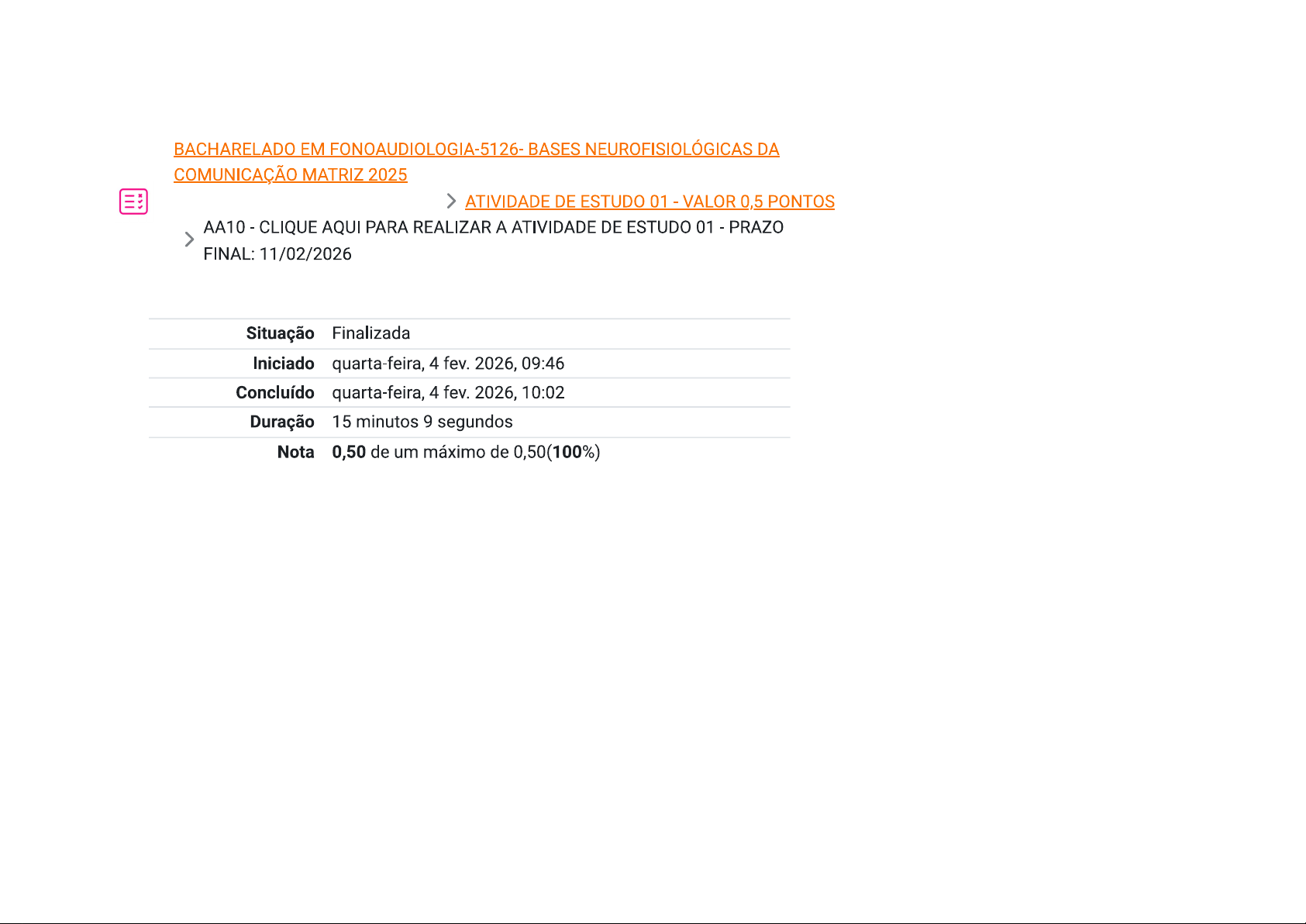 BACHARELADO EM FONOAUDIOLOGIA-5126- BASES NEUROFISIOLÓGICAS DA COMUNICAÇÃO MATRIZ 2025 ATIVIDADE DE ESTUDO 01 - VALOR 0,5 PONTOS AA10 - CLIQUE AQUI PARA REALIZAR A ATIVIDADE DE ESTUDO 01 PRAZO FINAL: 11/02/2026 Situação Finalizada Iniciado quarta-feira, 4 fev. 2026, 09:46 Concluído quarta-feira, 4 fev. 2026, 10:02 Duração 15 minutos 9 segundos Nota 0,50 de um máximo de 0,50(100%)Questão 1 As funções linguísticas não se limitam às áreas de Broca Completo e Wernicke, mas envolvem também regiões associativas e Atingiu 0,05 de sistema límbico, responsável por conferir emoção à 0,05 linguagem. Essa integração transforma a fala em um fenômeno cognitivo e afetivo. Com base nessa perspectiva, qual é o papel do sistema límbico na linguagem humana? Assinale a alternativa correta. a. Atribuir significado emocional ao discurso, integrando sentimento e cognição. b. Coordenar os movimentos articulatórios da fala. Produzir neurotransmissores responsáveis pela audição. d. Armazenar informações lexicais e gramaticais. e. Controlar exclusivamente a respiração e a fonação. Sua resposta está correta.Questão 2 0 Sistema Nervoso Central (SNC) e Sistema Nervoso Completo Periférico (SNP) atuam de forma integrada para coordenar Atingiu 0,05 de as funções vitais e comportamentais. Enquanto SNC 0,05 processa as informações, SNP realiza a comunicação entre corpo e cérebro. De acordo com essas funções, qual alternativa apresenta corretamente a composição do SNP? Assinale a alternativa correta. a. Somente nervos motores. b. Cérebro, tálamo e bulbo raquidiano. Nervos cranianos e espinhais, gânglios e terminações nervosas. d. Encéfalo, medula espinhal e meninges. e. Córtex cerebral e tronco encefálico. Sua resposta está correta.Questão 3 A linguagem é uma das funções mais complexas do Completo córtex cerebral, resultado da integração entre múltiplas Atingiu 0,05 de áreas responsáveis por transformar pensamento em 0,05 expressão verbal. Os lobos frontal, temporal e parietal trabalham de forma coordenada para que o cérebro compreenda sons, formule ideias e as converta em palavras articuladas. Esse processo exige que regiões específicas interpretem os estímulos auditivos e atribuam significado ao que é ouvido. Cada etapa da comunicação, portanto, envolve redes neurais distintas, mas interligadas por sinapses precisas e sincronizadas. Com base nessa relação, qual área cerebral está diretamente associada à compreensão auditiva da linguagem? Assinale a alternativa correta. a. Hipocampo. b. Córtex pré-frontal. Área de Broca. d. Cerebelo. e. Área de Wernicke. Sua resposta está correta.Questão 4 As funções cerebrais superiores envolvem processos Completo complexos como memória, linguagem e aprendizagem. Atingiu 0,05 de Entre os mecanismos de aprendizagem, destacam-se o 0,05 condicionamento clássico e operante, amplamente estudados na neurofisiologia. Qual é a principal diferença entre condicionamento clássico e o operante? Assinale a alternativa correta. a. condicionamento clássico ocorre apenas por repetição mecânica de estímulos, sem relação com respostas voluntárias ou consequências ambientais. b. Clássico é uma forma de aprendizagem que não envolve associação entre estímulos ou comportamentos, já operante sim. C. No condicionamento operante, o aprendizado acontece sem reforço, enquanto no clássico depende exclusivamente da presença de um estímulo neutro. d. condicionamento clássico baseia-se na associação entre estímulos, enquanto operante relaciona comportamentos às suas consequências. e. condicionamento clássico ocorre sem participação de processos cognitivos, enquanto operante é restrito a comportamentos observados em animais.Sua resposta está correta. Questão 5 funcionamento integrado do sistema nervoso depende Completo da correta coordenação entre suas estruturas. Lesões em Atingiu 0,05 de determinadas regiões do encéfalo podem comprometer 0,05 funções específicas, como a fala, o equilíbrio e a coordenação motora. Com base nessa relação, qual estrutura é responsável pela coordenação e precisão dos movimentos? Assinale a alternativa correta. a. Hipotálamo. b. Cerebelo. C. Tálamo. d. Tronco encefálico. e. Ponte. Sua resposta está correta.Questão 6 As células da glia, embora não sejam responsáveis pela Completo condução de impulsos elétricos, exercem funções Atingiu 0,05 de indispensáveis para pleno funcionamento do sistema 0,05 nervoso. Elas garantem suporte estrutural e metabólico dos neurônios, participam da defesa imunológica e ajudam a manter o equilíbrio químico do ambiente cerebral. Além disso, estão envolvidas na nutrição, reparo e modulação da atividade neuronal, assegurando que o tecido nervoso se mantenha saudável e funcional. Entre suas diversas funções, algumas células gliais também atuam na formação e manutenção da bainha de mielina, fundamental para a velocidade da condução nervosa. De acordo com a função, qual célula glial é responsável pela formação da bainha de mielina no sistema nervoso central? Assinale a alternativa correta. a. Células de Schwann. b. Astrócitos. Células ependimárias. d. Micróglias. e. Oligodendrócitos. Sua resposta está correta.Questão 7 A linguagem falada é um processo neurofuncional que Completo exige perfeita coordenação entre a percepção auditiva, Atingiu 0,05 de planejamento motor da fala e as emoções envolvidas na 0,05 comunicação. Essas funções dependem do trabalho equilibrado entre os dois hemisférios cerebrais, que, embora semelhantes em aparência, possuem especializações funcionais distintas. Enquanto um hemisfério se destaca pelo raciocínio lógico, sequencial e linguístico, o outro atua na interpretação emocional, entonacional e contextual da fala. Essa divisão de tarefas garante que cérebro produza e compreenda a linguagem de maneira eficiente e integra
