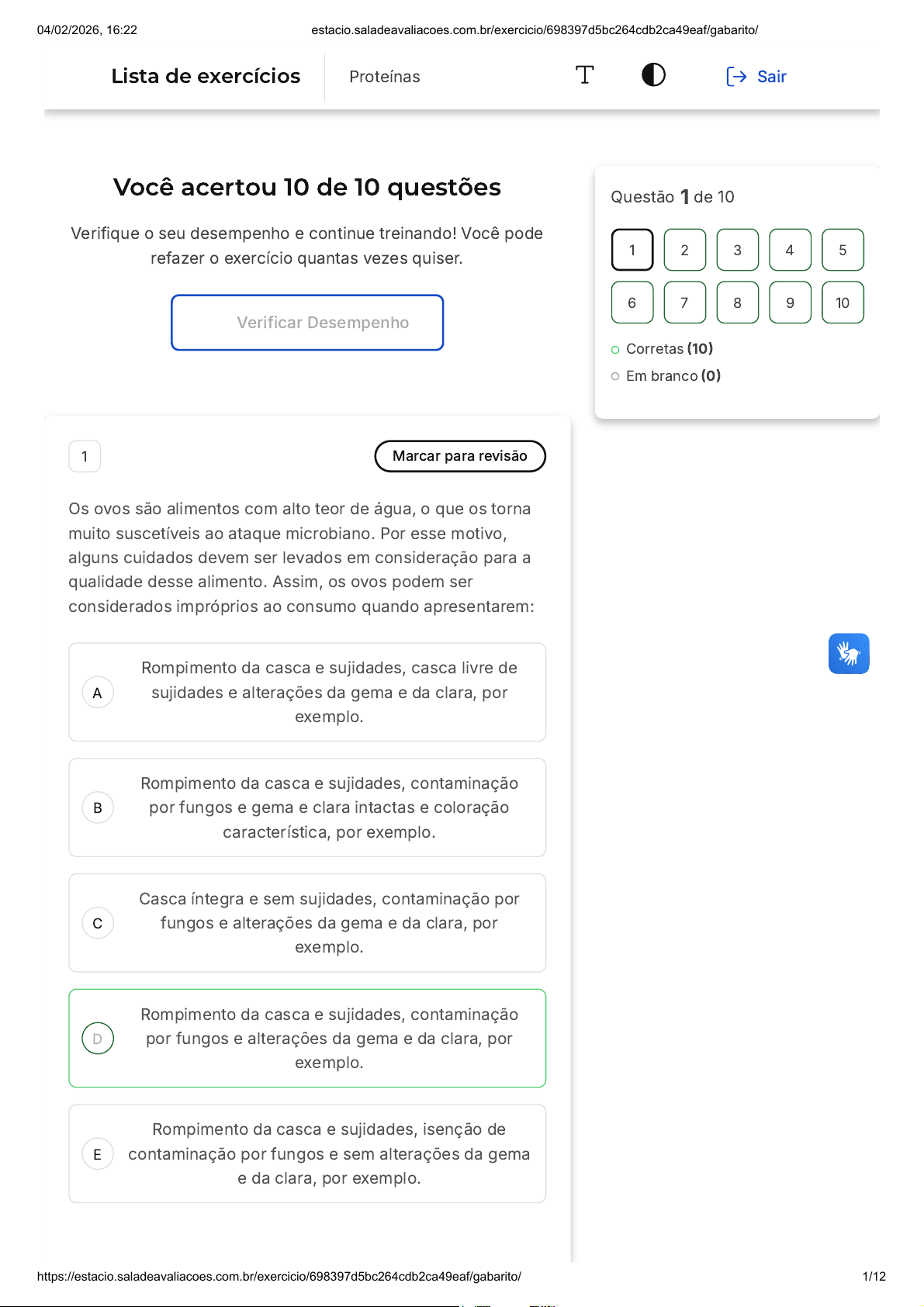 Você acertou 10 de 10 questões Verifique o seu desempenho e continue treinando! Você pode refazer o exercício quantas vezes quiser. Verificar Desempenho A B C D E 1 Marcar para revisão Os ovos são alimentos com alto teor de água, o que os torna muito suscetíveis ao ataque microbiano. Por esse motivo, alguns cuidados devem ser levados em consideração para a qualidade desse alimento. Assim, os ovos podem ser considerados impróprios ao consumo quando apresentarem: Rompimento da casca e sujidades, casca livre de sujidades e alterações da gema e da clara, por exemplo. Rompimento da casca e sujidades, contaminação por fungos e gema e clara intactas e coloração característica, por exemplo. Casca íntegra e sem sujidades, contaminação por fungos e alterações da gema e da clara, por exemplo. Rompimento da casca e sujidades, contaminação por fungos e alterações da gema e da clara, por exemplo. Rompimento da casca e sujidades, isenção de contaminação por fungos e sem alterações da gema e da clara, por exemplo. Questão 1 de 10 Corretas (10) Em branco (0) 1 2 3 4 5 6 7 8 9 10 Lista de exercícios Proteínas Sair 04/02/2026, 16:22 estacio.saladeavaliacoes.com.br/exercicio/698397d5bc264cdb2ca49eaf/gabarito/ https://estacio.saladeavaliacoes.com.br/exercicio/698397d5bc264cdb2ca49eaf/gabarito/ 1/12 A B C D E Resposta correta Parabéns, você selecionou a alternativa correta. Confira o gabarito comentado! Gabarito Comentado Conforme abordado no conteúdo, os ovos são alimentos altamente perecíveis devido à grande quantidade de água que contêm. Portanto, existem algumas normas que determinam se este alimento é adequado ou não para o consumo. Nesse sentido, de acordo com o estabelecido na legislação, algumas das características que tornam os ovos impróprios para o consumo são o rompimento da casca e a presença de sujidades, a contaminação por fungos e as alterações na gema e na clara. 2 Marcar para revisão A qualidade do leite pode ser avaliada através da análise enzimática presente no leite. Em relação às análises de peroxidase e fosfatase, marque a alternativa correta. A presença de peroxidase no leite é um indicativo de contaminação microbiana. A presença de peroxidase no leite é um indicativo de que o leite foi pasteurizado de forma incorreta. A presença de fosfatase é um indicativo de que o processo de pasteurização não foi realizado corretamente. A presença de fosfatase é um indicativo de que o processo de pasteurização foi excessivo. Ambas enzimas não devem estar presentes no leite pasteurizado. Resposta correta 04/02/2026, 16:22 estacio.saladeavaliacoes.com.br/exercicio/698397d5bc264cdb2ca49eaf/gabarito/ https://estacio.saladeavaliacoes.com.br/exercicio/698397d5bc264cdb2ca49eaf/gabarito/ 2/12 A B C Parabéns, você selecionou a alternativa correta. Confira o gabarito comentado! Gabarito Comentado A análise enzimática do leite é uma ferramenta importante para avaliar a qualidade do leite e a eficácia do processo de pasteurização. A presença da enzima peroxidase no leite pasteurizado é um indicativo positivo, pois essa enzima é destruída em temperaturas mais altas que as utilizadas no processo de pasteurização. Portanto, se a peroxidase estiver ausente, isso pode indicar que o tratamento térmico foi excessivo. Por outro lado, a enzima fosfatase não deve estar presente no leite pasteurizado, pois o processo de pasteurização é suficiente para degradá-la. Se a fosfatase for detectada no leite pasteurizado, isso indica que o processo de pasteurização não foi realizado corretamente. Portanto, a alternativa correta é a C: "A presença de fosfatase é um indicativo de que o processo de pasteurização não foi realizado corretamente". 3 Marcar para revisão A prova de determinação de anidrido sulfuroso e sulfitos pode ser realizada de duas formas: mistura da amostra com HCl concentrado e dicromato de potássio ou solução de verde malaquita. Sobre a prova de sulfito pela metodologia de verde malaquita, marque a alternativa correta. A solução de verde malaquita é uma solução indicadora que revela a presença de sulfito caso ocorra descoramento. A solução de verde malaquita é uma solução indicadora que revela a presença de sulfito caso ocorra coloração verde. A solução de verde malaquita é uma solução indicadora que revela o estado de putrefação da carne. 04/02/2026, 16:22 estacio.saladeavaliacoes.com.br/exercicio/698397d5bc264cdb2ca49eaf/gabarito/ https://estacio.saladeavaliacoes.com.br/exercicio/698397d5bc264cdb2ca49eaf/gabarito/ 3/12 D E A B C A solução de verde malaquita é uma solução indicadora que revela a presença de microrganismos na carne. A solução de verde malaquita é uma solução indicadora que revela o pH alcalino da carne. Resposta correta Parabéns, você selecionou a alternativa correta. Confira o gabarito comentado! Gabarito Comentado A metodologia de verde malaquita para a prova de sulfito é uma análise qualitativa que verifica a presença de sulfito, uma substância capaz de ocultar o estado de putrefação da carne. A análise é conduzida aplicando-se uma substância indicadora, o verde malaquita, em três diferentes pontos da carne. Se houver um descoramento dessa substância, isso indica a presença de sulfito. Portanto, a alternativa correta é a "A", que afirma que a solução de verde malaquita é uma solução indicadora que revela a presença de sulfito caso ocorra descoramento. 4 Marcar para revisão A prova de cocção é uma análise físico-química utilizada para avaliar a qualidade das carnes. Sobre esta análise, marque a alternativa correta. O odor forte e característico é o parâmetro mais importante. A limpidez do caldo de cozimento é o parâmetro mais importante. A cor do caldo de cozimento é o parâmetro mais importante. 04/02/2026, 16:22 estacio.saladeavaliacoes.com.br/exercicio/698397d5bc264cdb2ca49eaf/gabarito/ https://estacio.saladeava