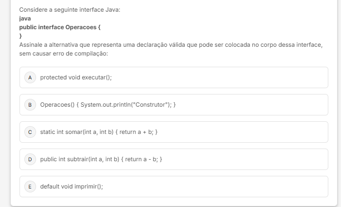 Considere a seguinte interface Java: java public interface Operacoes { } Assinale a alternativa que representa uma declaração que pode ser colocada no corpo dessa interface, sem causar erro de compilação: A protected void executar(); B Operacoes() { System.out.printin("Construtor"); } C static int somar(int a, int b) { return a + b; } D public int subtrair(int a, int b) return a - b; E default void imprimir();