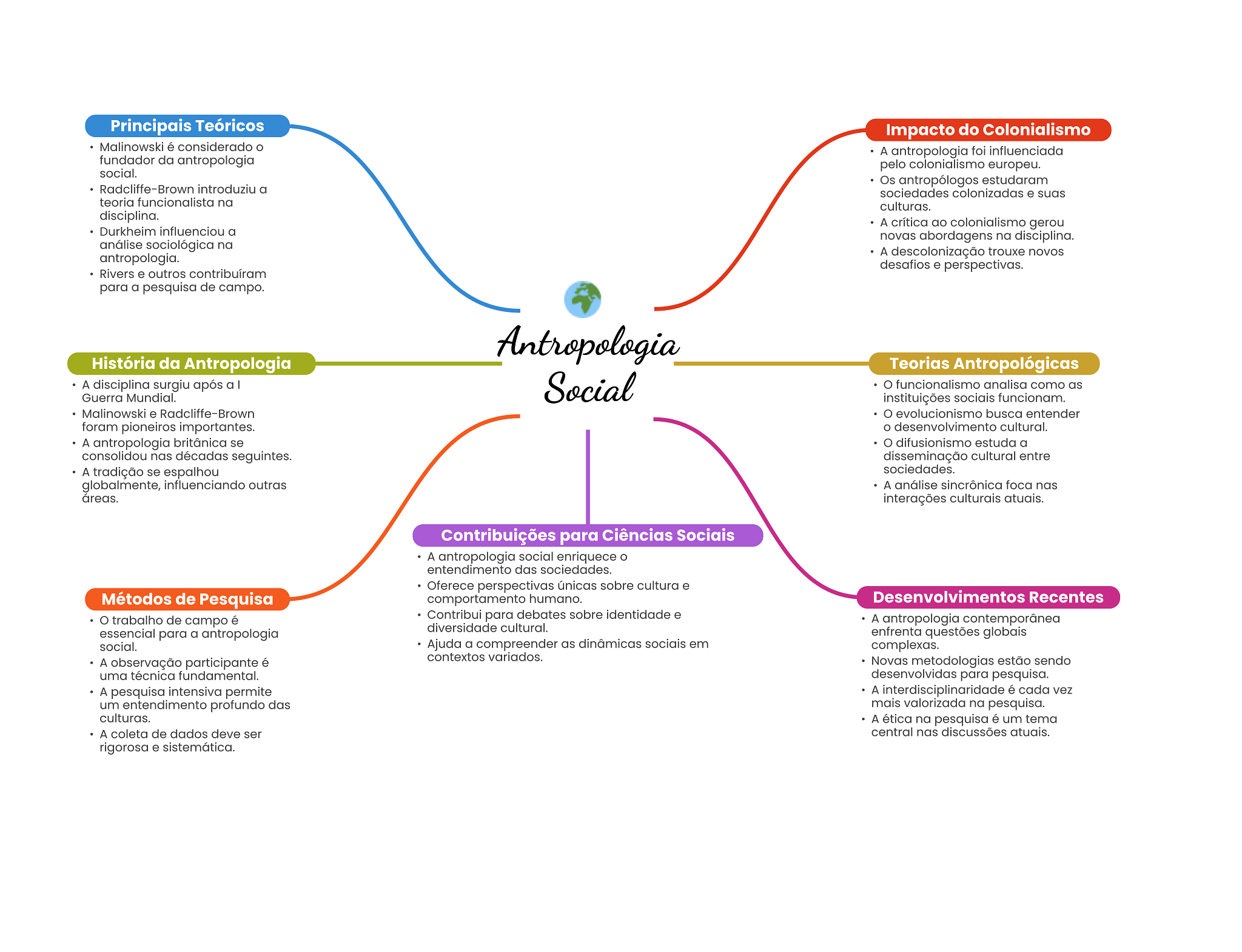 Principais Teóricos Impacto do Colonialismo Malinowski é considerado A antropologia foi influenciada fundador da antropologia pelo colonialismo europeu. social. Os antropólogos estudaram Radcliffe-Brown introduziu a sociedades colonizadas e suas teoria funcionalista na culturas. disciplina. A crítica ao colonialismo gerou Durkheim influenciou a novas abordagens na disciplina. análise sociológica na antropologia. A descolonização trouxe novos desafios e perspectivas. Rivers e outros contribuíram para a pesquisa de campo. Antropologia História da Antropologia Teorias Antropológicas A disciplina surgiu após a Guerra Mundial. Social funcionalismo analisa como as instituições sociais funcionam. Malinowski e Radcliffe-Brown evolucionismo busca entender foram pioneiros importantes. desenvolvimento cultural. A antropologia britânica se difusionismo estuda a consolidou nas décadas seguintes. disseminação cultural entre A tradição se espalhou sociedades. globalmente, influenciando outras A análise sincrônica foca nas áreas. interações culturais atuais. Contribuições para Ciências Sociais A antropologia social enriquece O entendimento das sociedades. Oferece perspectivas únicas sobre cultura e Métodos de Pesquisa comportamento humano. Desenvolvimentos Recentes trabalho de campo é Contribui para debates sobre identidade e A antropologia contemporânea diversidade cultural. essencial para a antropologia enfrenta questões globais social. Ajuda a compreender as dinâmicas sociais em complexas. contextos variados. A observação participante é Novas metodologias estão sendo uma técnica fundamental. desenvolvidas para pesquisa. A pesquisa intensiva permite A interdisciplinaridade é cada vez um entendimento profundo das mais valorizada na pesquisa. culturas. A ética na pesquisa é um tema A coleta de dados deve ser central nas discussões atuais. rigorosa e sistemática.