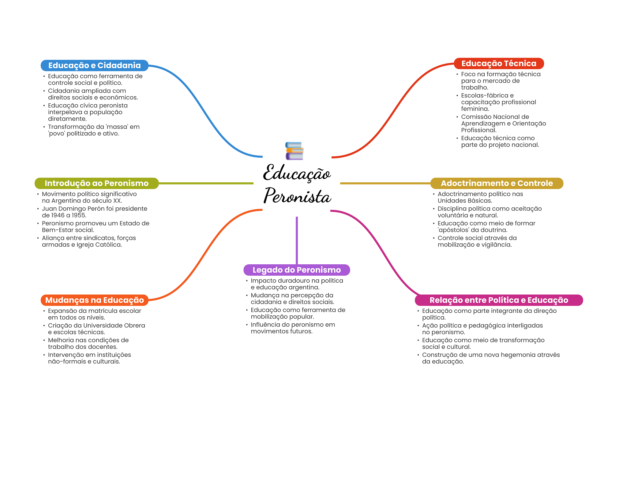 Educação e Cidadania Educação Técnica Educação como ferramenta de Foco na formação técnica controle social e político. para mercado de trabalho. Cidadania ampliada com direitos sociais e econômicos. Escolas-fábrica e Educação cívica peronista capacitação profissional feminina. interpelava a população diretamente. Comissão Nacional de Transformação da 'massa' em Aprendizagem e Orientação Profissional. 'povo' politizado e ativo. Educação técnica como parte do projeto nacional. Educação Introdução ao Peronismo e Controle Movimento político significativo Peronista Adoctrinamento político nas na Argentina do século XX. Unidades Básicas. Juan Domingo Perón foi presidente Disciplina política como aceitação de 1946 a 1955. voluntária e natural. Peronismo promoveu um Estado de Educação como meio de formar Bem-Estar social. da doutrina. Aliança entre sindicatos, forças Controle social através da armadas e Igreja Católica. mobilização e vigilância. Legado do Peronismo Impacto duradouro na política e educação argentina. Mudança na percepção da Mudanças na Educação cidadania e direitos sociais. Relação entre Política e Educação Expansão da matrícula escolar Educação como ferramenta de Educação como parte integrante da direção em todos níveis. mobilização popular. política. Criação da Universidade Obrera Influência do peronismo em Ação política e pedagógica interligadas e escolas técnicas. movimentos futuros. no peronismo. Melhoria nas condições de Educação como meio de transformação trabalho dos docentes. social e cultural. Intervenção em instituições Construção de uma nova hegemonia através não-formais e culturais. da educação.