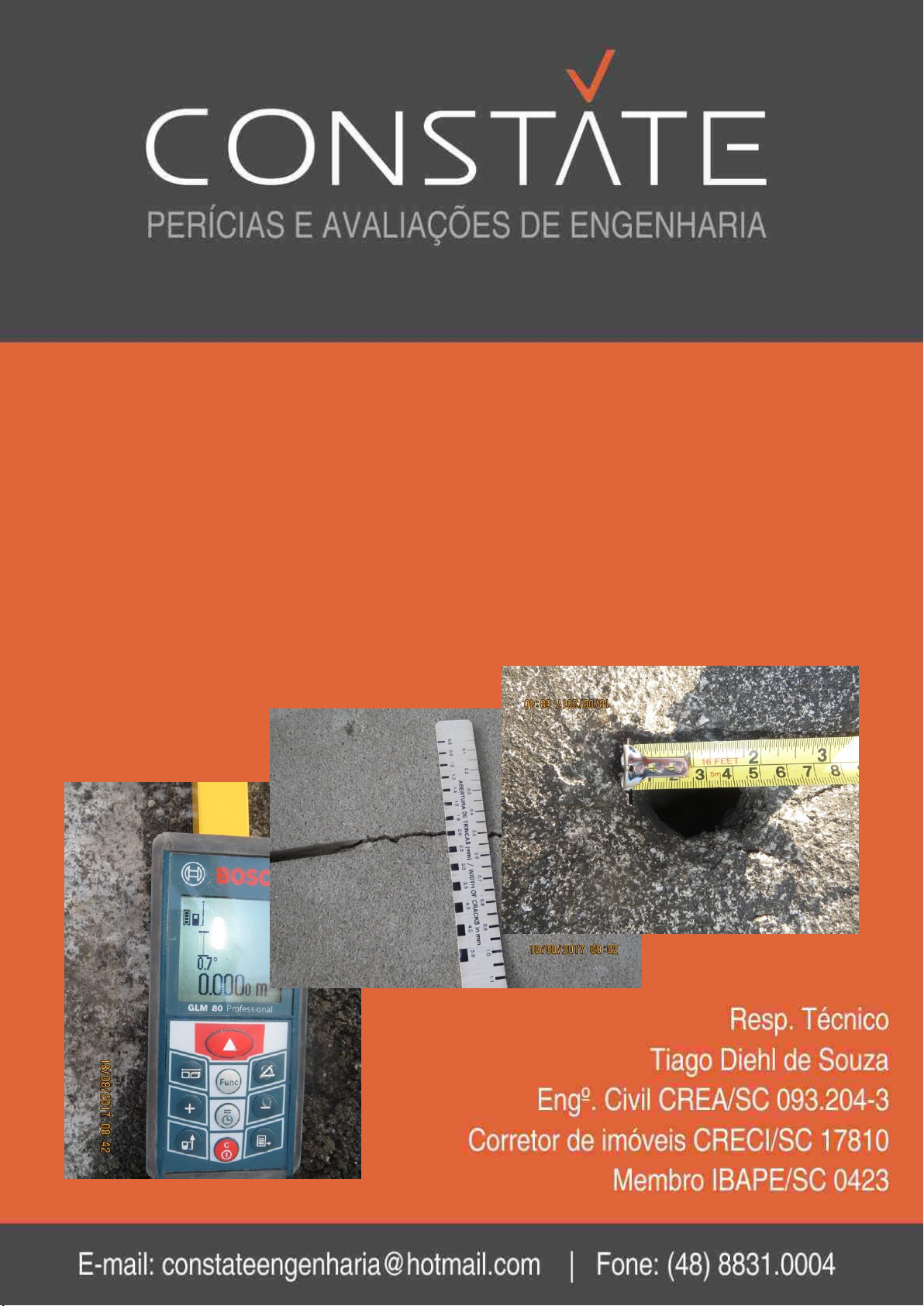 LAUDO DE INSPEÇÃO PREDIAL REQUERENTE: Condomínio do Edifício Residencial City. OBJETO: Edifício Residencial City, localizado na Rua Professora Nívea Cunha Bacha, n° 55, Centro– Araranguá/SC. CONSTATEENGENHARIA@HOTMAIL.COM – CRICIÚMA / SC – 48 98831.0004 2 SUMÁRIO 01. REQUERENTE: ............................................................................................ 3 02. OBJETO DA VISTORIA..................................................................................3 03. CLASSIFICAÇÃO DO BEM QUANTO AO TIPO: .......................................... 3 04. CLASSIFICAÇÃO DO BEM QUANTO AO USO: .......................................... 3 05. OBJETIVO: .................................................................................................... 4 06. CRITÉRIOS, METODOLOGIA E PROCEDIMENTOS EMPREGADOS: ....... 4 07. HORIZONTE TEMPORAL DAS DILIGÊNCIAS: ............................................ 5 08. RESPONSABILIDADES: ............................................................................... 5 09. CLASSIFICAÇÃO DA INSPEÇÃO PREDIAL ................................................ 5 10. CRITÉRIOS E ATIVIDADES REALIZADAS: ................................................. 5 11. CARACTERISTICAS DO IMÓVEL: ............................................................... 6 12. VISTORIA “IN LOCO”:................................................................................... 7 13. ANÁLISE DAS DOCUMENTAÇÕES (ANAMNESE) : ................................. 7 14. REGISTRO DE OCORRÊNCIAS: ............................................................... 11 15. MANIFESTAÇÕES PATOLÓGICAS DETECTADAS: ................................. 13 16. RECOMENDAÇÕES E ORIGENS DAS MANIFESTAÇÕES PATOLÓGICAS: ........................................................................................................................ 170 17. ORDEM DE PRIORIDADES: .................................................................... 174 18. ESTADO DE CONSERVAÇÃO GERAL DO EMPREENDIMENTO: ......... 177 19. RECUPERAÇÃO DAS MANIFESTAÇÕES PATOLÓGICAS: .................. 178 20. CONCLUSÕES: ........................................................................................ 190 21. CONSIDERAÇÕES FINAIS: ..................................................................... 191 CONSTATEENGENHARIA@HOTMAIL.COM – CRICIÚMA / SC – 48 98831.0004 3 01. REQUERENTE: Condomínio Residencial City, localizado na Rua Professora Nívea Cunha Bacha, n°55, Centro, Araranguá/SC. 02. OBJETO DA VISTORIA: Empreendimento sito a Rua Professora Nívea Cunha Bacha, n°55, Centro, Araranguá/SC (localização anexo 01). Imagem 01 03. CLASSIFICAÇÃO DO BEM QUANTO AO TIPO: Residencial. 04. CLASSIFICAÇÃO DO BEM QUANTO AO USO: Residencial. Imagem 01: Vista aérea do empreendimento (drone). CONSTATEENGENHARIA@HOTMAIL.COM – CRICIÚMA / SC – 48 98831.0004 4 05. OBJETIVO: O objetivo do presente laudo é fornecer subsídios ao contratante através da realização de Inspeção Técnica do atual estado de conservação do empreendimento acima identificado, em todos os seus aspectos, apresentando as questões vinculadas à engenharia civil. Além disso, objetiva-se apurar as causas presentes no mesmo e apresentar soluções de reparação das manifestações patológicas presentes. 06. CRITÉRIOS, METODOLOGIA E PROCEDIMENTOS EMPREGADOS: A execução do presente trabalho procurou balizar-se nas diretrizes e recomendações contidas em normas técnicas nacionais consagradas, em especial a NBR – 13.752 (Norma Brasileira Para Perícias de Engenharia na Construção Civil) da ABNT – Associação Brasileira de Normas Técnicas, sem prejuízo à consulta também, em tudo aquilo que se mostrou pertinente e aplicável, a outros dispositivos complementares legais e regulamentares, dentre os quais podemos destacar: - Código Civil – Lei nº 10.406 de 10/01/2002, que regulamenta a legislação aplicável às relações civis; - NBR – 5674(Manutenção de edificações – procedimentos, da ABNT – 2012); - NBR – 14.037(Manual de operações, uso e manutenção de edificações – Conteúdo e recomendações para elaboração e apresentação, da ABNT – 2011); - NBR – 9574 (Execução de impermeabilização, da ABNT – 2008); - NBR – 7200 (Procedimentos de execução de revestimentos, da ABNT – 1998); - NBR – 13.245 (Execução de pinturas em edificações não industriais, da ABNT – 2011); - NBR – 15.079 (Tintas para construção civil, da ABNT-2011); - NBR – 13.816 (Placas cerâmicas para revestimentos, da ABNT – 1997); - NBR – 14.294 (Forros e revestimentos, da ABNT – 1999); - NBR – 6118(Projetos de estrutura de concreto, da ABNT –2007 ); - NBR – 13.753 (Revestimentos de pisos internos ou externos, com placas cerâmicas e com utilização de argamassa colante – Procedimentos, da ABNT - 1996 ); - NBR – 5410 (Instalações Elétricas de Baixa Tensão, da ABNT - 2004); - NBR-5626 ( Instalação predial de água fria, da ABNT - 1998); - NBR-5648 (Tubos de PVC rígido para instalações prediais de água fria - Especificação, da ABNT - 2010); - NBR-5688 (Tubo e conexão de PVC rígido para esgoto predial e ventilação da ABNT - 2010); - NBR-8160( Instalação predial de esgoto sanitário, da ABNT - 1999); - NBR-10844 ( Instalações prediais de águas pluviais , da ABNT - 1999); CONSTATEENGENHARIA@HOTMAIL.COM – CRICIÚMA / SC – 48 98831.0004 5 07. HORIZONTE TEMPORAL DAS DILIGÊNCIAS: O presente trabalho de campo foi desenvolvido no empreendimento em referência, no dia 18 de agosto de 2017, transcorrendo a partir daquele primeiro dia, até a presente data, todas as demais etapas operacionais pertinentes, o que abrangeu desde as primeiras vistorias, catalogamento das anomalias e discrepâncias eventualmente detectadas, relatório fotográfico, análise e processamento dos dados colhidos, até a elaboração final propriamente dita do laudo. 08. R