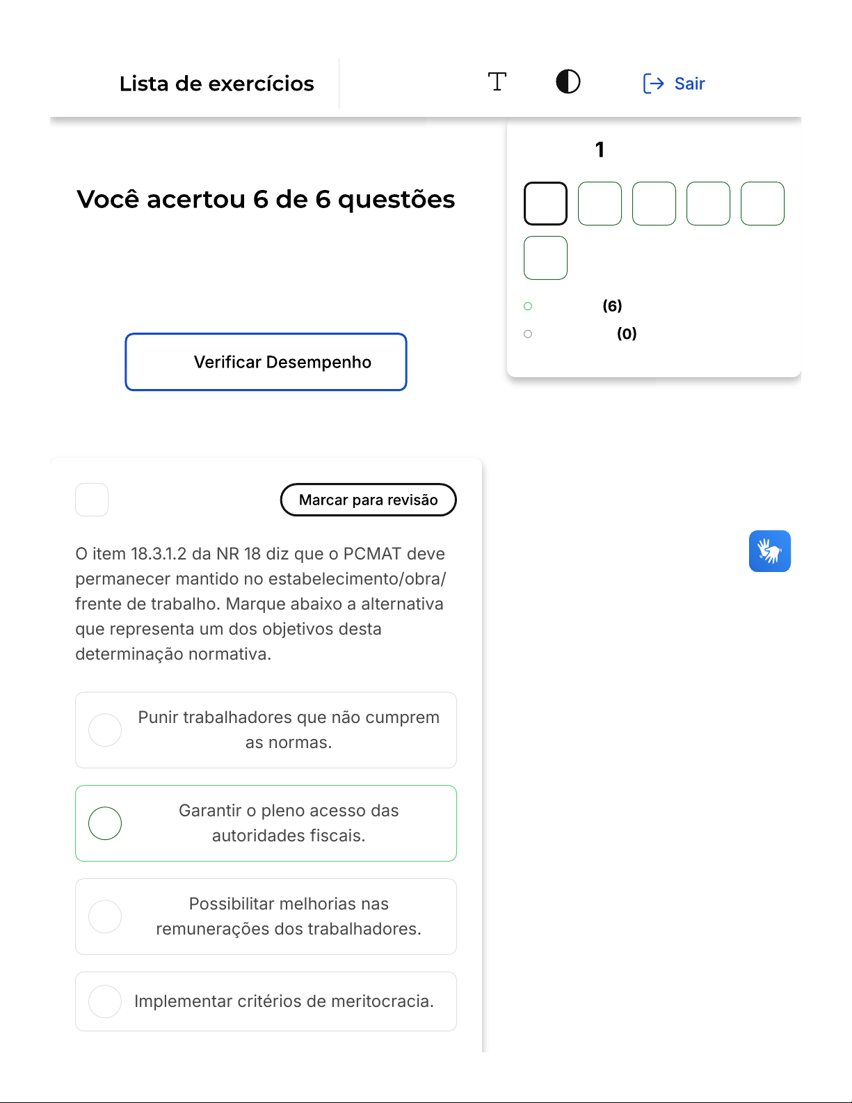 Verifique o seu desempenho e continue treinando! Você pode refazer o exercício quantas vezes quiser. A B C D 1 O item 18.3.1.2 da NR 18 diz que o PCMAT deve permanecer mantido no estabelecimento/obra/ frente de trabalho. Marque abaixo a alternativa que representa um dos objetivos desta determinação normativa. Punir trabalhadores que não cumprem as normas. Garantir o pleno acesso das autoridades fiscais. Possibilitar melhorias nas remunerações dos trabalhadores. Implementar critérios de meritocracia. Questão de 6 Corretas Em branco 1 2 3 4 5 6 Segurança … Firefox https://estacio.saladeavaliacoes.com.br/exercicio/697ebd9a9adba66e2f... 1 of 8 31/01/2026, 23:59 E A B C Garantir a emissão de comunicações de acidentes de trabalho. Parabéns, você selecionou a alternativa correta. Confira o gabarito comentado! Garantir o pleno acesso das autoridades fiscais é um dos objetivos do item 18.3.1.2 da NR 18. 2 Marque abaixo a única opção incorreta quanto ao uso dos equipamentos de proteção individual. Proteção para a Cabeça: Máscara para soldador, Protetor Facial, Capacete, e, Óculos de segurança. Proteção para membros superiores: Mangas de raspa, Luvas de segurança, e, Cremes de proteção. Proteção para membros inferiores: Calçados de segurança, Perneira de raspa, e, bota de borracha. Firefox https://estacio.saladeavaliacoes.com.br/exercicio/697ebd9a9adba66e2f... 2 of 8 31/01/2026, 23:59 D E Proteção Auditiva: Protetor tipo concha acoplado ao capacete e Protetor auricular plug e, Protetor tipo concha. Proteção para o Tronco: Respirador sem manutenção e Respirador com manutenção. Parabéns, você selecionou a alternativa correta. Confira o gabarito comentado! Respiradores não configuram proteção para o tronco. 3 Os trabalhos manuais ou corporais repetitivos, as posturas inadequadas com longa duração, os esforços físicos intensos na sustentação e/ ou movimentação de cargas pesadas e trabalhos sob condições ambientais adversas (calor, frio, umidade, ventilação natural deficiente e iluminação insuficiente), são atividades com exposições característicos dos riscos ergonômicos. Marque abaixo a opção em que o trabalhador poderá se afastar por longo tempo de suas atividades, por uma doença ou lesão decorrente desta exposição ocupacional. Firefox https://estacio.saladeavaliacoes.com.br/exercicio/697ebd9a9adba66e2f... 3 of 8 31/01/2026, 23:59 A B C D E Doenças respiratórias. Acidentes perfurantes. Lombalgia. Pneumoconiose. Asbestose. Parabéns, você selecionou a alternativa correta. Confira o gabarito comentado! A lombalgia pode ter origem em aspectos ergonômicos e causar o afastamento do trabalhador de suas atividades laborais por longos períodos. 4 Marque abaixo a única alternativa que não corresponde as medidas preventivas que venham a reduzir as doenças ocupacionais nos canteiros de obras. Firefox https://estacio.saladeavaliacoes.com.br/exercicio/697ebd9a9adba66e2f... 4 of 8 31/01/2026, 23:59 A B C D E Treinar e capacitar seus trabalhadores constantemente. Garantir a implementação e plena função da CIPA �Comissão Interna de Prevenção de Acidentes). Punir trabalhadores por não utilizarem seus equipamentos individuais. As supervisões nos postos de trabalho devem garantir um ambiente seguro e que os trabalhadores sigam as regras de segurança. A NR 24, especialmente, deve ser seguida, com alojamentos adequados, mictórios, lava olhos, lacais adequados para alimentações etc. Parabéns, você selecionou a alternativa correta. Confira o gabarito comentado! A punição de trabalhadores pelaausência do uso de EPI não constitui medida preventiva às doenças ocupacionais nos canteiros de obras. Firefox https://estacio.saladeavaliacoes.com.br/exercicio/697ebd9a9adba66e2f... 5 of 8 31/01/2026, 23:59 A B C D E 5 Como sabemos o PCMAT � Programa de Condições e Meio Ambiente de Trabalho é um importante documento para que tenhamos um ambiente de trabalho seguro, especialmente os canteiros de obras. Várias são as Normas Regulamentadoras que atuam em conjunto com o PCMAT � NR18, sempre no sentido de proteção dos trabalhadores e, consequentemente, por um ambiente mais seguro. Marque abaixo, a única Norma Regulamentadora que não é relacionada ao PCMAT� NR 9 � PPRA. NR 7 � PCMSO. NR 6 � EPI. NR 5 � CIPA. NR 32 � Serviços de Saúde. Parabéns, você selecionou a alternativa correta. Confira o gabarito comentado! A NR 32 � Serviços de Saúde é a Norma Firefox https://estacio.saladeavaliacoes.com.br/exercicio/697ebd9a9adba66e2f... 6 of 8 31/01/2026, 23:59 A B C D E citada que não possui relação com o PCMAT. 6 Em relação aos procedimentos de segurança para os andaimes suspensos motorizados, marque a única alternativa incorreta de acordo com a NR 18 que trata do PCMAT. A plataforma parada em altura deverá permitir a descida segura até o ponto de apoio inferior sempre que acionado. O conjunto motor deve possuir dispositivo mecânico de emergência automaticamente acionado em caso de pane elétrica. O equipamento deve ser desligado e protegido quando fora de serviço. Deve haver dispositivo que impeça a movimentação sob inclinações superiores a 30º. Os andaimes suspensos motorizados devem ser providos de aterramento elétrico. Parabéns, você selecionou a Firefox https://estacio.saladeavaliacoes.com.br/exercicio/697ebd9a9adba66e2f... 7 of 8 31/01/2026, 23:59 alternativa correta. Confira o gabarito comentado! A NR 18, que trata do PCMAT, determina que os andaimes suspensos motorizados devem possuir dispositivo que impeça a movimentação sob inclinações superiores a 15º. Firefox https://estacio.saladeavaliacoes.com.br/exercicio/697ebd9a9adba66e2f... 8 of 8 31/01/2026, 23:59
