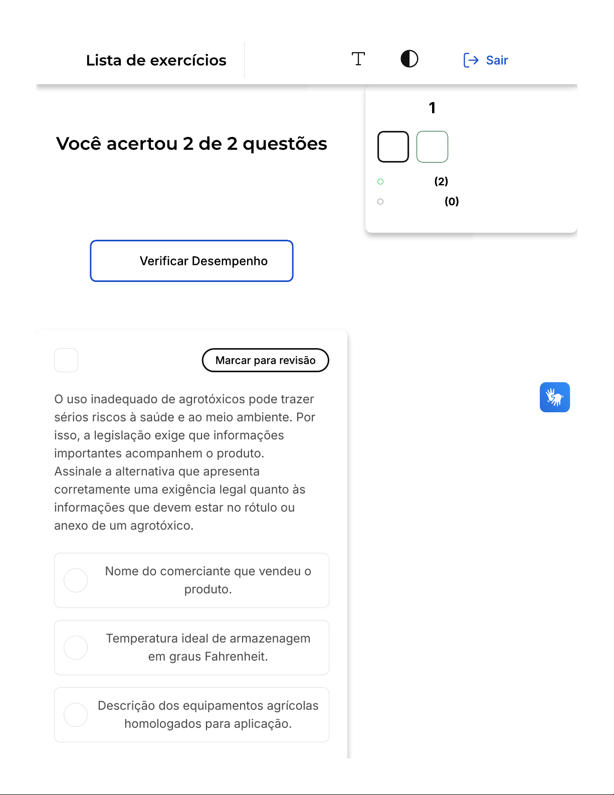 Verifique o seu desempenho e continue treinando! Você pode refazer o exercício quantas vezes quiser. A B C 1 O uso inadequado de agrotóxicos pode trazer sérios riscos à saúde e ao meio ambiente. Por isso, a legislação exige que informações importantes acompanhem o produto. Assinale a alternativa que apresenta corretamente uma exigência legal quanto às informações que devem estar no rótulo ou anexo de um agrotóxico. Nome do comerciante que vendeu o produto. Temperatura ideal de armazenagem em graus Fahrenheit. Descrição dos equipamentos agrícolas homologados para aplicação. Questão de 2 Corretas Em branco 1 2 Conteúdo Firefox https://estacio.saladeavaliacoes.com.br/exercicio/6982a09bbc264cdb2c... 1 of 4 03/02/2026, 22:29 D E Indicação das culturas permitidas, pragas-alvo e dosagem recomendada. Custo médio de aplicação por hectare, calculado pelo fabricante. Parabéns, você selecionou a alternativa correta. Confira o gabarito comentado! Conforme a legislação vigente, os agrotóxicos devem trazer, impressas ou anexadas às embalagens, informações obrigatórias sobre: as culturas autorizadas para aplicação do produto, as pragas-alvo que o produto é indicado para controlar, e as dosagens recomendadas para cada situação. Essas informações são essenciais para garantir a eficácia agronômica, a segurança do trabalhador rural e a proteção ao meio ambiente, assegurando o uso racional e seguro do produto químico. 2 As chamadas bactérias fixadoras das raízes de certas leguminosas são úteis à agricultura Firefox https://estacio.saladeavaliacoes.com.br/exercicio/6982a09bbc264cdb2c... 2 of 4 03/02/2026, 22:29 A B C D E porque atuam sobre o solo, contribuindo para: aumentar a acidez. facilitar o arejamento revolver a terra. enriquecê-lo com sais nitrogenados. eliminar o humo. Parabéns, você selecionou a alternativa correta. Confira o gabarito comentado! As bactérias fixadoras das raízes de certas leguminosas são úteis à agricultura porque atuam sobre o solo, contribuindo para enriquecê-lo com sais nitrogenados. Firefox https://estacio.saladeavaliacoes.com.br/exercicio/6982a09bbc264cdb2c... 3 of 4 03/02/2026, 22:29 Firefox https://estacio.saladeavaliacoes.com.br/exercicio/6982a09bbc264cdb2c... 4 of 4 03/02/2026, 22:29