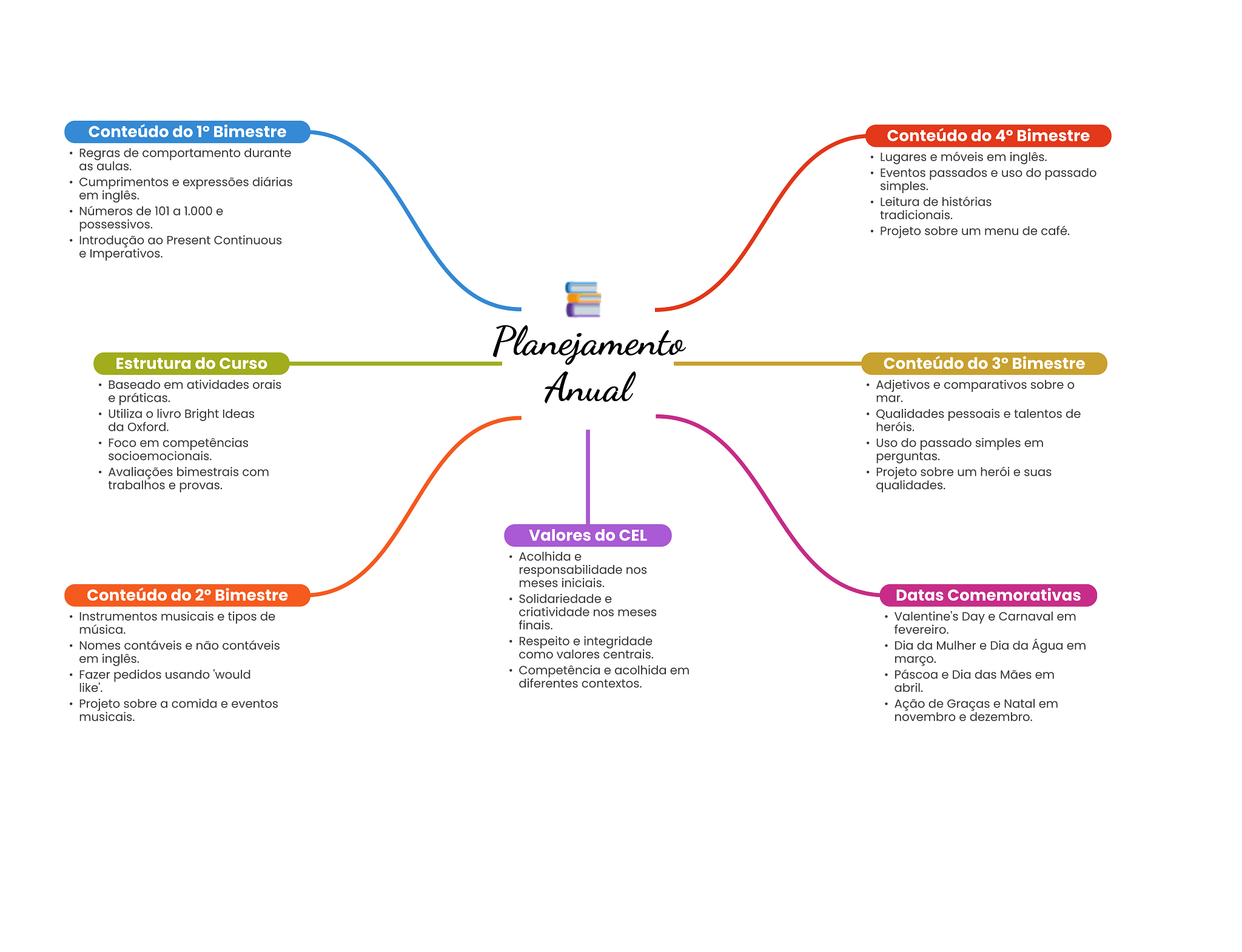 Conteúdo do 1° Bimestre Conteúdo do 4° Bimestre Regras de comportamento durante Lugares e móveis em inglês. as aulas. Eventos passados e uso do passado Cumprimentos e expressões diárias simples. em inglês. Leitura de histórias Números de 101 a 1.000 e tradicionais. possessivos. Projeto sobre um menu de café. Introdução ao Present Continuous e Imperativos. Planejamento Estrutura do Curso Conteúdo do 3° Bimestre Baseado em atividades orais e práticas. Anual Adjetivos e comparativos sobre O mar. Utiliza livro Bright Ideas Qualidades pessoais e talentos de da Oxford. heróis. Foco em competências Uso do passado simples em socioemocionais. perguntas. Avaliações bimestrais com Projeto sobre um herói e suas trabalhos e provas. qualidades. Valores do CEL Acolhida e responsabilidade nos meses iniciais. Conteúdo do 2° Bimestre Solidariedade e Datas Comemorativas Instrumentos musicais e tipos de criatividade nos meses Valentine's Day e Carnaval em música. finais. fevereiro. Nomes contáveis e não contáveis Respeito e integridade Dia da Mulher e Dia da Água em em inglês. como valores centrais. março. Fazer pedidos usando 'would Competência e acolhida em Páscoa e Dia das Mães em like'. diferentes contextos. abril. Projeto sobre a comida e eventos Ação de Graças e Natal em musicais. novembro e dezembro.