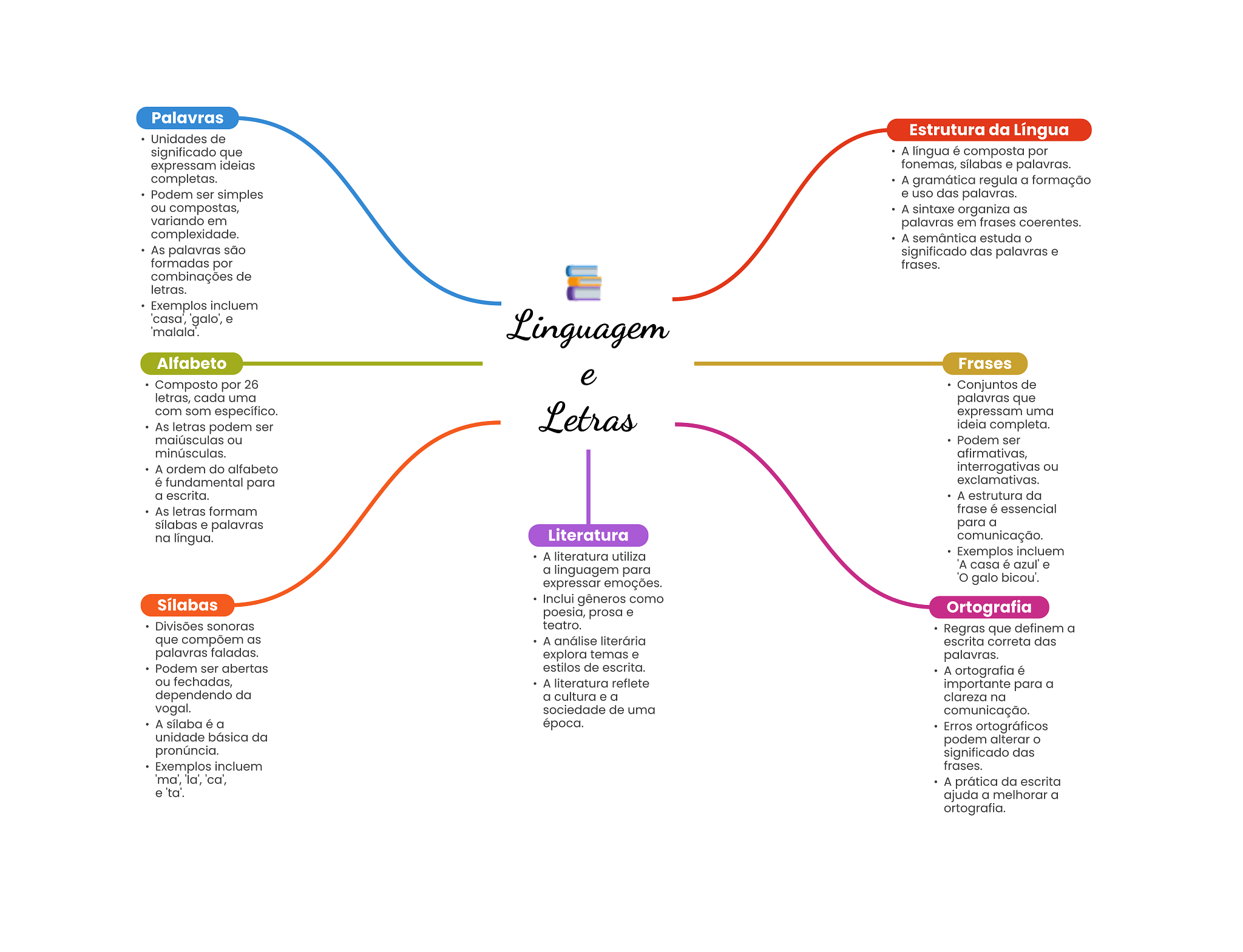 Palavras Estrutura da Língua Unidades de significado que A língua é composta por expressam ideias fonemas, sílabas e palavras. completas. A gramática regula a formação Podem ser simples e uso das palavras. ou compostas, A sintaxe organiza as variando em palavras em frases coerentes. complexidade. A semântica estuda O As palavras são significado das palavras e formadas por frases. combinações de letras. Exemplos incluem 'casa', 'galo', e 'malala'. Linguagem Alfabeto Frases e Composto por 26 Conjuntos de letras, cada uma palavras que com som específico. Letras expressam uma As letras podem ser ideia completa. maiúsculas ou Podem ser minúsculas. afirmativas, A ordem do alfabeto interrogativas ou é fundamental para exclamativas. a escrita. A estrutura da As letras formam frase é essencial sílabas e palavras para a na língua. Literatura comunicação. A literatura utiliza Exemplos incluem A casa é azul' e a linguagem para expressar emoções. galo bicou'. Sílabas Inclui gêneros como poesia, prosa e Ortografia Divisões sonoras teatro. Regras que definem a que compõem as A análise literária escrita correta das palavras faladas. explora temas e palavras. Podem ser abertas estilos de escrita. A ortografia é ou fechadas, A literatura reflete importante para a dependendo da a cultura e a clareza na vogal. sociedade de uma comunicação. A sílaba é a época. Erros ortográficos unidade básica da podem alterar pronúncia. significado das Exemplos incluem frases. 'ma', 'la', ca', A prática da escrita e 'ta'. ajuda a melhorar a ortografia.