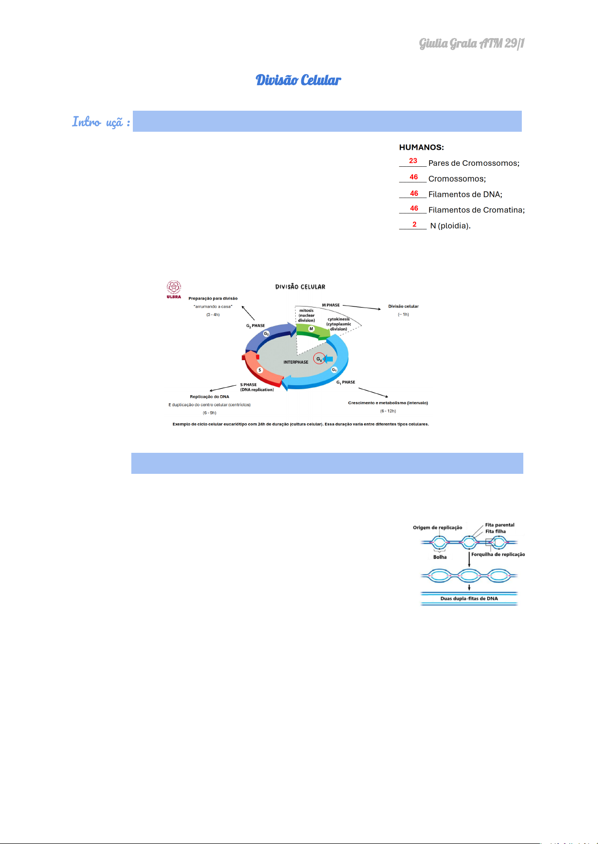 Giulia Grala ATM 29/1 Divisão Celular Introdução: …………………………………………………………………………………………………………………………………… - “Todos os organismos vivos, da bactéria unicelular ao mamífero multicelular, são produtos de repetidos ciclos de crescimento e divisão celular que remontam aos primórdios da vida na Terra, há mais de três bilhões de anos.” (Alberts); - Para que haja o crescimento de um organismo, a massa celular deve aumentar, duplicar/replicar o material genético e dividir as células igualmente, perpetuando o material genético intacto; Replicação: …………………………………………………………………….……………………………………………………………… - A replicação do DNA é o processo pelo qual uma célula faz uma cópia do seu DNA antes da divisão celular. Esse mecanismo garante que cada célula filha receba uma cópia idêntica do material genético; - A replicação é semiconservativa e semi-descontínua; - Precisa de uma origem de replicação para formar a forquilha de replicação; - Em eucariotos, a replicação começa em muitas origens de replicação espalhadas pelo cromossomo. - A síntese é sempre no sentido 5´→ 3´; - Necessita sempre de um primer (~11nts) para iniciar a adição de nucleotídeos; - As novas fitas são formadas pela adição de nucleotídeos usando as fitas como molde. -