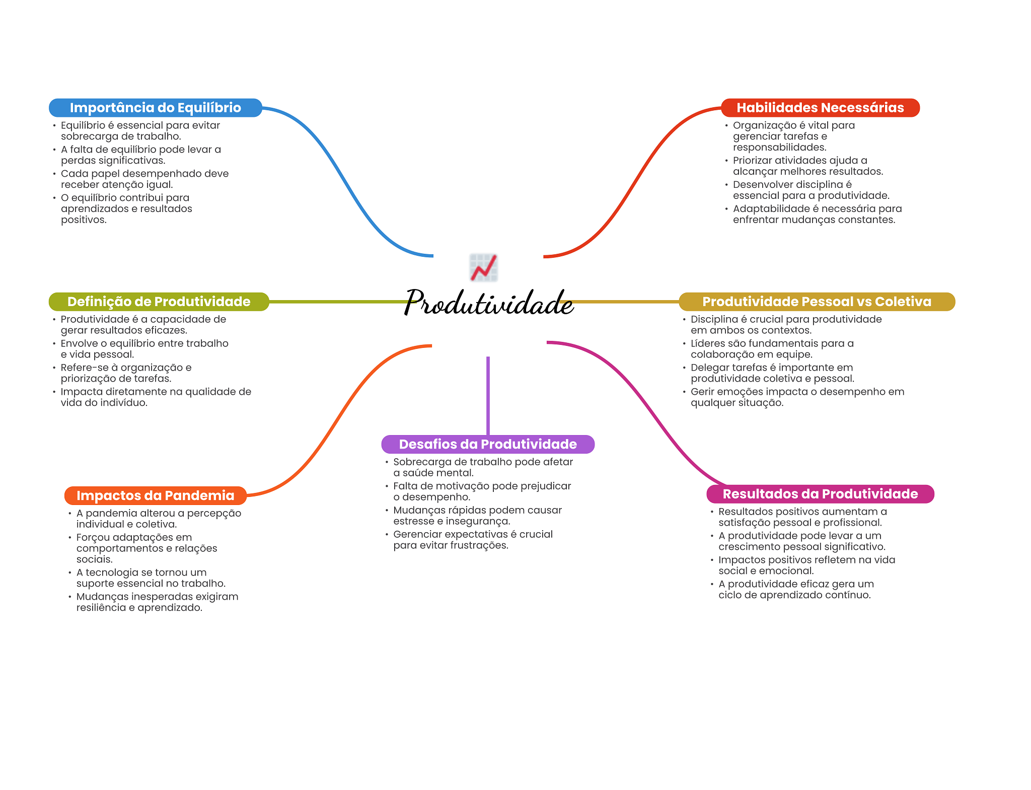 Importância do Equilíbrio Habilidades Necessárias Equilíbrio é essencial para evitar Organização é vital para sobrecarga de trabalho. gerenciar tarefas e A falta de equilíbrio pode levar a responsabilidades. perdas significativas. Priorizar atividades ajuda a Cada papel desempenhado deve alcançar melhores resultados. receber atenção igual. Desenvolver disciplina é equilíbrio contribui para essencial para a produtividade. aprendizados e resultados Adaptabilidade é necessária para positivos. enfrentar mudanças constantes. Definição de Produtividade Produtividade Produtividade Pessoal vs Coletiva Produtividade é a capacidade de Disciplina é crucial para produtividade gerar resultados eficazes. em ambos OS contextos. Envolve equilíbrio entre trabalho Líderes são fundamentais para a e vida pessoal. colaboração em equipe. Refere-se à organização e Delegar tarefas é importante em priorização de tarefas. produtividade coletiva e pessoal. Impacta diretamente na qualidade de Gerir emoções impacta desempenho em vida do indivíduo. qualquer situação. Desafios da Produtividade Sobrecarga de trabalho pode afetar a saúde mental. Falta de motivação pode prejudicar Impactos da Pandemia desempenho. Resultados da Produtividade A pandemia alterou a percepção Mudanças rápidas podem causar Resultados positivos aumentam a individual e coletiva. estresse e insegurança. satisfação pessoal e profissional. Forçou adaptações em Gerenciar expectativas é crucial A produtividade pode levar a um comportamentos e relações para evitar frustrações. crescimento pessoal significativo. sociais. Impactos positivos refletem na vida A tecnologia se tornou um social e emocional. suporte essencial no trabalho. A produtividade eficaz gera um Mudanças inesperadas exigiram ciclo de aprendizado contínuo. resiliência e aprendizado.