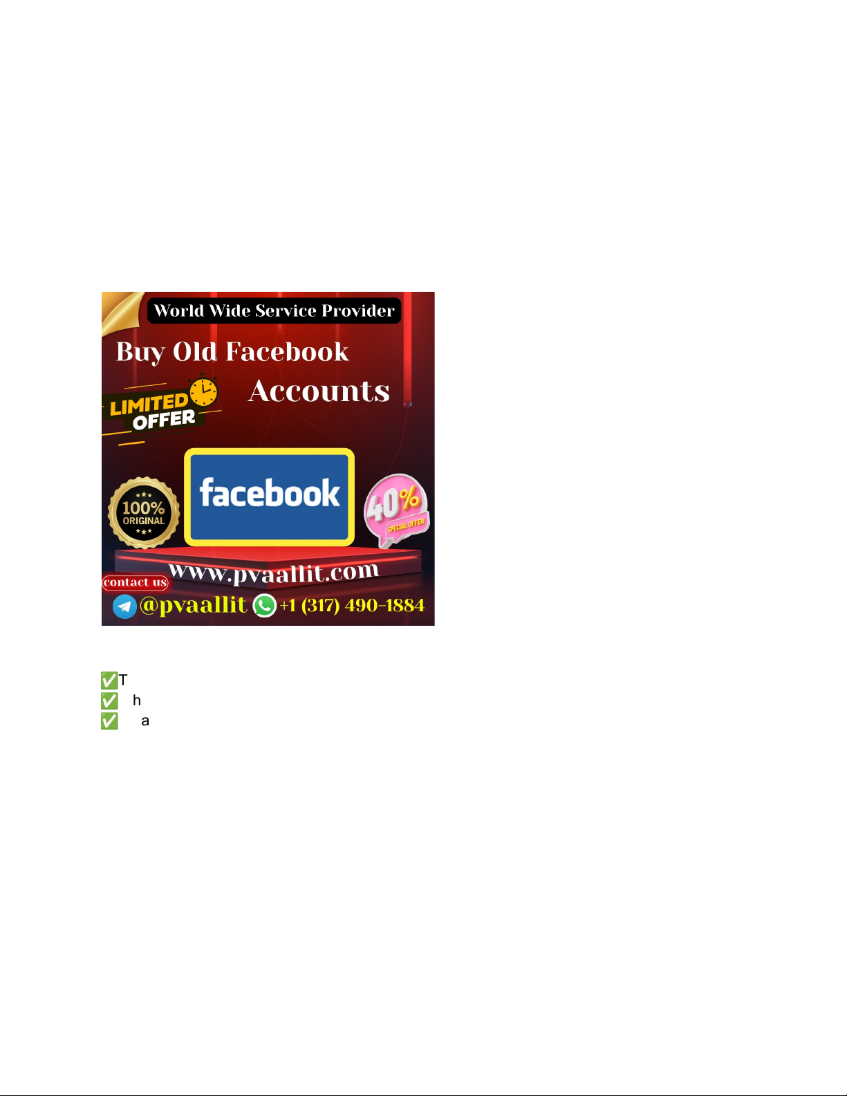 op Facebook Accounts (2026) Ultimate Guide for Learning and Life Skills Discover the top Facebook accounts (2026) for learning, skill development, and life benefits. Explore strategies, communication, and practical applications daily. If you want more information, just contact us now. 24 Hours Reply/Contact ✅Telegram:@pvaallit ✅WhatsApp:+1 (317) 490_1884 ✅Email:pvaallit@gmail.com Introduction Facebook continues to be one of the most influential social media platforms worldwide. In 2026, certain top accounts stand out not only for their reach but also for their educational value, practical applications, and real-life benefits. Studying these accounts allows learners to improve communication, content planning, community engagement, and personal branding. Observing how top accounts operate provides valuable insights into time management, digital literacy, and strategic thinking. These accounts model consistency in posting, thoughtful interactions, and audience engagement, teaching lessons applicable to professional projects, academic work, and personal growth. Guidance from trusted sources like pvaallit helps users identify Facebook accounts that provide meaningful learning opportunities. By analyzing successful accounts, learners can extract actionable strategies for organization, critical thinking, communication, and content strategy. This guide explores the significance of top Facebook accounts in 2026, highlighting their applications, learning outcomes, and life skills. Understanding Top Facebook Accounts and Their Educational Value What Are Top Facebook Accounts? Top Facebook accounts are profiles or pages that consistently provide high-quality content, maintain strong engagement with followers, and demonstrate effective communication and content strategy. They serve as models for organization, digital interaction, and community-building skills. Learning Outcomes ● Communication skills: Learn concise and impactful messaging. ● Digital literacy: Understand content credibility, audience analysis, and information dissemination. ● Organization and planning: Observe scheduling, content categorization, and workflow management. ● Critical thinking: Evaluate post engagement and decision-making patterns. Practical Applications of Facebook Accounts in Daily Life Enhancing Communication Top accounts model clear, professional, and engaging interactions. These strategies can improve personal and professional communication in emails, presentations, and group discussions. Improving Organization and Productivity Studying content calendars, group management, and multi-project handling offers lessons in personal productivity and task organization applicable to daily routines, school projects, or work assignments. Building Community Skills Many top accounts actively foster group engagement and meaningful discussions. Observing these interactions teaches collaboration, leadership, and teamwork skills that transfer to professional and academic settings. Life Skills Developed Through Top Facebook Accounts Personal Branding and Presentation Accounts with consistent visuals, voice, and messaging illustrate how to present oneself authentically and professionally online. Learners can apply these lessons to resumes, portfolios, and professional networks. Analytical Thinking Analyzing post performance, engagement, and audience behavior helps learners develop critical thinking and decision-making skills relevant in work, school, and personal projects. Strategic Planning and Goal Setting Top accounts plan content and interactions strategically. Observing these patterns supports goal-setting, prioritization, and execution skills applicable to projects and life planning. Case Studies: Learning from Top Facebook Accounts Case Study 1: Effective Content Scheduling A leading page posts consistently with a structured schedule. Learners can emulate this strategy to improve their time management and consistency in professional or personal projects. Case Study 2: Community Engagement A top group page encourages discussions, Q&A sessions, and interactive content. Observing these techniques teaches skills in teamwork, communication, and leadership. Case Study 3: Data-Driven Decision Making Top accounts track likes, shares, and comments to adjust strategies. Learners can apply this analytical approach to assess performance in projects, presentations, or study habits. Case Study 4: Personal Branding Through Content Accounts with consistent themes and visual identity demonstrate the importance of authenticity. Observing these accounts helps learners understand self-presentation and reputation management. Case Study 5: Multi-Project Organization Some top accounts manage multiple pages and groups simultaneously. Observing their methods provides lessons in prioritization, workflow management, and multitasking efficiency. Guided by pvaallit, these case studies demonstrate that top Facebook accounts can teach life skills far beyond social media. Step-by-Step Guide: Learning from Top Facebook Accounts Step 1: Identify Accounts to Follow ● Use pvaallit to locate accounts with high educational and organizational value. ● Focus on accounts with structured posting, active engagement, and thoughtful interactions. Step 2: Observe Patterns ● Track posting frequency, content themes, and interaction styles. ● Note audience engagement techniques and content presentation. Step 3: Analyze Strategy ● Study how accounts plan posts, manage communities, and respond to followers. ● Identify transferable strategies for planning, workflow, and communication. Step 4: Apply Lessons ● Implement structured schedules in your own projects, schoolwork, or professional tasks. ● Use engagement strategies to improve collaboration, communication, and leadership. ● Apply analytical methods to track and optimize personal or work outcomes. Step 5: Reflect and Adjust ● Review the effectiveness of applied strategies. ● Adjust methods